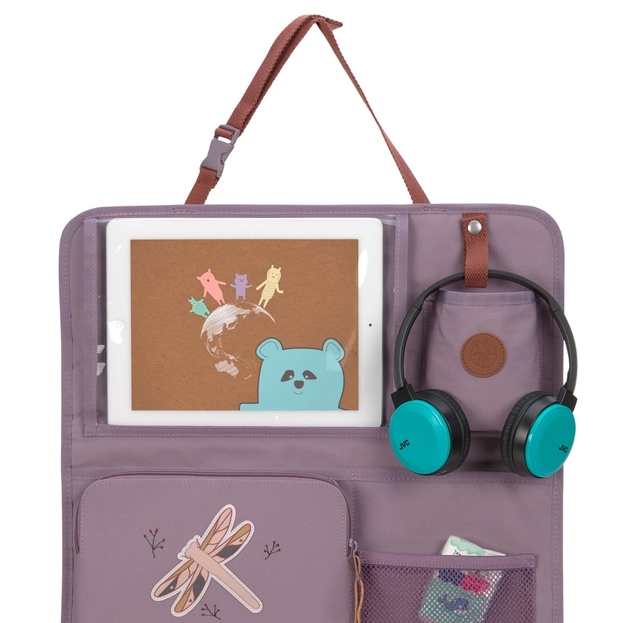 Lassig Adventure koleksiyonundan Yusufçuk motifli araç kaplaması, çocuklu aileler için araba yolculuklarını çok daha düzenli ve keyifli hale getirir. Arabanın koltuk arkasına kolayca monte edilen bu pratik düzenleyici, uzun veya kısa seyahatlerde çocukların ihtiyaç duyduğu tüm eşyaları el altında tutar. Çok sayıda cırt cırtlı ve fermuarlı saklama gözü sayesinde oyuncaklar, kitaplar, atıştırmalıklar ve su şişeleri düzenli bir şekilde taşınabilir. Ekstra büyük tablet bölmesi (26 x 18,5 cm), çocukların yolculuk sırasında en sevdikleri çizgi filmleri veya videoları izlemelerine olanak tanır. Tablet bölmesinin yanındaki sabitleme halkası ise kulaklık gibi aksesuarların kolayca saklanmasını sağlar. Ayrıca A4 boyutuna kadar defter ve kitaplar için arka kısımda geniş bir bölme bulunur. Su geçirmez ve silinebilir dış yüzeyi sayesinde yolculuk sırasında yaşanabilecek dökülme ve küçük kazalar sorun olmaktan çıkar. Çocuk dostu tasarımıyla bu organizer, hem işlevsellik hem de eğlenceli bir görünüm sunar.