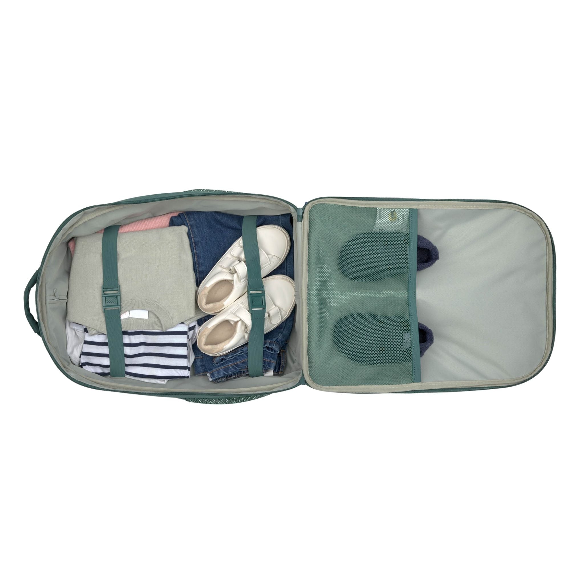 Lassig Little Gang koleksiyonundan koyu yeşil çocuk çantası, hem işlevselliği hem de eğlenceli tasarımıyla minik gezginler için mükemmel bir yol arkadaşıdır. Renkli yamalarla kişiselleştirilebilen bu bavul, çocukların seyahat sırasında kendi eşyalarını düzenlemelerine yardımcı olur ve bağımsızlıklarını teşvik eder. Dayanıklı ve hafif yapısı sayesinde kısa geziler, tatiller veya gece konaklamaları için idealdir. Geniş ana bölmesi elastik sabitleme kayışlarıyla donatılmıştır, böylece kıyafetler ve diğer eşyalar güvenle taşınır. İki yan cep ve fermuarlı ön cep, oyuncaklar, atıştırmalıklar veya seyahat sırasında ihtiyaç duyulabilecek küçük eşyalar için ekstra alan sağlar. Su geçirmez dış yüzeyi sayesinde her türlü hava koşulunda kullanılabilir. Kolay hareket eden tekerlekler ve iki kademeli uzatılabilir teleskopik sap, çocuğunuzun valizi rahatça taşımasına imkân tanır. İç kısmında bulunan isim etiketi, bavulun karışmasını önlerken; ayrı ayakkabı çantası da düzenli kullanım sunar. Çıtçıtlı halkaya takılabilen renkli yamalar, çekçekli çantayı benzersiz hale getirir.