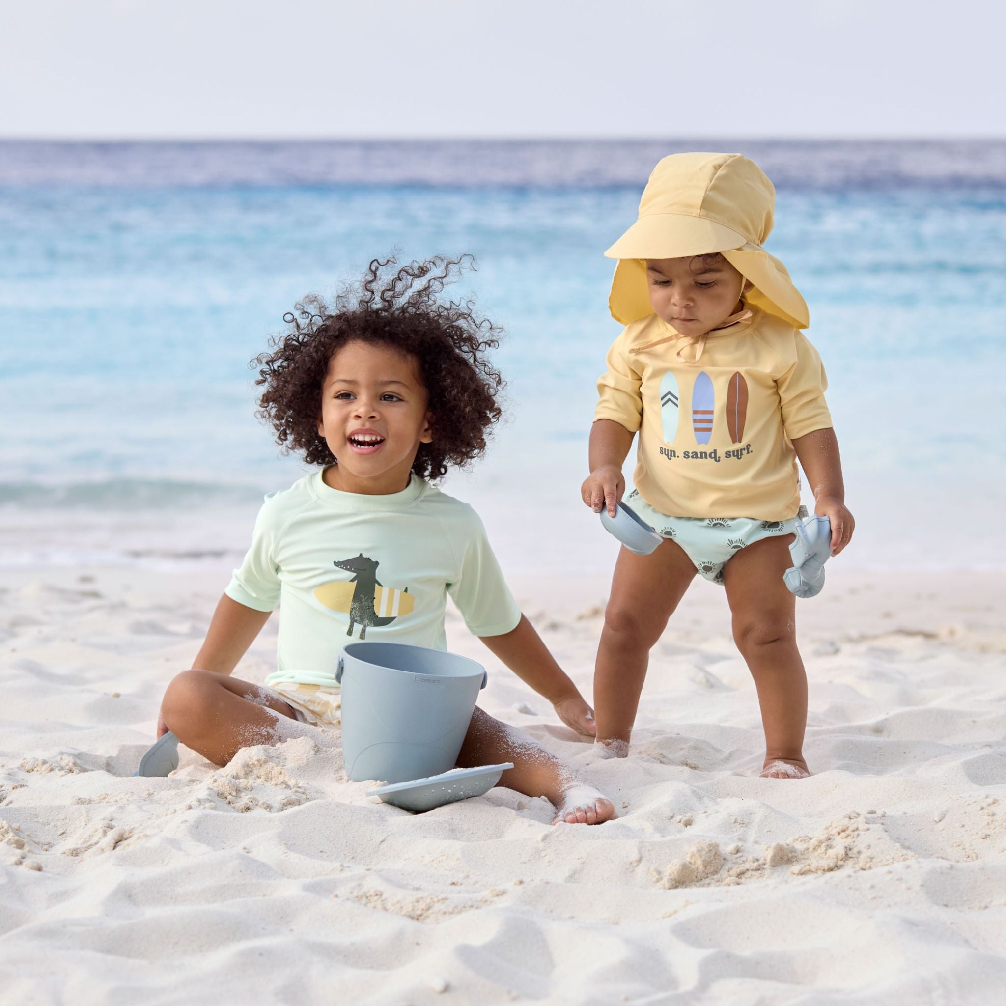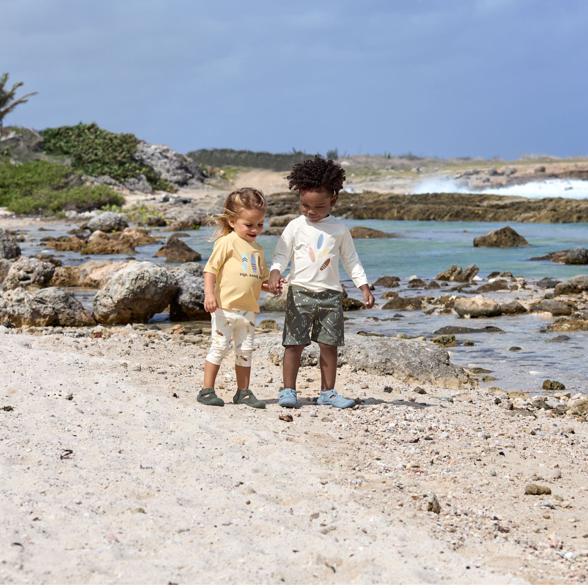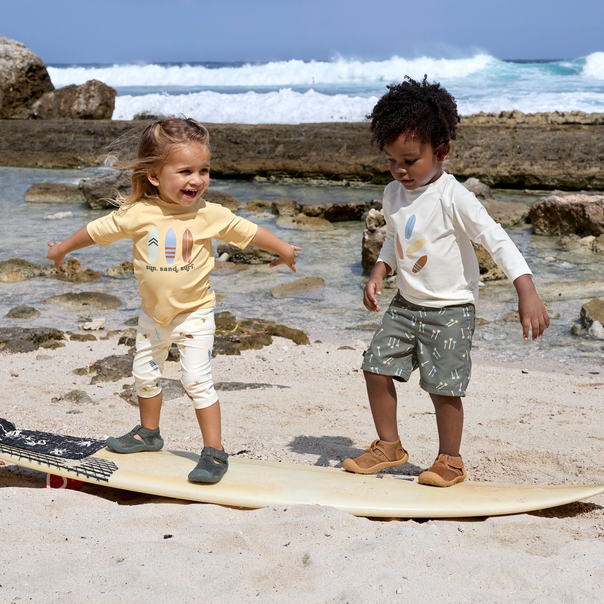 Lassig Surfboards UV Korumalı Kısa Kollu Mayo Tişört Vanilla; sade zarafeti deniz tutkusuyla buluşturan özel bir yaz tasarımıdır. Doğal tonların huzurunu taşıyan bu mayo tişört, sörf tahtası desenleriyle hareketlendirilmiş ve çocukların güneşli günlerde hem korunmasını hem de şıklığını ön planda tutacak şekilde geliştirilmiştir. Krem rengin yumuşaklığı, güneş ışığını nazikçe yansıtırken, Lassig ’in geri dönüştürülmüş malzeme kullanımı sayesinde doğaya saygılı bir tercih sunar. Hafif yapısı, hızlı kuruyan dokusu ve esnek kumaşıyla çocukların deniz kenarında, havuz başında veya açık hava oyunlarında rahatlıkla kullanabileceği bir üründür. UPF faktörü olmadan da güneşten doğal koruma sağlayan kumaş, hassas ciltler için güvenli bir bariyer görevi görür.