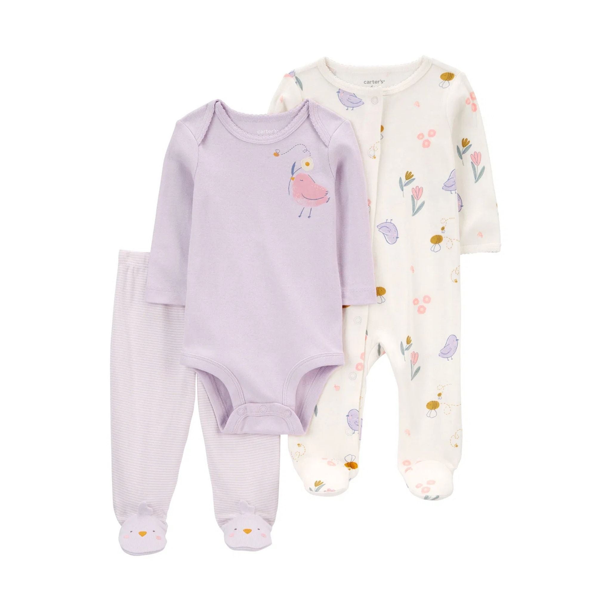 Carter's'ın yumuşacık pamuktan üretilen, mor renkli 3 parçalı kız bebek kıyafet setiyle bebeğinizin her ihtiyacını karşılayın! Şık tasarım ve konfor bir arada. Carter’s 3 parçalı kız bebek kıyafet seti, bebeğinizin günlük ihtiyaçlarını karşılamak için tasarlanmış mükemmel bir kombin sunuyor. Bu set; kısa kollu bir zıbın, ayaklı bir pantolon ve renkli çiçekli uyku & oyun tulumundan oluşur. %100 pamuk ribana kumaşı ile hassas bebek cildine uyum sağlar, mor renkli şık tasarımıyla göz alıcıdır.