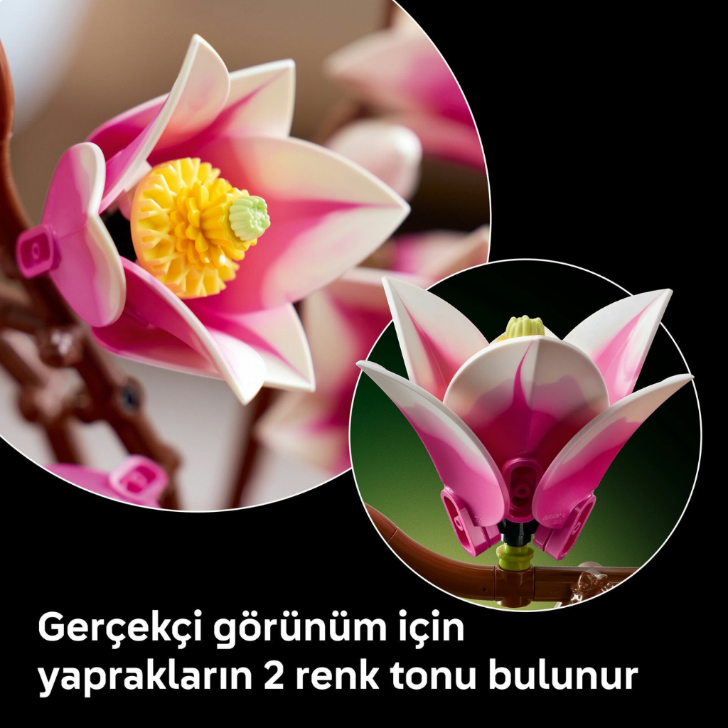 Lego Botanicals Manolya Dalları 11510 yapım seti, doğanın zarafetini evinize taşıyan estetik ve detaylı bir dekoratif model sunar. 18 yaş ve üzeri kullanıcılar için tasarlanan bu set, manolya çiçeklerinin farklı gelişim aşamalarını yansıtan özgün tasarımı ile hem rahatlatıcı bir yapım süreci hem de şık bir sergileme deneyimi sağlar. Doğadan ilham alan bu model, minimal ve zarif dekorasyon tarzlarını tamamlayan özel bir parçadır. Set içerisinde yer alan 5 manolya dalı, tomurcuk halinden tam açmış çiçeğe kadar farklı aşamaları yansıtır. İki tonlu yaprak tasarımı sayesinde daha gerçekçi bir görünüm elde edilir. Cupcake parçaları, kahverengi kurbağa detayları, yumurta formundaki tomurcuklar ve dondurma formundaki uç detaylar gibi yaratıcı yapı elemanları, modelin özgünlüğünü artırır ve yapım sürecini daha keyifli hale getirir. Tamamlandığında dekoratif bir çiçek aranjmanı olarak kullanılabilen bu set, ev veya ofis ortamında dikkat çekici bir aksesuar oluşturur. Diğer Lego Botanicals setleri ile birleştirilerek daha büyük ve kişiselleştirilmiş aranjmanlar hazırlanabilir. Özel günlerde anlamlı bir hediye alternatifi sunan bu model, doğum günü, Anneler Günü, Sevgililer Günü veya yeni ev hediyesi olarak tercih edilebilir.