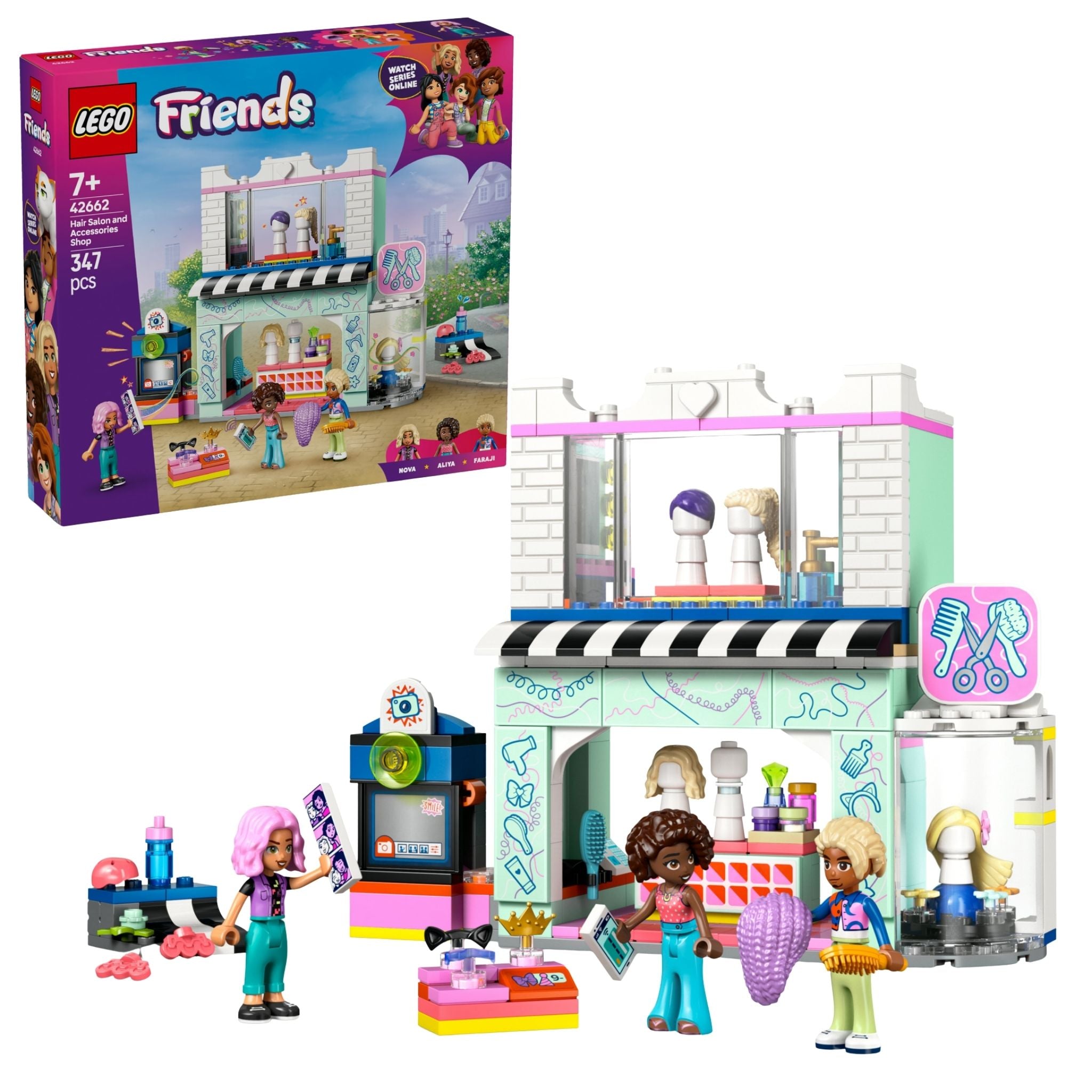 Saç tasarımı ve rol yapma oyunlarını seven çocuklar için hazırlanan Lego Friends Kuaför ve Aksesuar Mağazası, 7 yaş ve üzeri miniklere renkli ve yaratıcı bir oyun dünyası sunar. Setin hikâyesi, Faraji ’nin kuaför salonunda yeni saç stilleri deneyen Nova ve Aliya’ nın eğlenceli gününü konu alır. İki katlı mağaza; saç kurutma makineleri, fırçalar, peruklar, aksesuar standları ve fotoğraf kabini gibi ayrıntılarla donatılmıştır. Çocuklar, üst kattaki kuaför bölümünde diledikleri stilleri oluşturabilir, alt kattaki aksesuar mağazasında yeni görünümler için peruk ve aksesuar seçebilir. Dönen vitrin, kaykay rampası, inline paten ve kask gibi ekstra parçalar, hikâye çeşitliliğini artırırken seti daha da eğlenceli hale getirir.