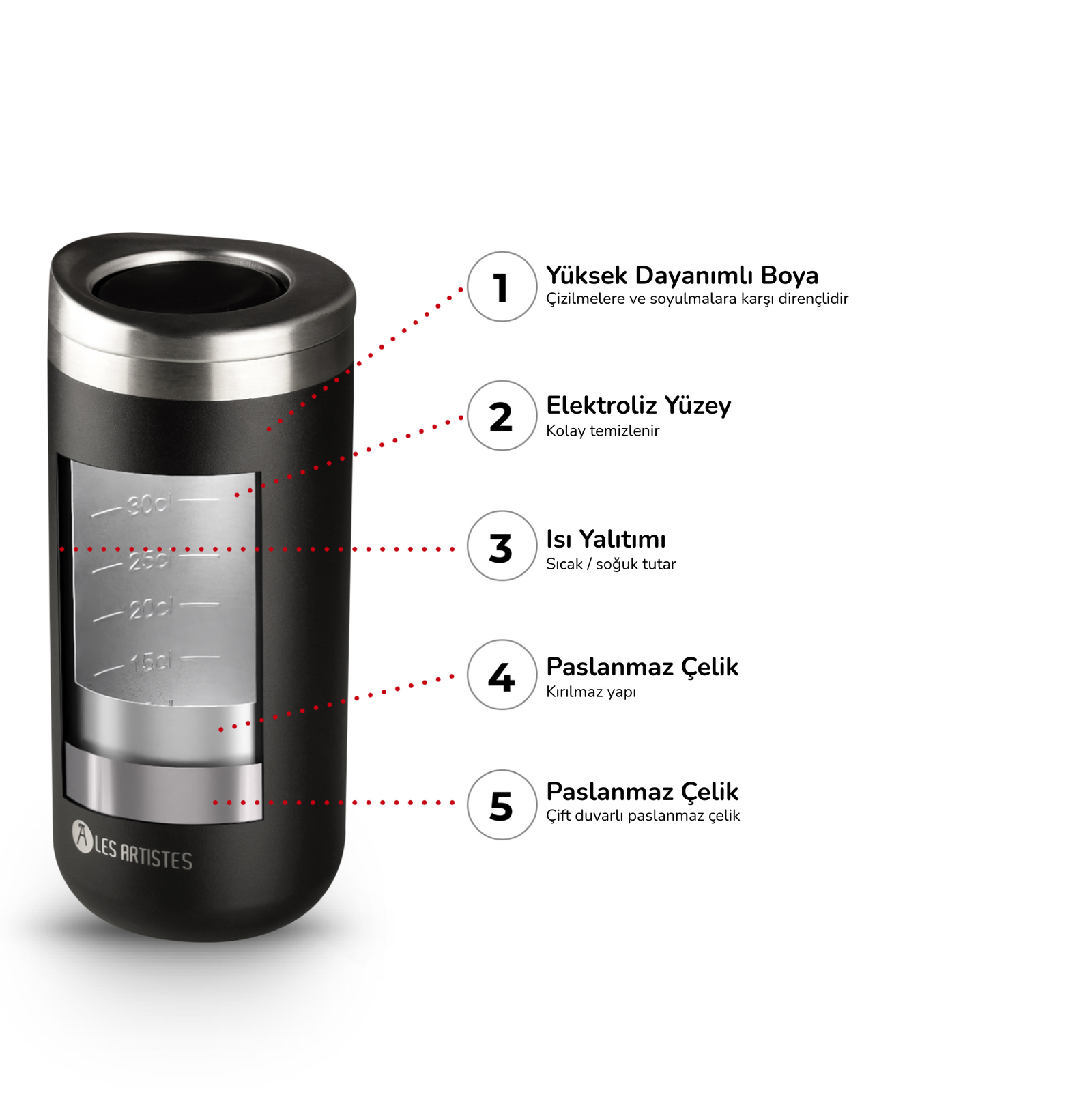 Taşıması kolay ve şık tasarımlı yalıtımlı şişemiz, günlük rutininiz için mükemmel bir yardımcıdır. Tüm yalıtımlı şişe koleksiyonlarımız, içecekleri 12 saat sıcak ve 24 saat soğuk tutan, tadını değiştirmeyen çift duvarlı paslanmaz çelik yapıya sahiptir. Silikon contalı hava geçirmez kapağı sayesinde şişe tamamen sızdırmazdır. Yüksek dayanıklılığa sahip boyası ve elektroliz yüzeyi, uzun ömürlülük ve kolay bakım sağlar. Les Artistes Paris ile plastik şişelere şık ve çevre dostu bir alternatif seçin.