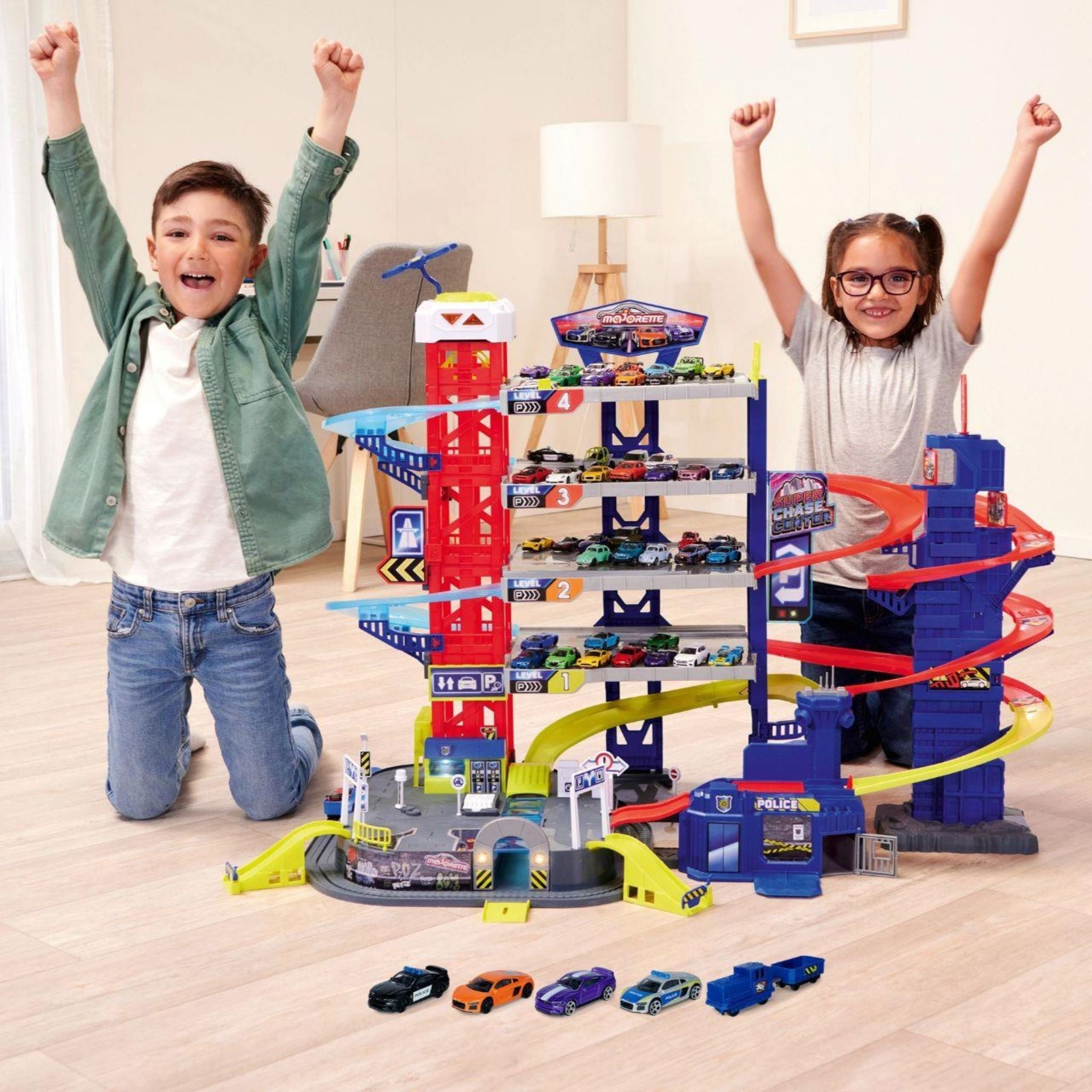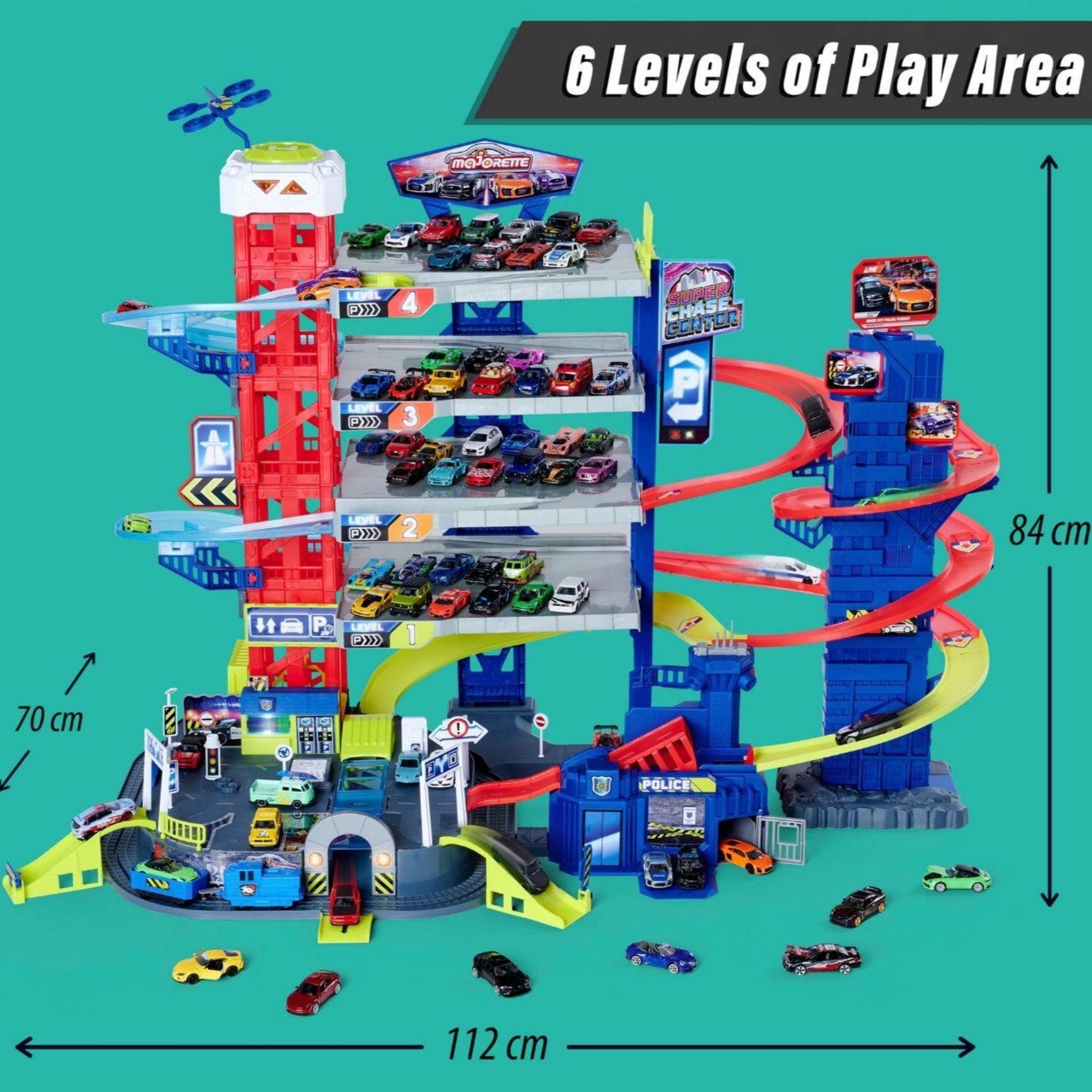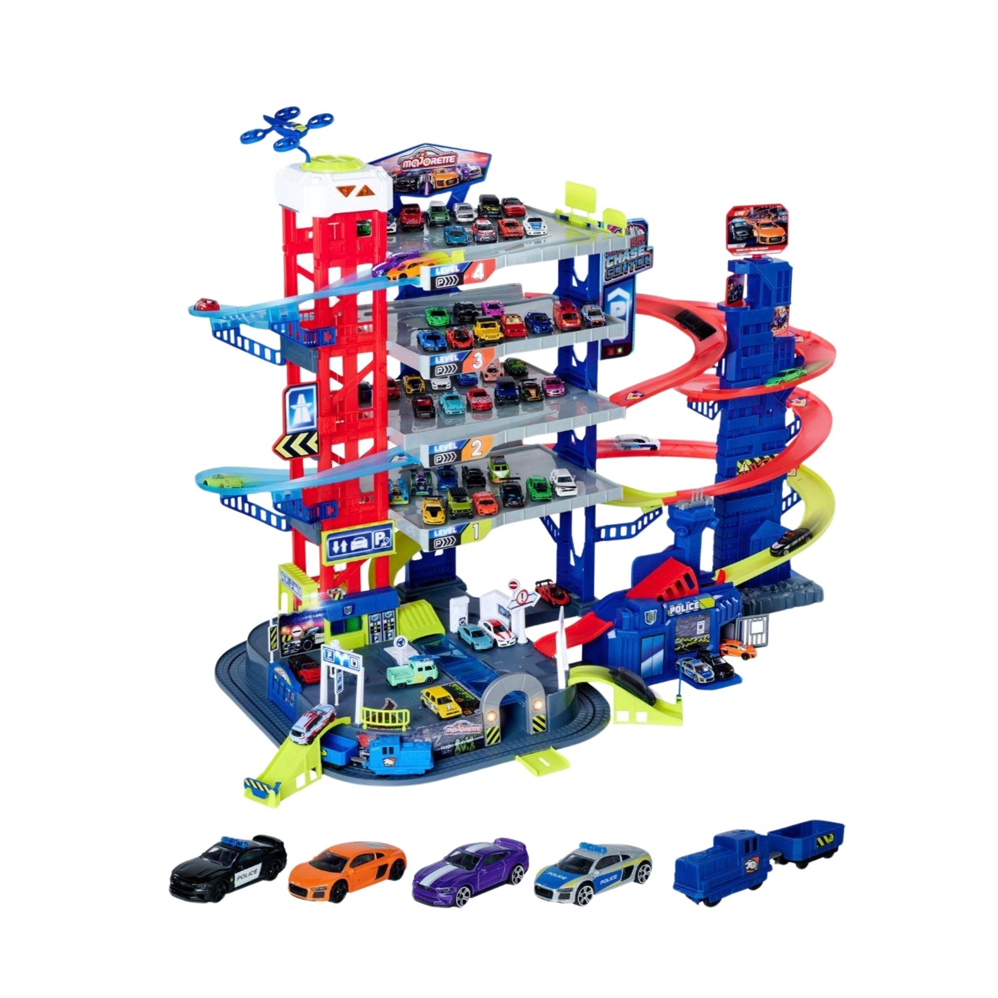 Aksiyonun, hızın ve eğlencenin buluştuğu Majorette Süper Garaj Kovalamaca Merkezi Oyun Seti, küçük araba tutkunlarına unutulmaz bir oyun deneyimi sunuyor! 6 katlı dev garaj sistemi, ışıklı ve sesli efektleri, mekanik asansörü ve özel tren hattı ile gerçek bir şehir trafiğini evinizde canlandırıyor. Bu dev oyun setinde 56 park alanı, tuzak kapaklı polis karakolu, çift raylı tren yolu ve mekanik asansör bulunur. Kutu içeriğinde ayrıca 4 adet 7,5 cm’lik die-cast (metal) Majorette araç ve pille çalışan bir tren yer alır. Çocuklar, kendi şehirlerini kurarak macera dolu kovalamacalara katılabilir.