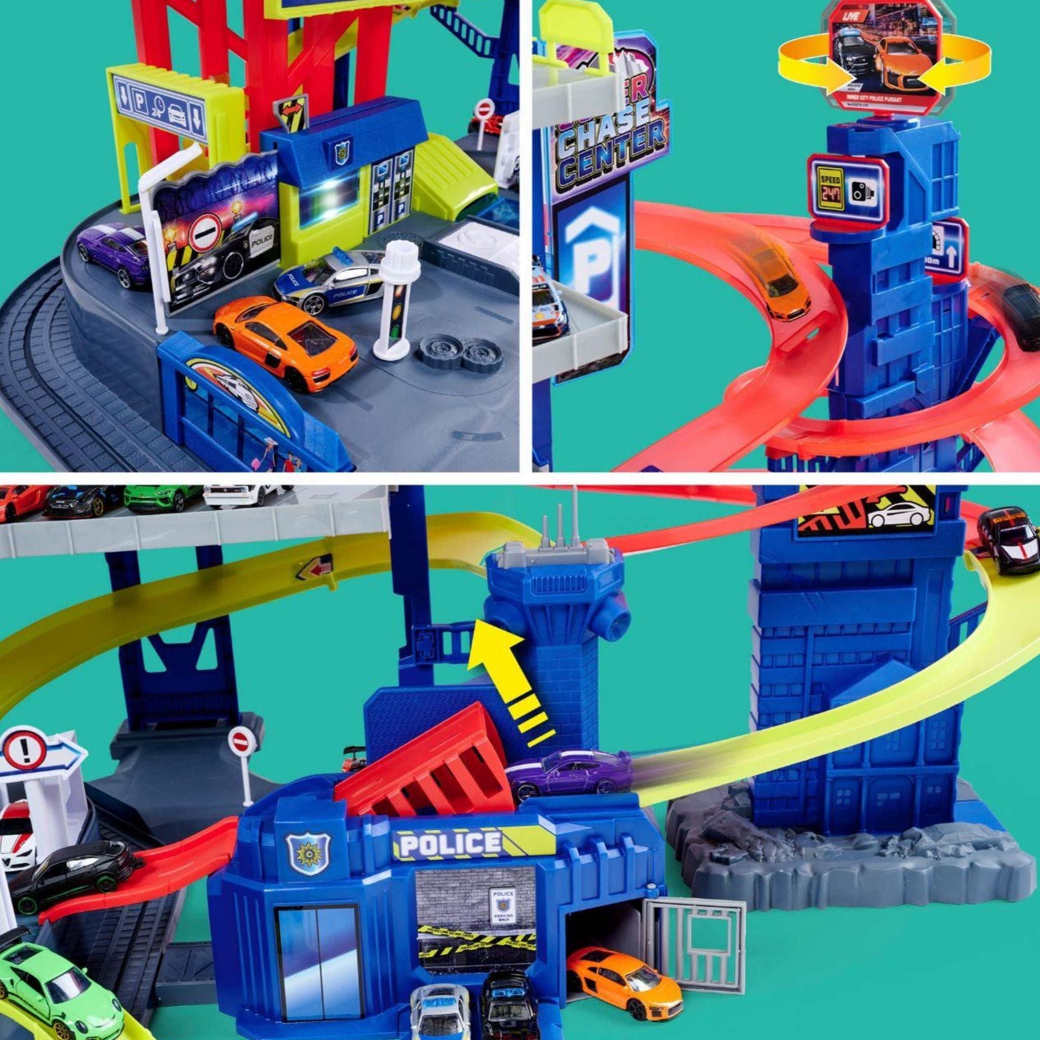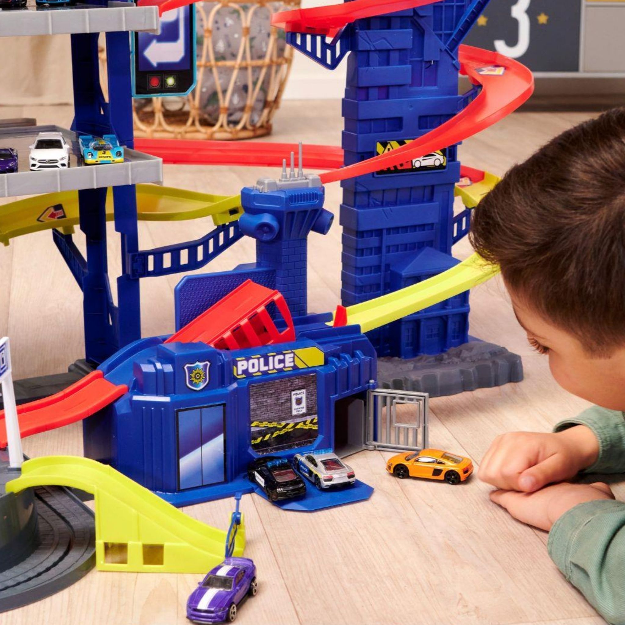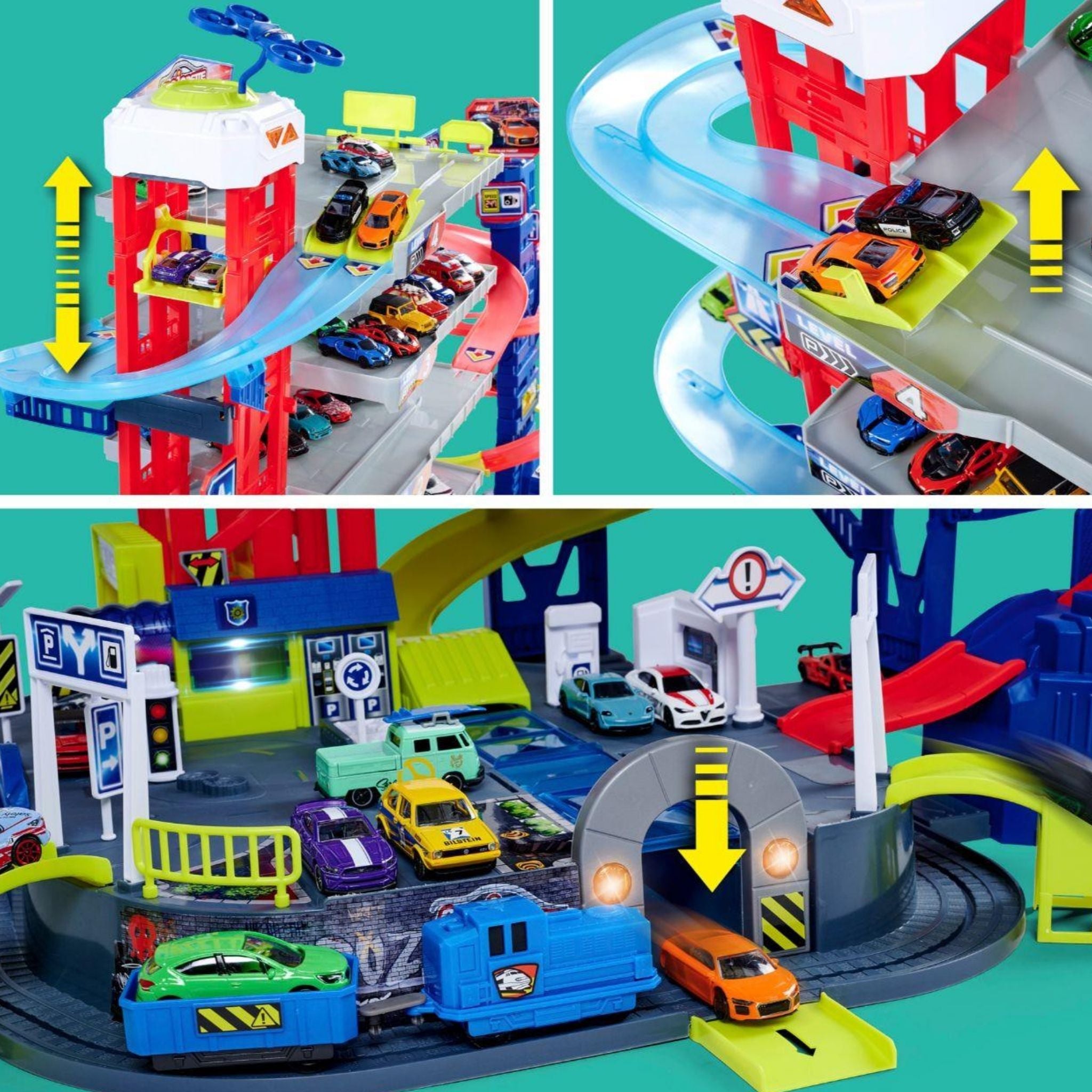 Aksiyonun, hızın ve eğlencenin buluştuğu Majorette Süper Garaj Kovalamaca Merkezi Oyun Seti, küçük araba tutkunlarına unutulmaz bir oyun deneyimi sunuyor! 6 katlı dev garaj sistemi, ışıklı ve sesli efektleri, mekanik asansörü ve özel tren hattı ile gerçek bir şehir trafiğini evinizde canlandırıyor. Bu dev oyun setinde 56 park alanı, tuzak kapaklı polis karakolu, çift raylı tren yolu ve mekanik asansör bulunur. Kutu içeriğinde ayrıca 4 adet 7,5 cm’lik die-cast (metal) Majorette araç ve pille çalışan bir tren yer alır. Çocuklar, kendi şehirlerini kurarak macera dolu kovalamacalara katılabilir.