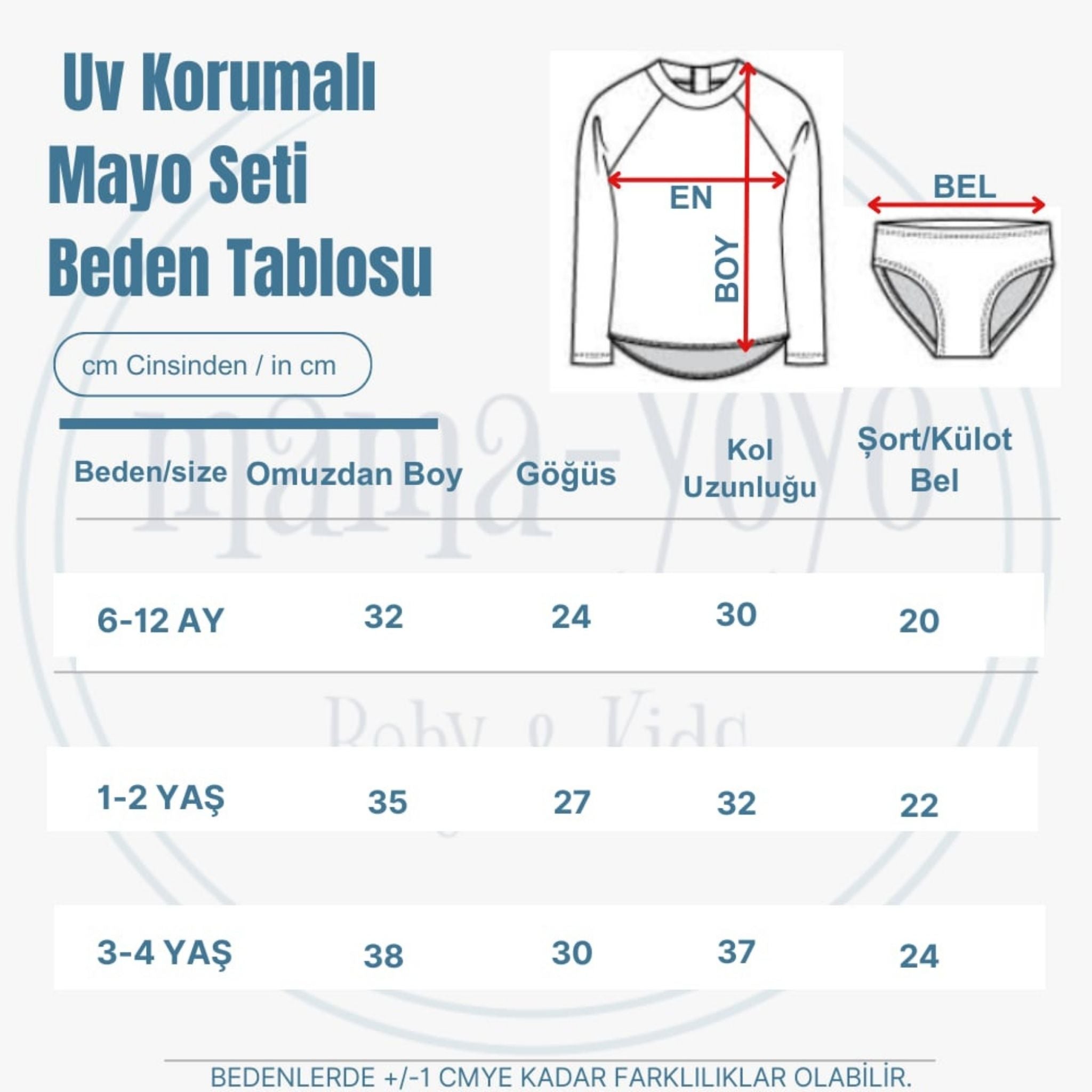 Mama Yoyo UV Korumalı Uzun Kollu Mayo Seti Octo Love Çok Renkli Bebekleriniz İçin Mayo Seti Çocuklarınızın plajda ve havuzda güvenle vakit geçirmesini sağlayacak Mama Yoyo UV Korumalı Uzun Kollu Mayo Seti Octo Love Çok Renkli ile tanışın! Bu şık ve sevimli mayo seti, zararlı UV ışınlarına karşı maksimum koruma sağlayan özel bir kumaştan üretilmiştir. UV Koruma: UV50+ koruma özelliği sayesinde çocuğunuzun cildini zararlı güneş ışınlarından korur. Mama Yoyo UV Korumalı Uzun Kollu Mayo Seti Octo Love Çok Renkli İçerik Özellikleri; Mama Yoyo UV Korumalı Uzun Kollu Mayo Seti Octo Love Çok Renkli: Özel UV uygulama yapılmış kumaştan üretilmiştir. Konfor ve Hareket Özgürlüğü: Esnek yapısı ve yumuşak dokusuyla çocukların rahatça hareket etmesini sağlar. Uzun Kollu Tasarım: Ekstra koruma sağlayan uzun kollu tasarım, güneşe maruz kalan alanları en aza indirir. Şık Tasarım: Canlı pembe rengi ve deniz kabuğu desenleri ile plaj modasına uygun. Aynı desende UV korumalı şapka, müslin panço ve ıslak çantasıyla avantajlı olarak kombinleyebilirsiniz. Uzun kollu arkadan çıtçıtlı üst ve fırfırlı model külot mayo setidir. Şapka takıma dahil değildir. Polyester ev EA karışımlıdır. Deterjansız, soğuk suyla elde yıkama tavsiye edilir. Sererek kurutunuz.