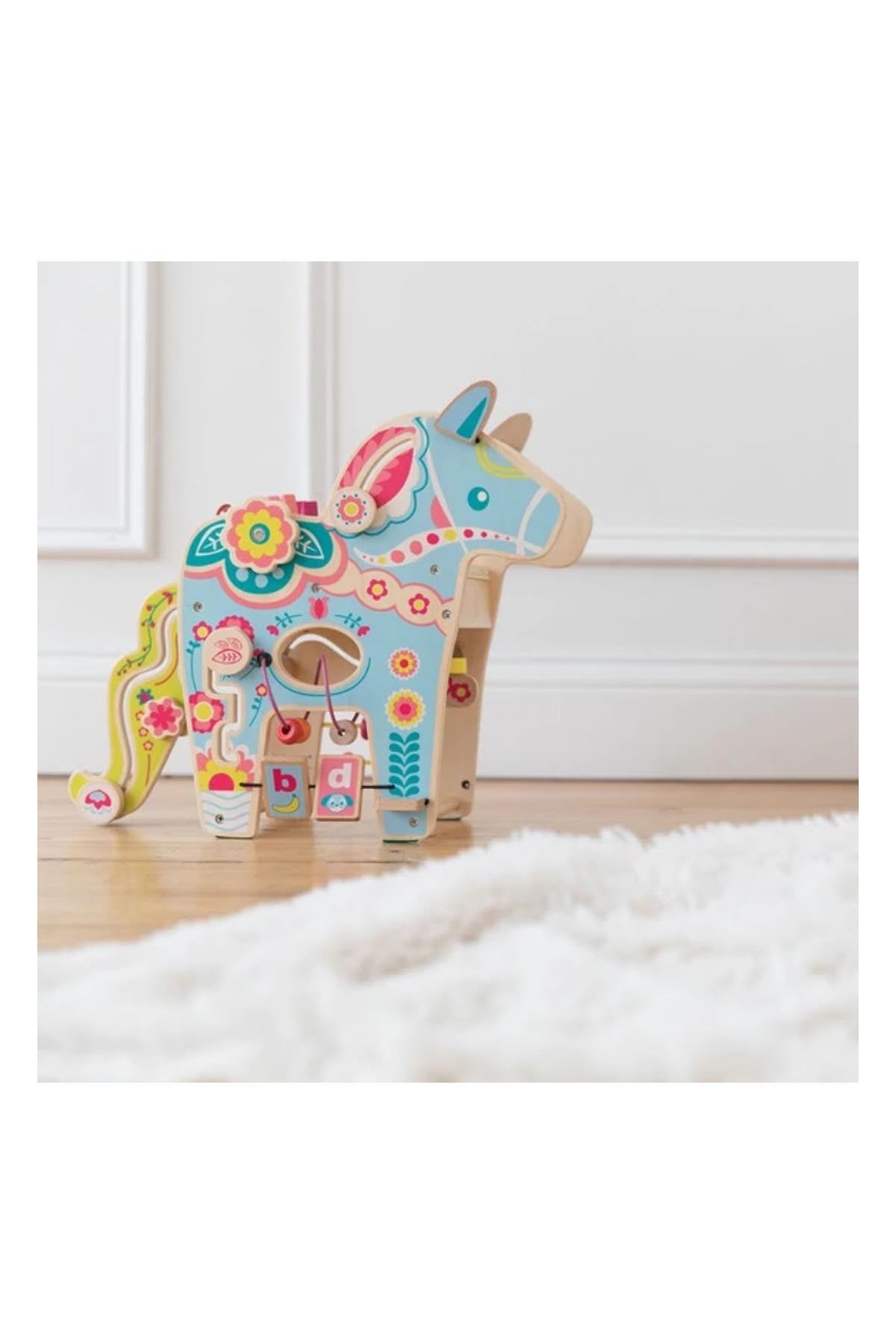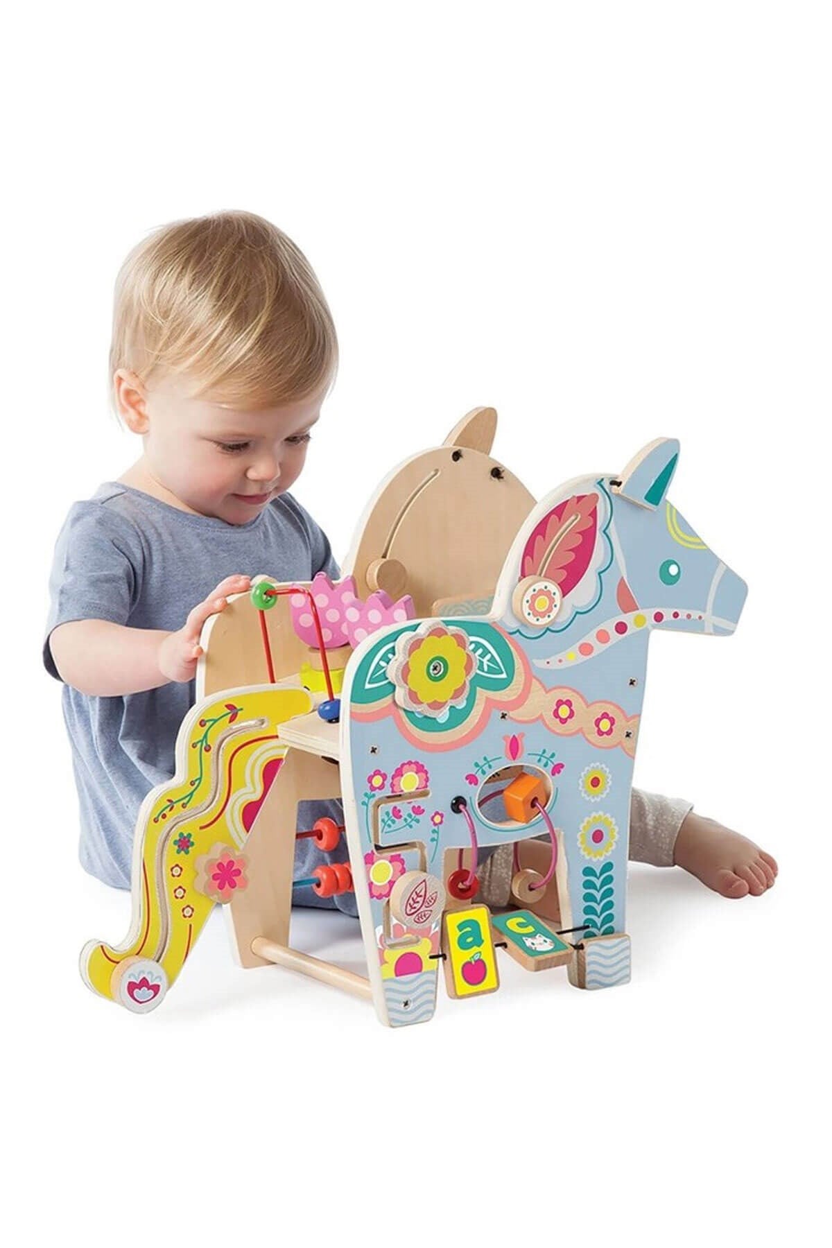 Manhattan Toy Pony Aktivite Masası, çocukların dikkat süresini artırır, aynı zamanda odaklanma becerilerini güçlendirir. Çocuklar oynarken saymayı, renkleri ve şekilleri tanımayı öğrenir. Ergonomik yapısı sayesinde hem masa üstünde hem de yerde rahatça kullanılabilir.