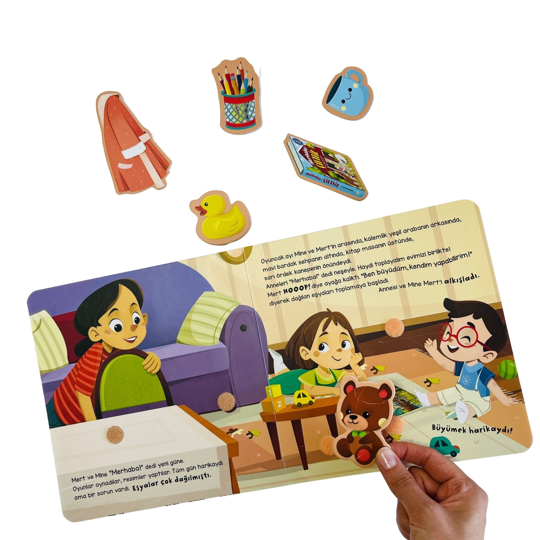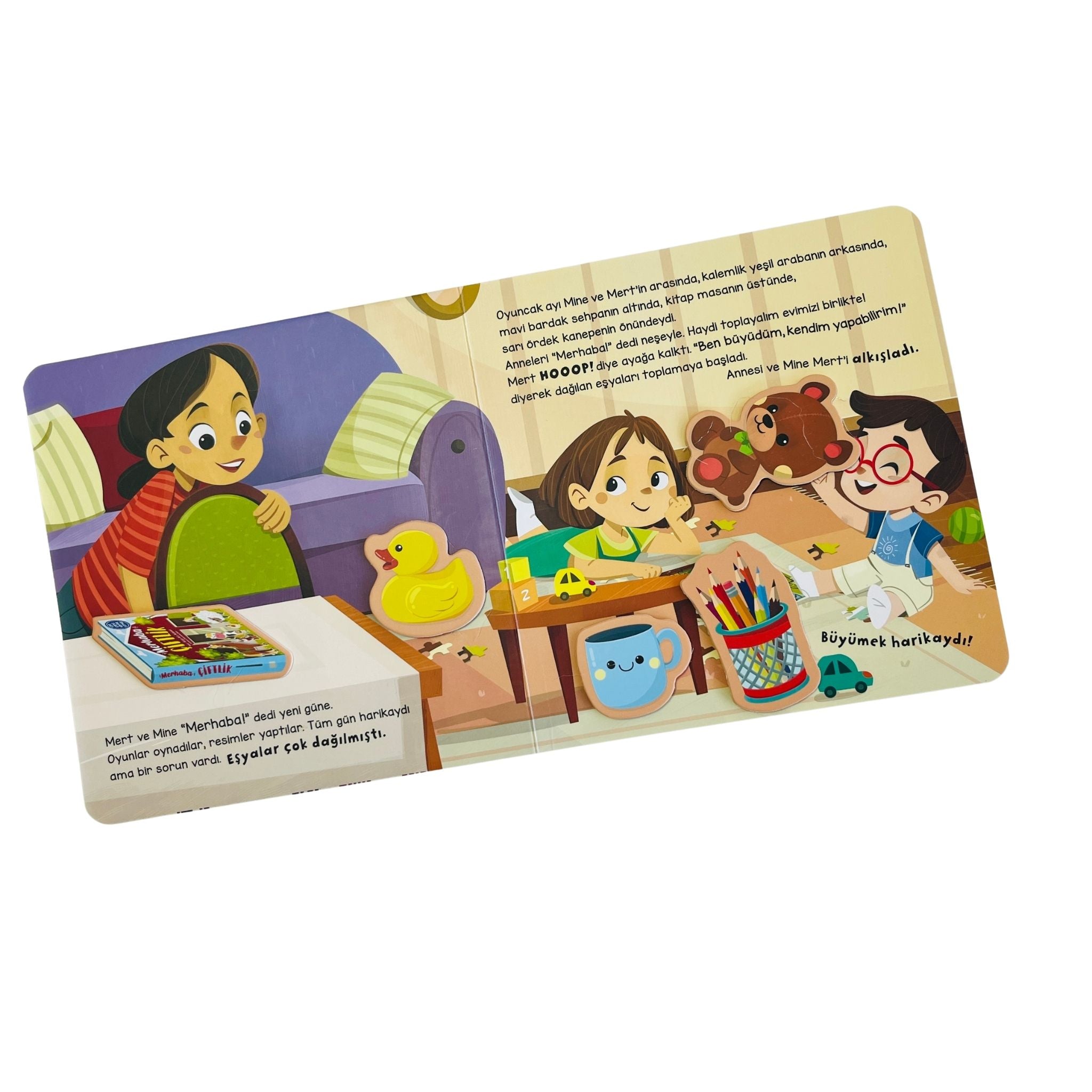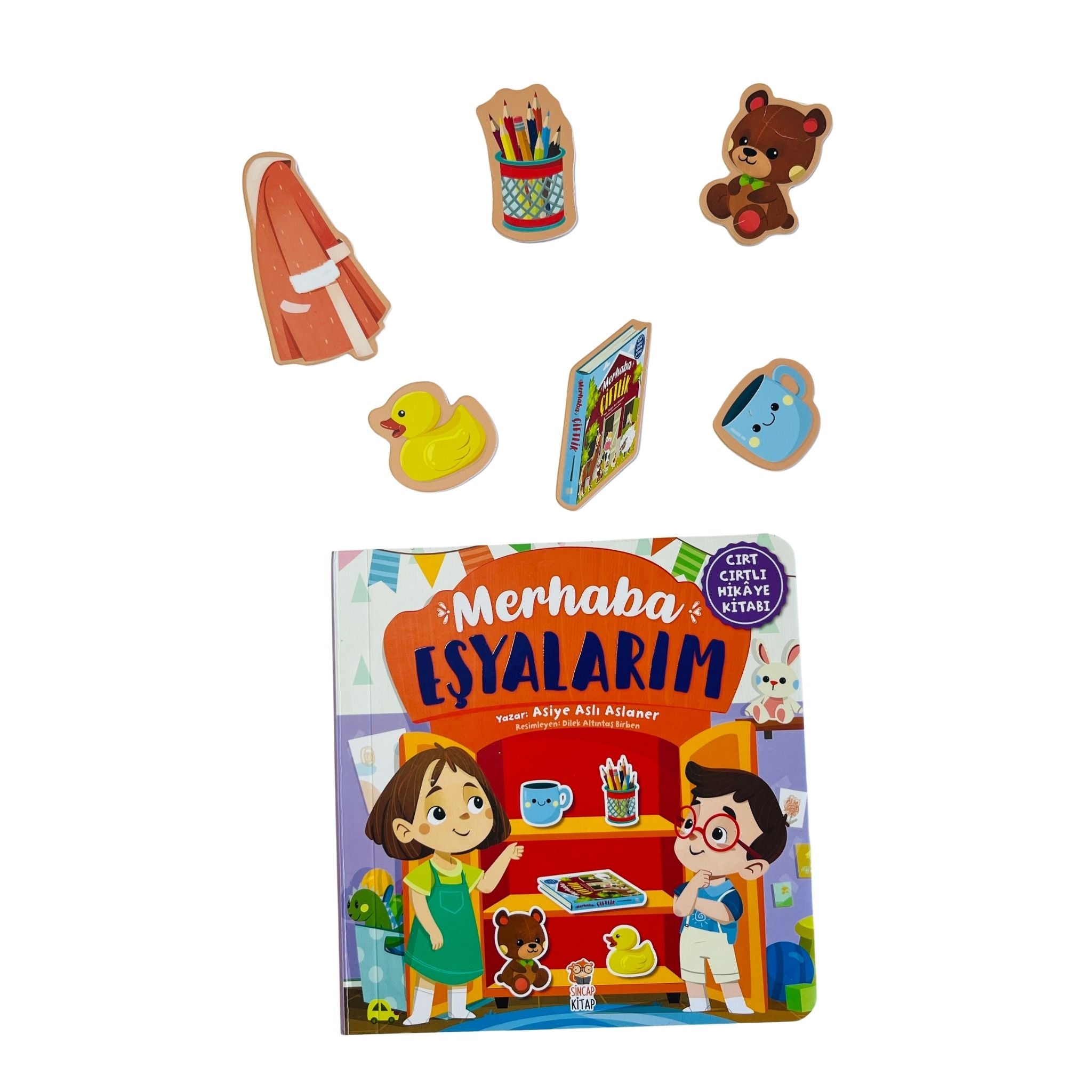 Merhaba Eşyalarım, 2-4 yaş grubundaki çocukların sorumluluk duygusunu, düzen alışkanlığını ve eşya farkındalığını geliştirmeye yardımcı olan interaktif bir okul öncesi hikâye kitabıdır. Mert ve Mine’nin keyifli bir günün sonunda dağılan eşyaları toplamaya çalışmasıyla başlayan hikâye, çocukları aktif katılıma davet eder. Cırt cırtlı parçalar sayesinde minikler eşyaları doğru yerlere yerleştirerek hikâyeyi tamamlar ve düzenli olmanın ne kadar keyifli olduğunu deneyimleme fırsatı bulur. Renkli çizimler, günlük yaşamdan alınmış sade bir anlatım ve etkileşimli oyun yapısı, çocaukların dikkat gelişimini ve el göz koordinasyonunu destekler. Sincap Kitap Atölye tarafından hazırlanan bu kitap, ev içi sorumluluk bilincini eğlenceli bir şekilde kazandırmayı amaçlayan değerli bir öğrenme kaynağıdır. Hem evde hem de okul öncesi ortamlarında keyifle kullanılabilir.
