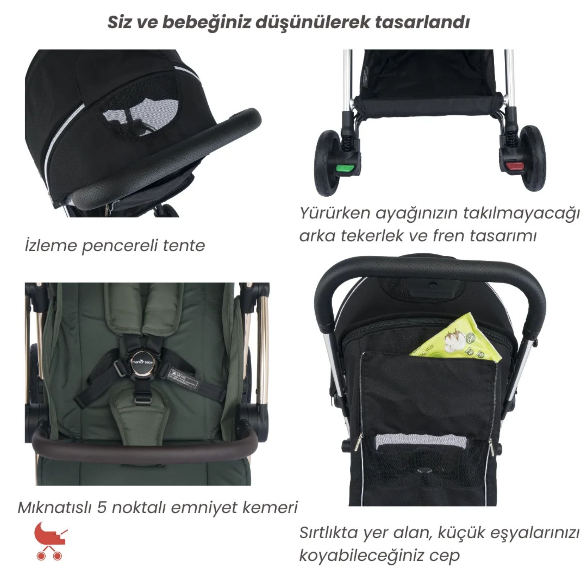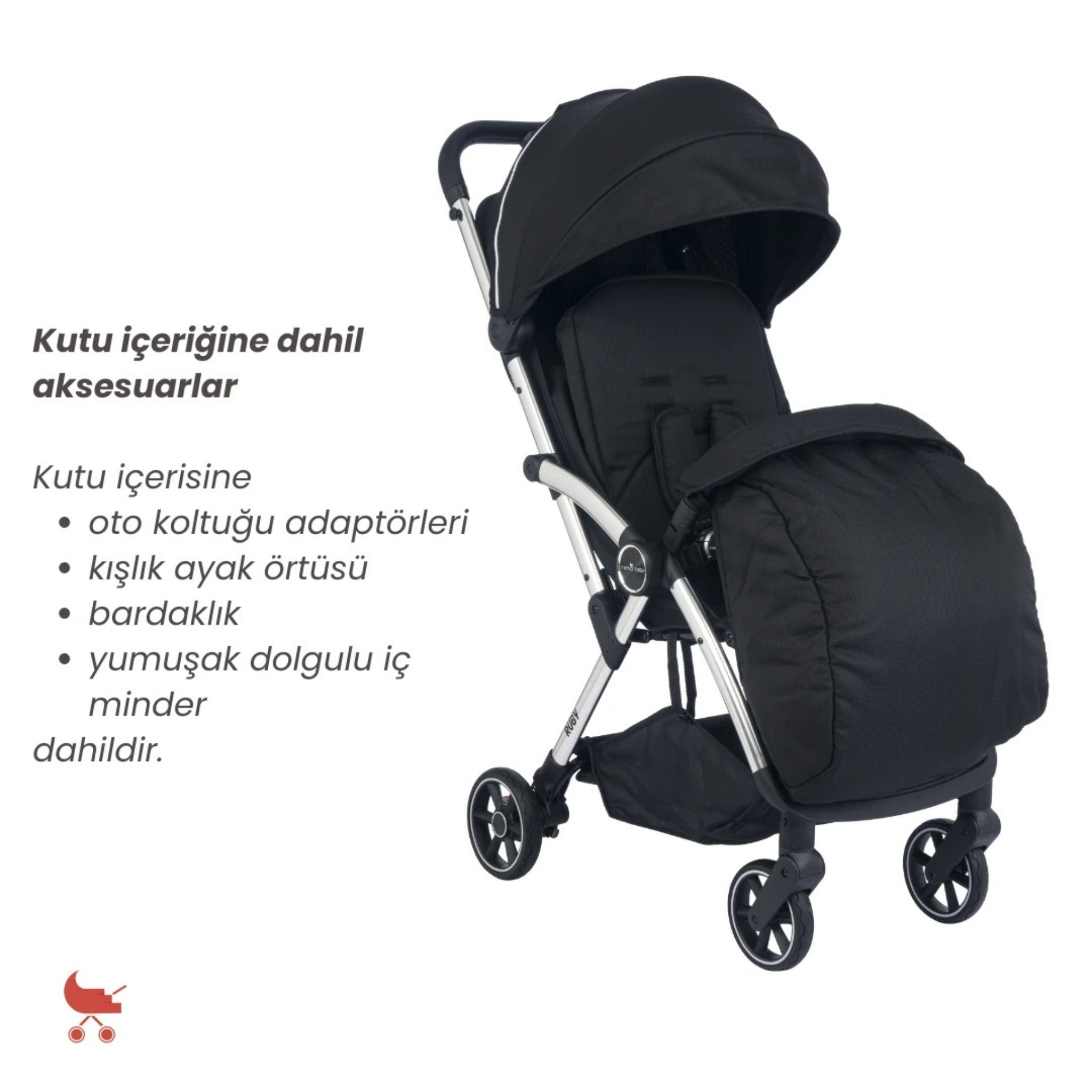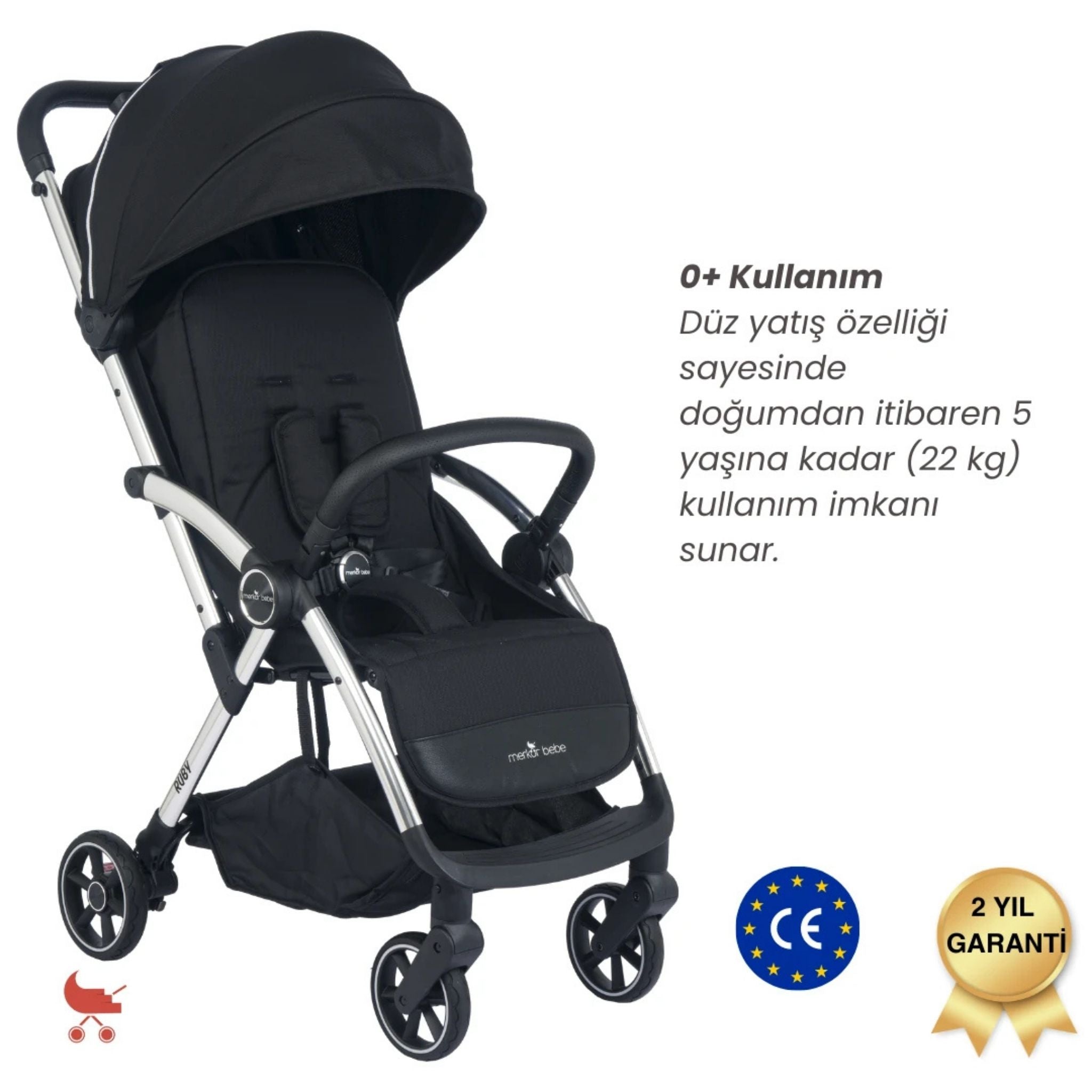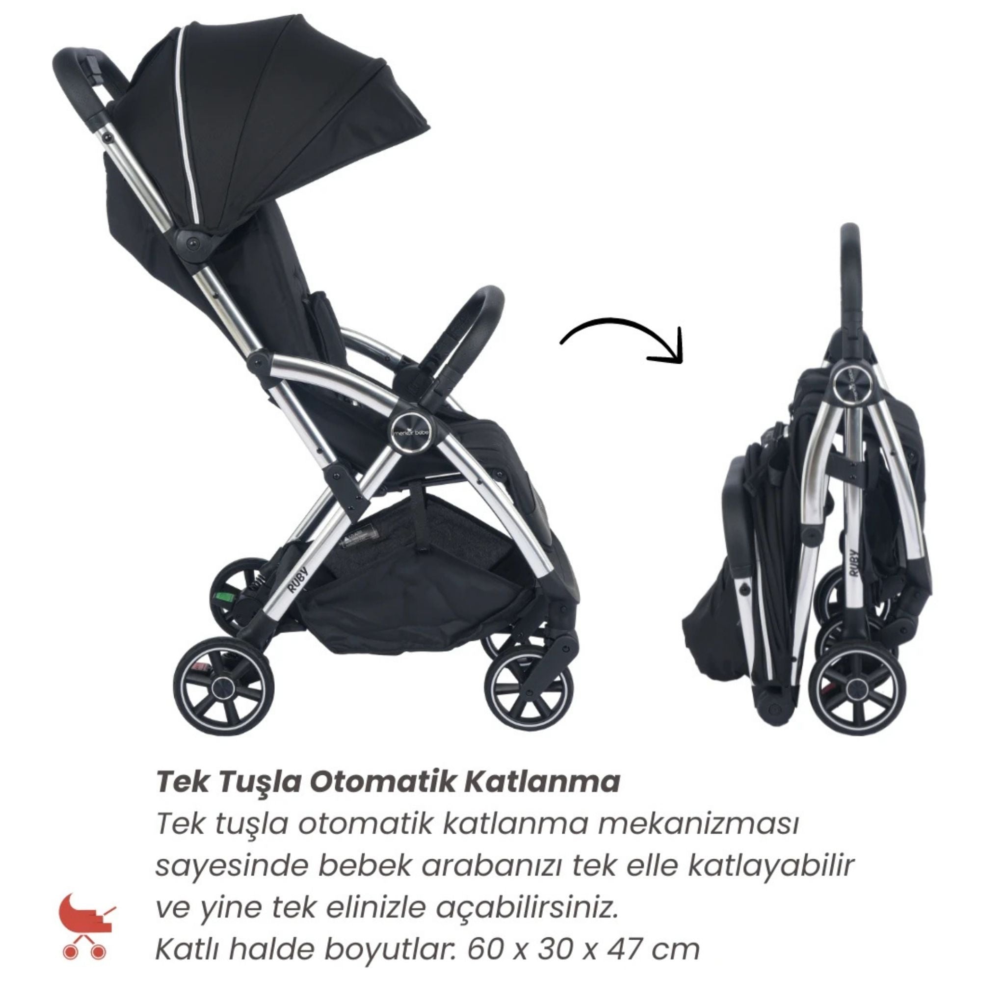 Merkür Bebe Ruby kabin boy bebek arabası, doğumdan itibaren 22 kg'a kadar kullanım imkânı sunan, kompakt tasarımı ve pratik fonksiyonları ile modern ebeveynlerin ihtiyaçlarına eksiksiz şekilde cevap verir. Tek tuşla otomatik katlanabilen yapısı sayesinde en hızlı ve kolay katlanabilen bebek arabalarından biridir. Ruby, şık tasarımı, geniş aksesuar içeriği ve yüksek kalite malzemesi ile hem konfor hem de işlevsellik sunar. Merkür Bebe Ruby kabin boy bebek arabası; hafifliği ve fonksiyonel detaylarıyla hem günlük kullanım hem de seyahatler için mükemmel bir tercihtir. Modern tasarımı ve kolay taşınabilir yapısıyla her an yanınızda.