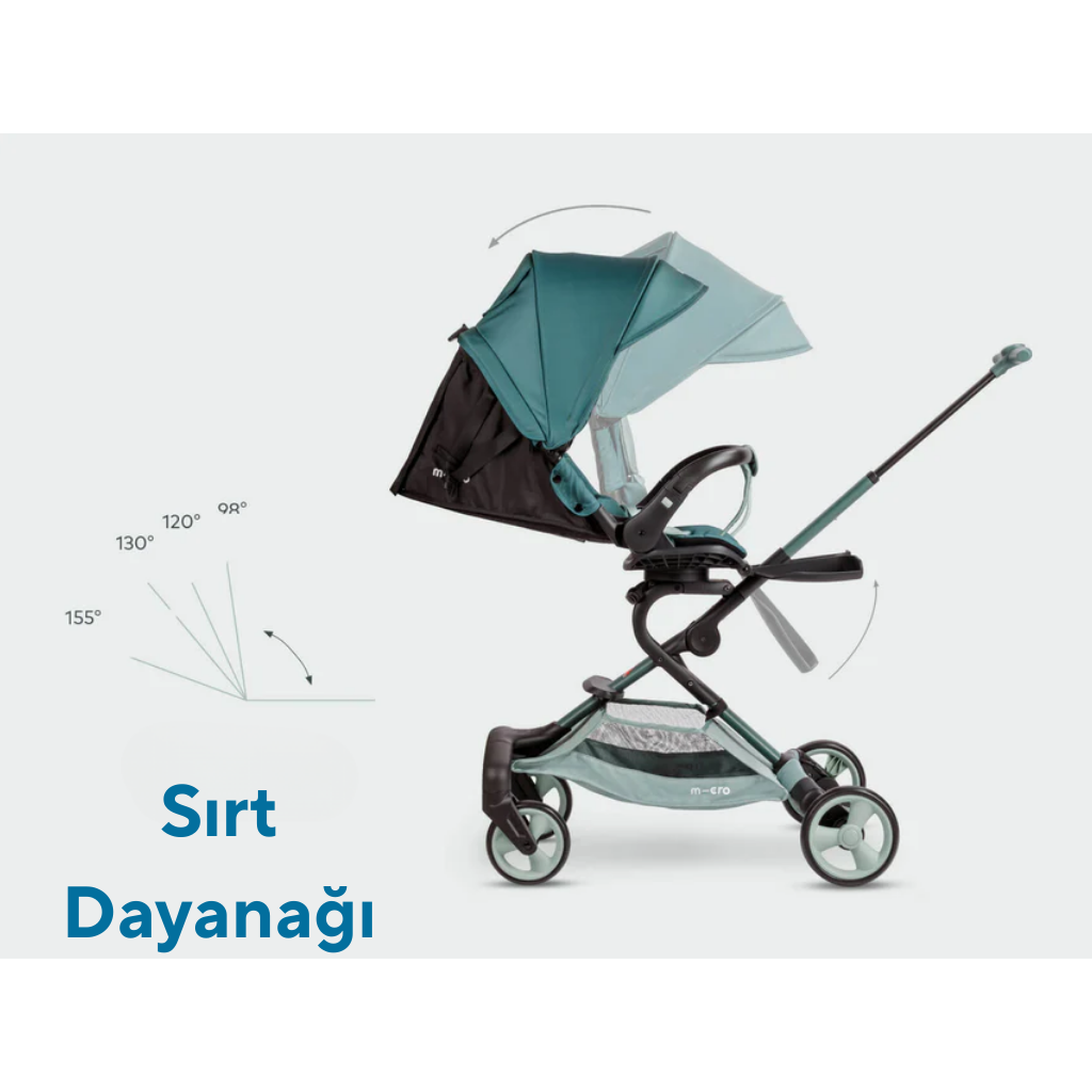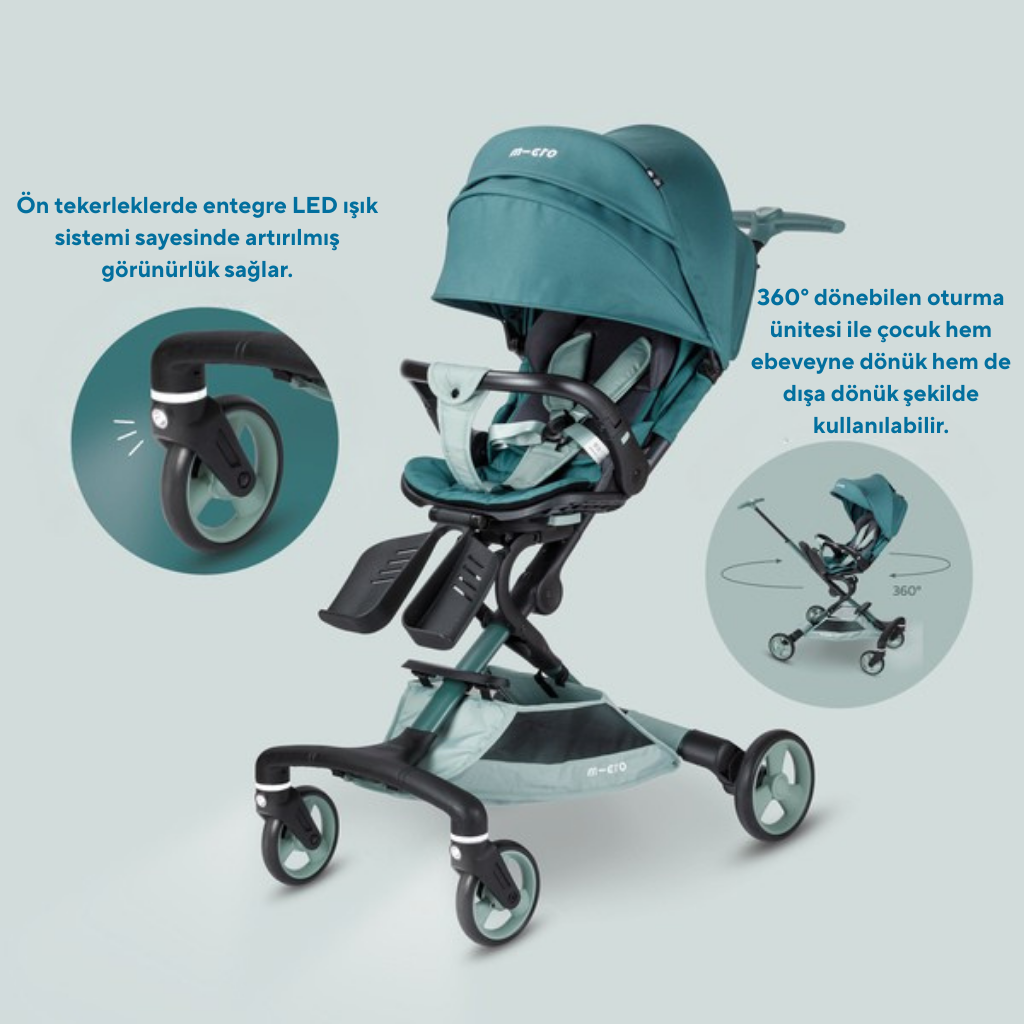 Micro Baby Cruiser 360 Matcha, şehir hayatına uyum sağlayan modern tasarımı, gelişmiş güvenlik detayları ve pratik kullanım özellikleri ile ebeveynlerin günlük yaşamını kolaylaştırmak için tasarlanmış premium bir bebek arabasıdır. Micro Scooter İsviçre mühendisliği ile geliştirilen bu model; güvenlik, konfor ve stil beklentilerini tek bir ürün içerisinde buluşturur. Hafif gövde yapısı, kolay manevra kabiliyeti ve kompakt katlanma sistemi sayesinde alışverişten seyahate, günlük yürüyüşlerden şehir içi ulaşıma kadar her ortamda rahat kullanım sunar. 360° dönebilen koltuk sistemi sayesinde bebeğiniz ister size dönük ister dış dünyayı keşfedecek şekilde konumlandırılabilir. Ayarlanabilir sırt desteği, ergonomik oturma alanı ve yüksek kaliteli döşemesi bebeğinizin uzun süre konforlu kalmasını destekler. UPF 50+ güneş korumalı geniş tente, güneşli günlerde gölge sağlayarak bebeğinizi zararlı ışınlara karşı korur. Havalandırma penceresi sayesinde içerideki hava dolaşımı korunur ve ferah bir kullanım ortamı oluşturulur. Arka tekerlek süspansiyon sistemi ve 360° dönebilen ön tekerlekler, farklı zeminlerde sarsıntıyı azaltarak yumuşak bir sürüş deneyimi sağlar. Dahili dinamo sistemiyle çalışan LED ön tekerlekler pil gerektirmeden ışık üretir ve düşük ışık koşullarında görünürlüğü artırarak ekstra güvenlik sunar. Tek dokunuşla çalışan güçlü ayak freni, arabayı hızlı ve güvenli şekilde sabitlemenizi sağlar. Aletsiz kolay kurulum özelliği sayesinde Micro Baby Cruiser 360 saniyeler içinde kullanıma hazır hale gelir. Katlanabilir yapısı evde saklama, araç bagajında taşıma ve seyahat sırasında pratik kullanım avantajı sağlar. Geniş alt saklama sepeti ise alışveriş çantaları, bebek bakım ürünleri ve günlük ihtiyaçlar için ideal alan sunar. Mama sandalyesi fonksiyonu sayesinde bebek arabası yalnızca bir taşıma ürünü değil, aynı zamanda dış mekânlarda pratik beslenme çözümü haline dönüşür. Dayanıklı kumaş yapısı uzun süreli kullanıma uygun olup kolay temizlenebilir özellik taşır. Matcha rengi modern görünümü ile şehir stiline uyum sağlayan şık bir tasarım sunar.