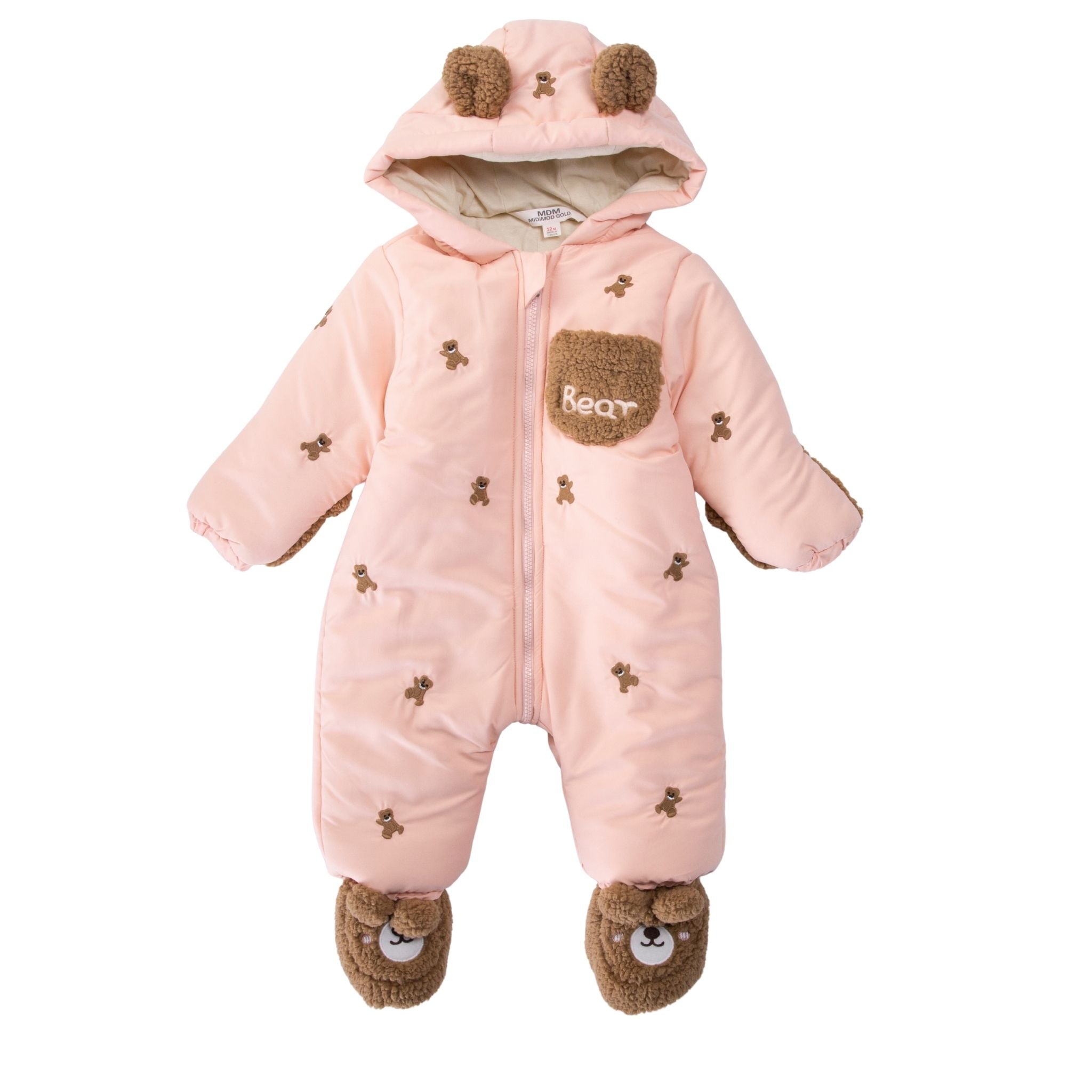 Midimod Kozmonot Pudra, kış aylarında bebeğinizin sıcacık kalmasını sağlayan şık ve kullanışlı bir tulumdur. Sevimli ayıcık detayları ve yumuşacık yapısıyla hem konfor hem de estetik sunar. Kapüşonlu tasarımı ve pelüş kulak figürleri ile dikkat çekerken, pratik fermuarı sayesinde kolay giydirilip çıkarılabilir.