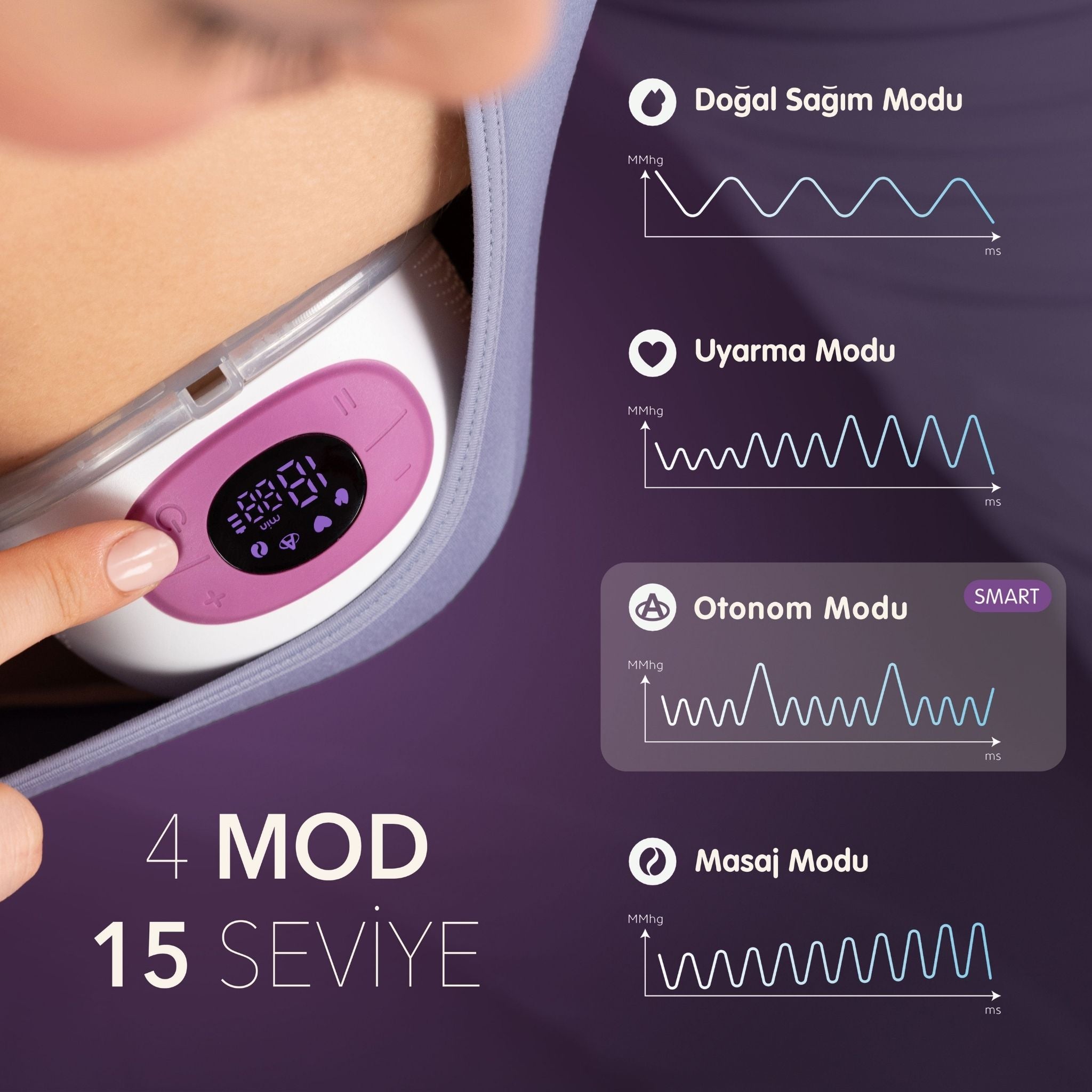 Annelerin günlük hayatını kolaylaştırmak için tasarlanan Mochi giyilebilir göğüs pompası, kablosuz ve hafif yapısıyla süt sağımında özgürlük sunar. Sessiz motoru sayesinde dikkat çekmeden kullanılabilir, şık ve kompakt tasarımıyla hem evde hem de dışarıda rahatça tercih edilebilir. Doğal emme hareketlerini taklit eden 4 farklı mod ve 15 seviye ayarıyla kişisel sağım deneyimi sağlar. Dijital ekran üzerinden kolayca kontrol edilebilen bu pompa, annelerin süt sağımını konforlu, hijyenik ve pratik hale getirir.