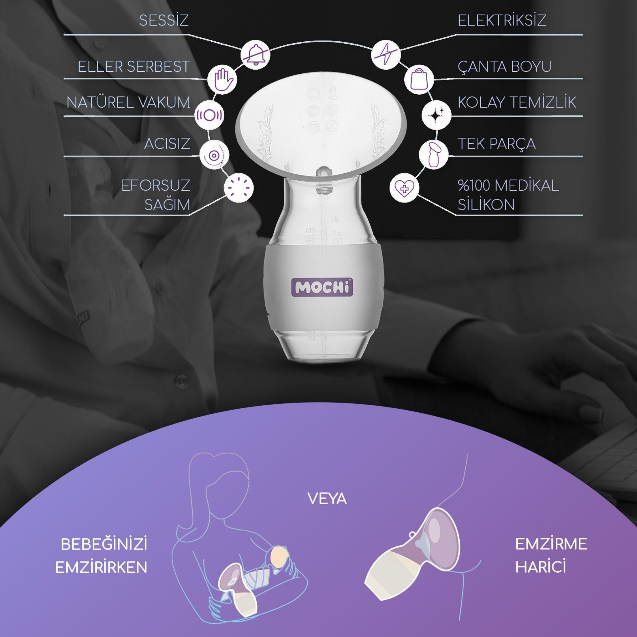 Mochi, sadece sağım yapmakla kalmaz; sütü saklamanıza ve bebeğinizi güvenle beslemenize de yardımcı olur. Doğal vakum etkisiyle süt kanallarını nazikçe uyarır, süt akışını destekler. Kompakt tasarımı sayesinde çantanızda kolayca taşınır.