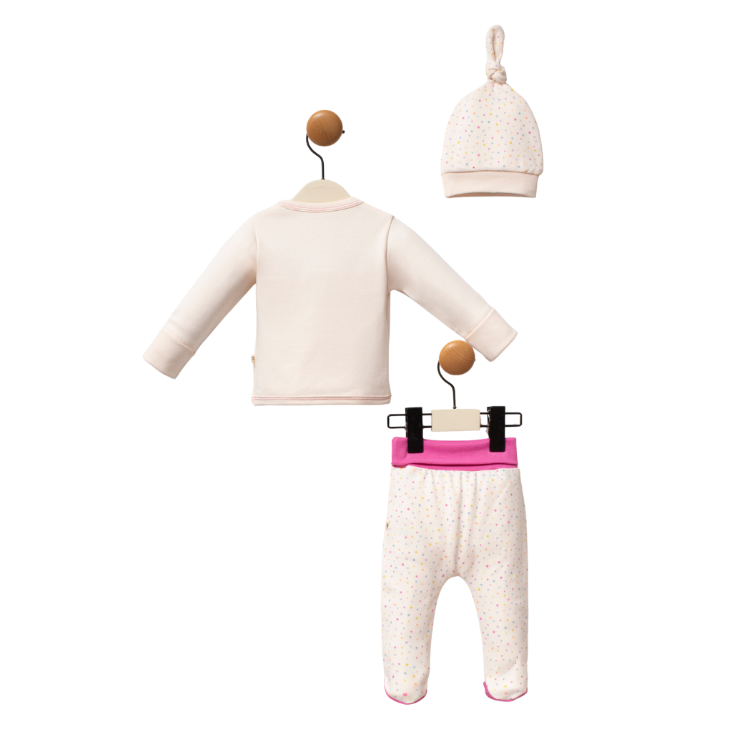 Moi Noi 3’lü Zıbın Takım Cat, yenidoğan bebeklerin hassas cilt yapısı göz önünde bulundurularak özenle tasarlanmıştır. %100 pamuk kumaştan üretilen bu özel set, nefes alabilen yapısı sayesinde bebeğinizin cildinin gün boyu rahat ve ferah kalmasına yardımcı olur. Doğal pamuk dokusu, tahriş riskini azaltarak güvenli bir kullanım sunar. Set; uzun kollu çapraz kapamalı üst, rahat kesimli alt ve uyumlu şapkadan oluşur. Çapraz kapama tasarımı, özellikle yenidoğan döneminde bebeği kolayca giydirip çıkarmaya olanak tanır. Yumuşak dikiş yapısı ve esnek kalıbı sayesinde bebeğin hareketlerini kısıtlamaz, konforlu bir kullanım sağlar. Ekru zemin üzerine işlenen sevimli kedi ve çiçek desenleri, takıma zarif ve sıcak bir görünüm kazandırır. Günlük kullanım için ideal olduğu gibi, yenidoğan hediyesi olarak da tercih edilebilecek şık ve fonksiyonel bir settir. Mevsim geçişlerinde ve serin havalarda bebeği rahatlıkla korur. Bebeğinizin konforunu, sağlığını ve şıklığını bir arada sunan Moi Noi 3’lü Zıbın Takım Cat, günlük kullanımda pratiklik arayan ebeveynler için ideal bir tercihtir.