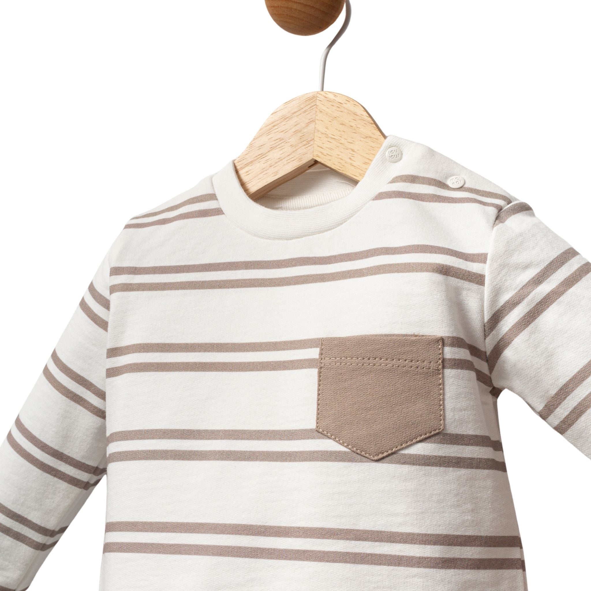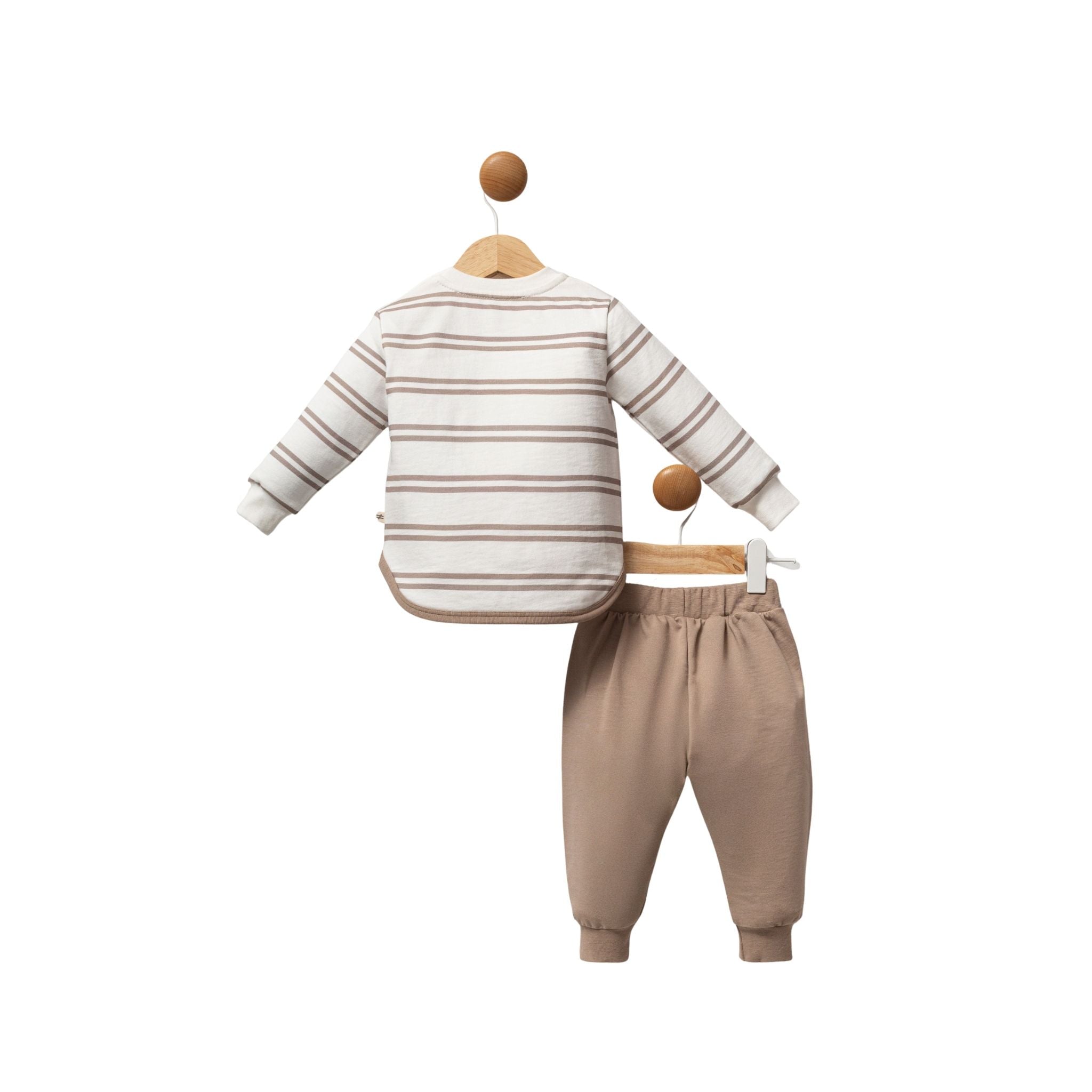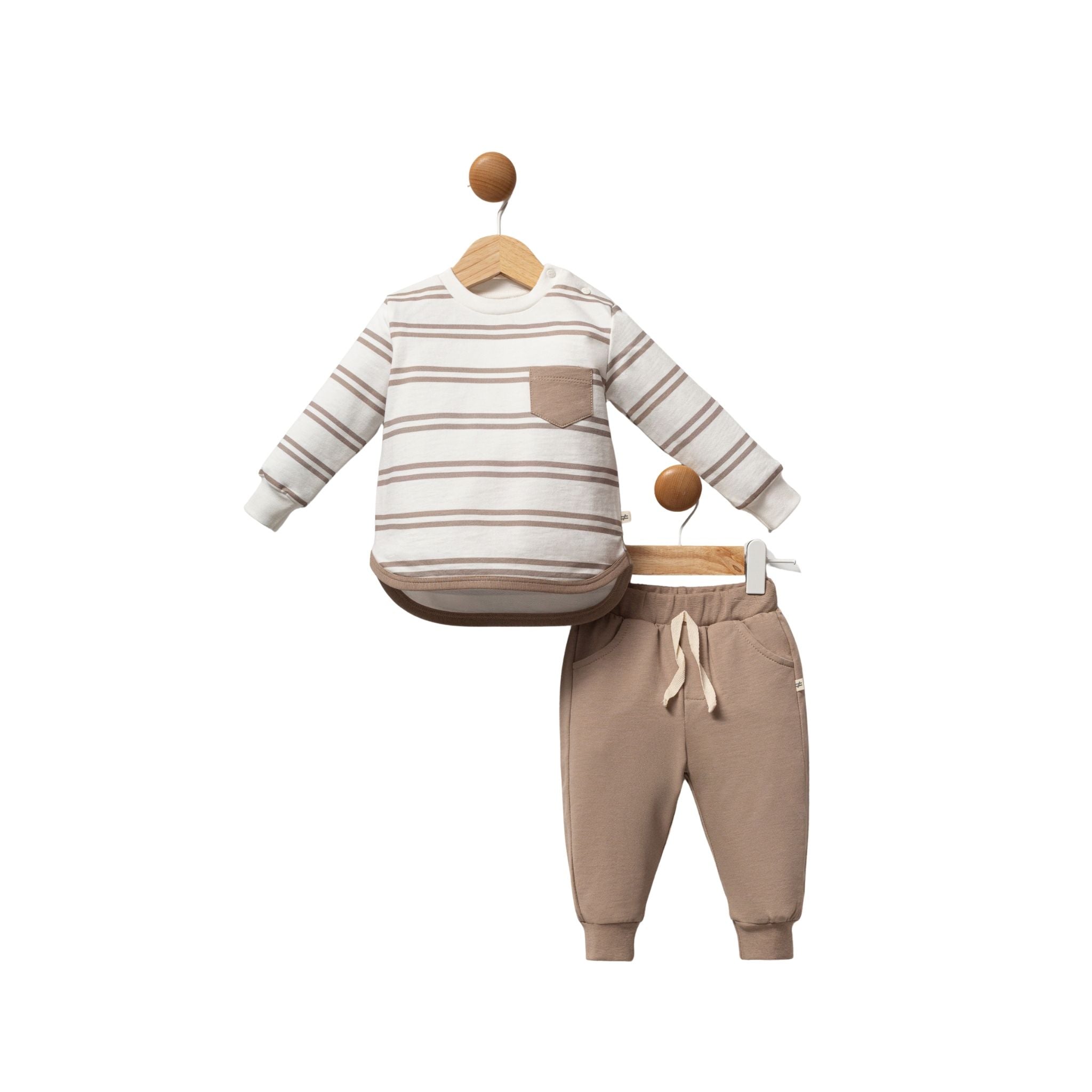 Moi Noi Erkek Takım Çizgili, modern çizgili deseni ve soft bej tonlarıyla öne çıkan şık bir çocuk giyim setidir. Üst parçasında beyaz zemin üzerine kahverengi-bej çizgiler ve pratik cep detayı bulunurken, alt parçası rahat kesimli bej eşofman altı ile kombini tamamlar. Günlük kullanım için hem şık hem de konforlu bir tercih sunar.