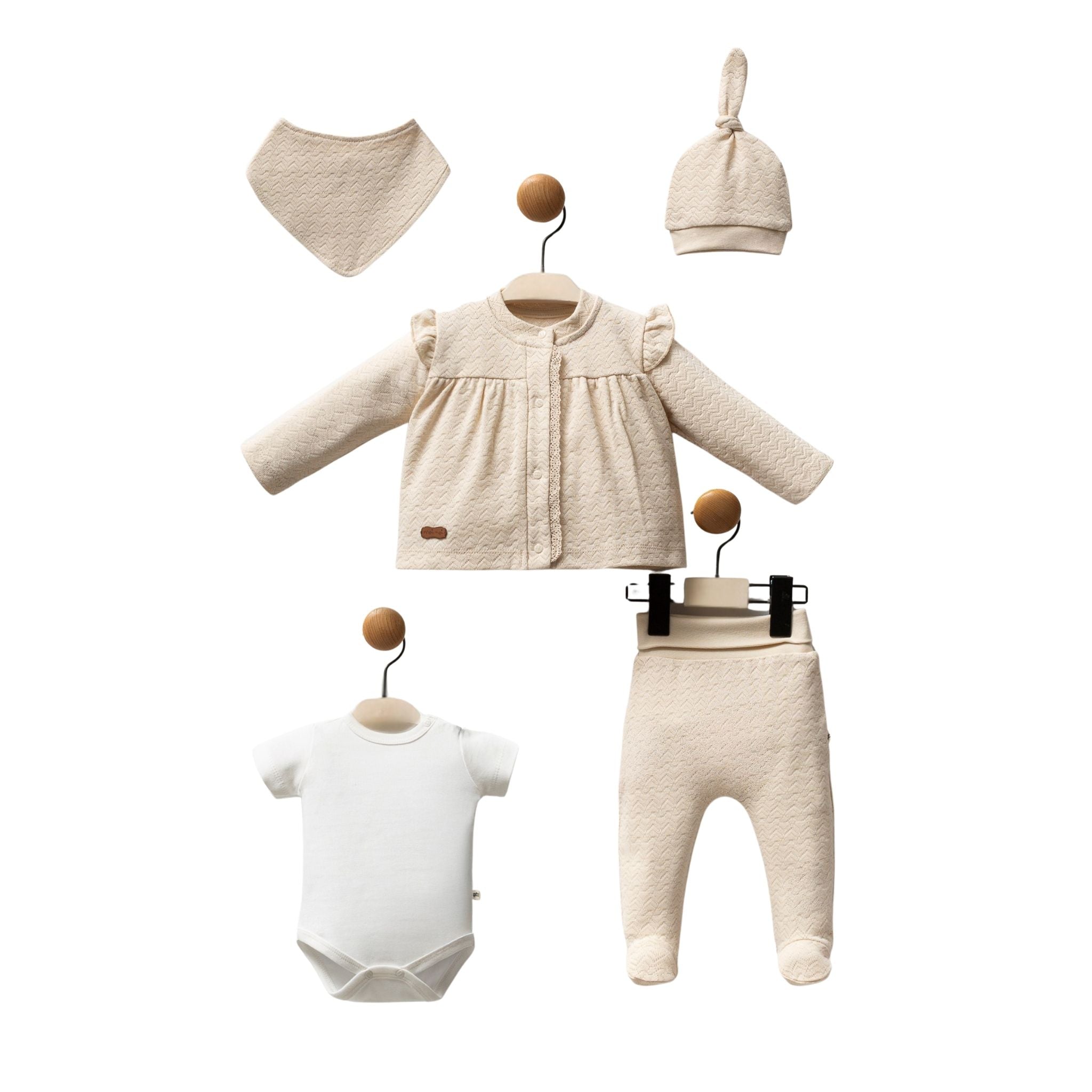 Moi Noi Kız 5’li Hastane Çıkışı, bebeğinizin ilk günlerinde ihtiyaç duyacağı parçaları bir araya getiren şık ve kullanışlı bir settir. %100 pamuk kumaşı sayesinde bebeğinizin hassas cildine zarar vermez, nefes alabilen yapısı ile terletmez. Zarif tasarımı, pastel tonları ve yumuşak dokusu ile hem konfor hem de estetik bir görünüm sunar. İlk günden itibaren güvenle kullanabileceğiniz bu set, anneler için pratik ve fonksiyonel bir çözümdür.