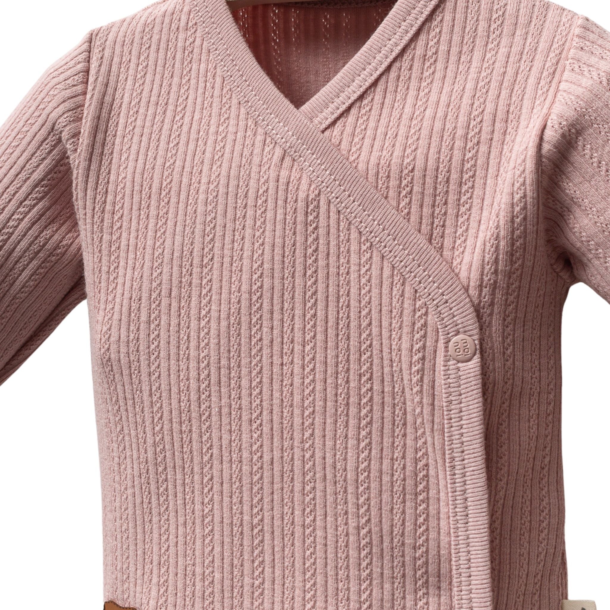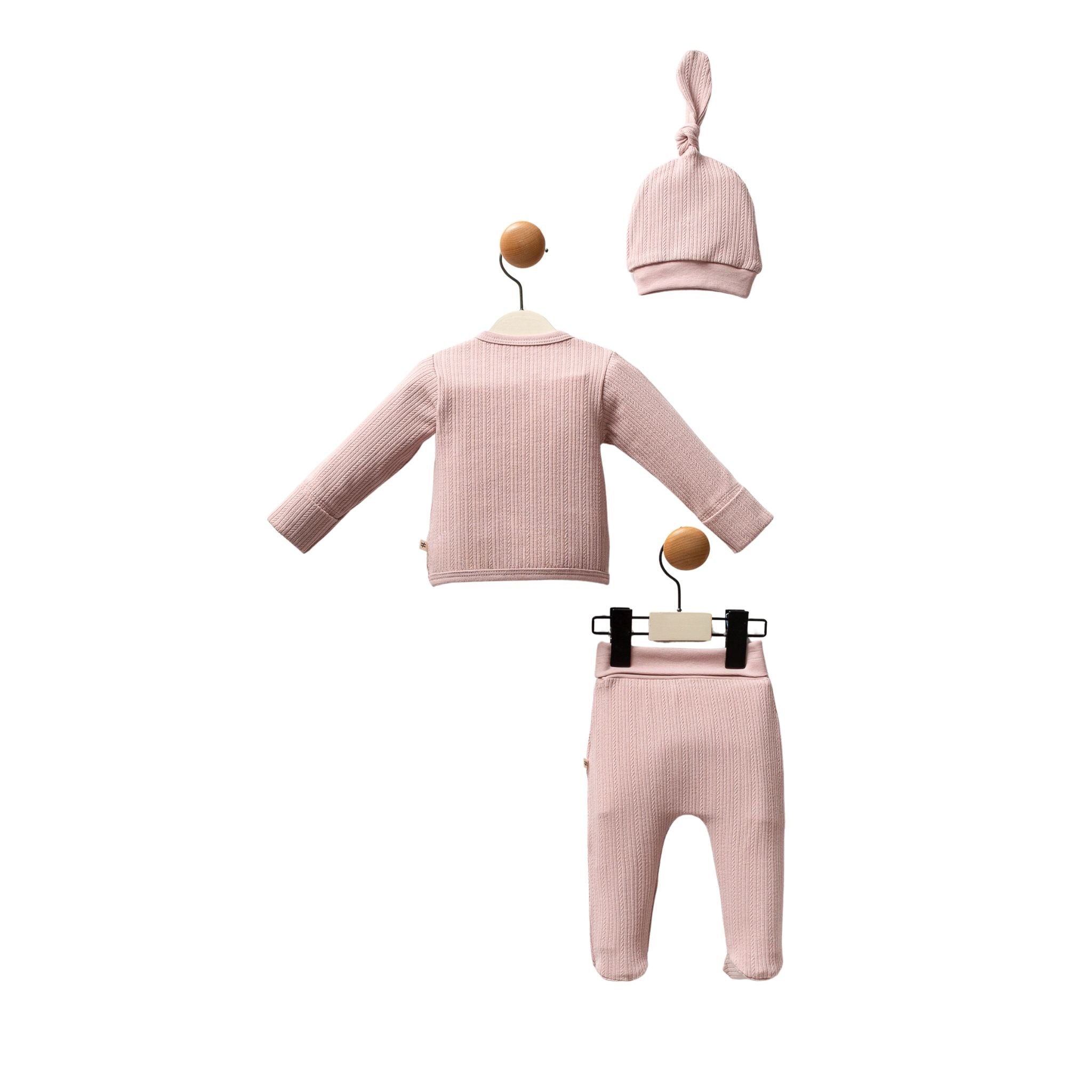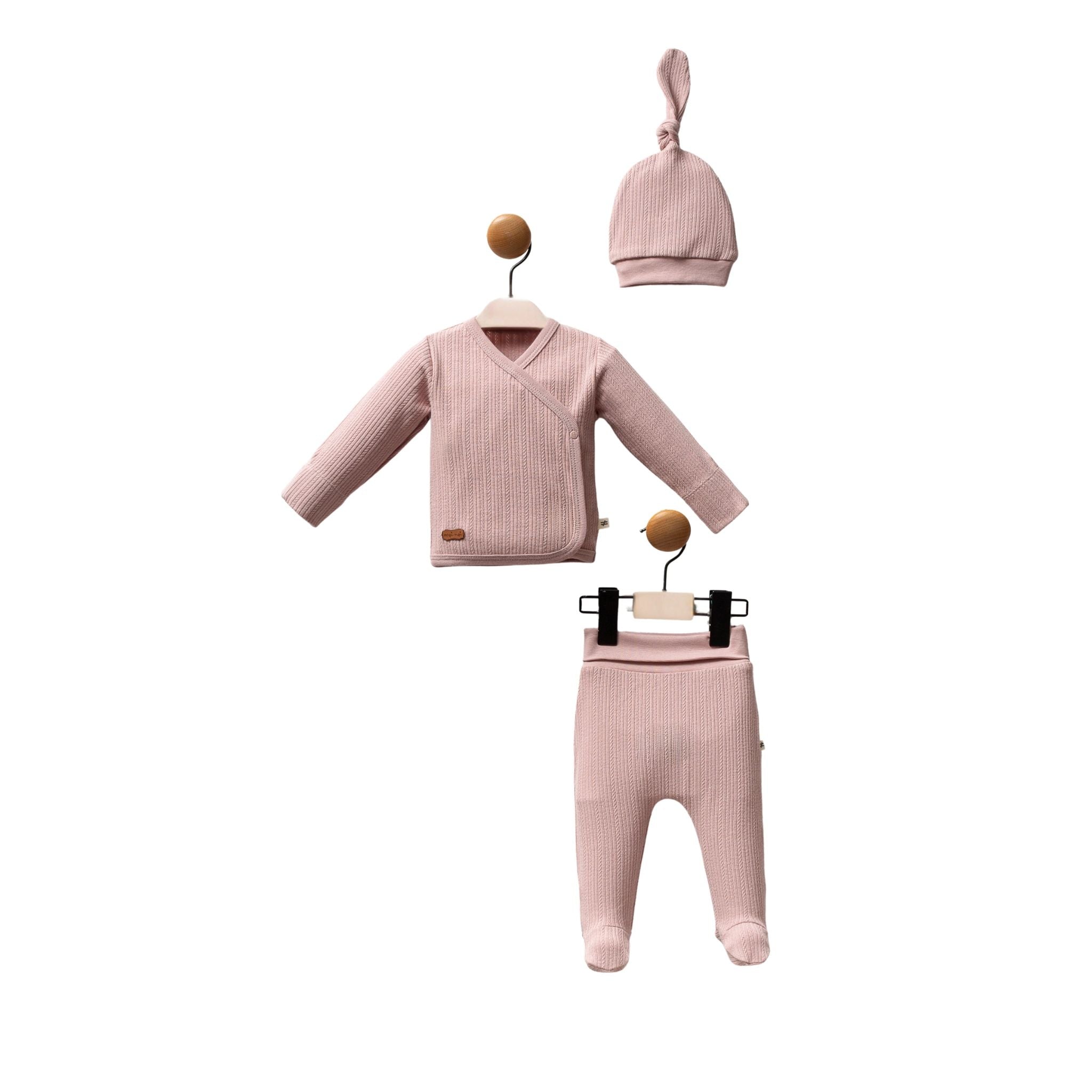 Moi Noi Kız Zıbın Takım Mürdüm rengi ve 0-3 ay bebekler için özel tasarımı ile şıklığı ve konforu bir araya getiriyor. %100 pamuktan üretilen bu takım, bebeklerin narin ciltleri için en uygun kumaş seçeneğini sunar. Yumuşak dokusu sayesinde gün boyu rahatlık sağlar. Üç parçadan oluşan takım; çapraz yaka detaylı zıbın, ayaklı pantolon ve düğüm detaylı şapka ile tamamlanmıştır. Çapraz yaka tasarımı, bebeğin kolayca giydirilmesine yardımcı olurken, ayaklı pantolon modeli bebeğin sıcak kalmasını sağlar. Mürdüm tonlarının modern şıklığı ile günlük kullanımda da özel günlerde de tercih edilebilir. 30 derecede yıkanabilir özelliği ile bakım kolaylığı sağlar. Sağlığa zararlı madde içermez, bebeklerin hassas cildine uyumludur. Bu zarif zıbın takımı, hem sağlıklı kumaş yapısı hem de modern tasarımıyla bebeklerin gardırobunda vazgeçilmez bir parça olmaya adaydır.