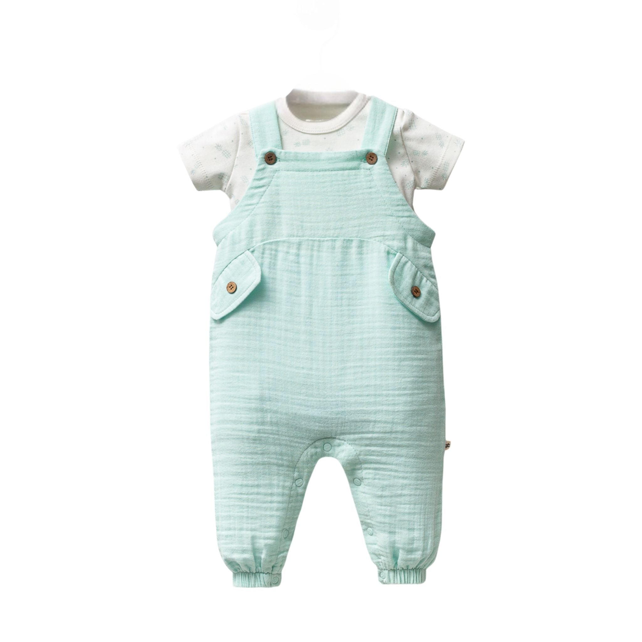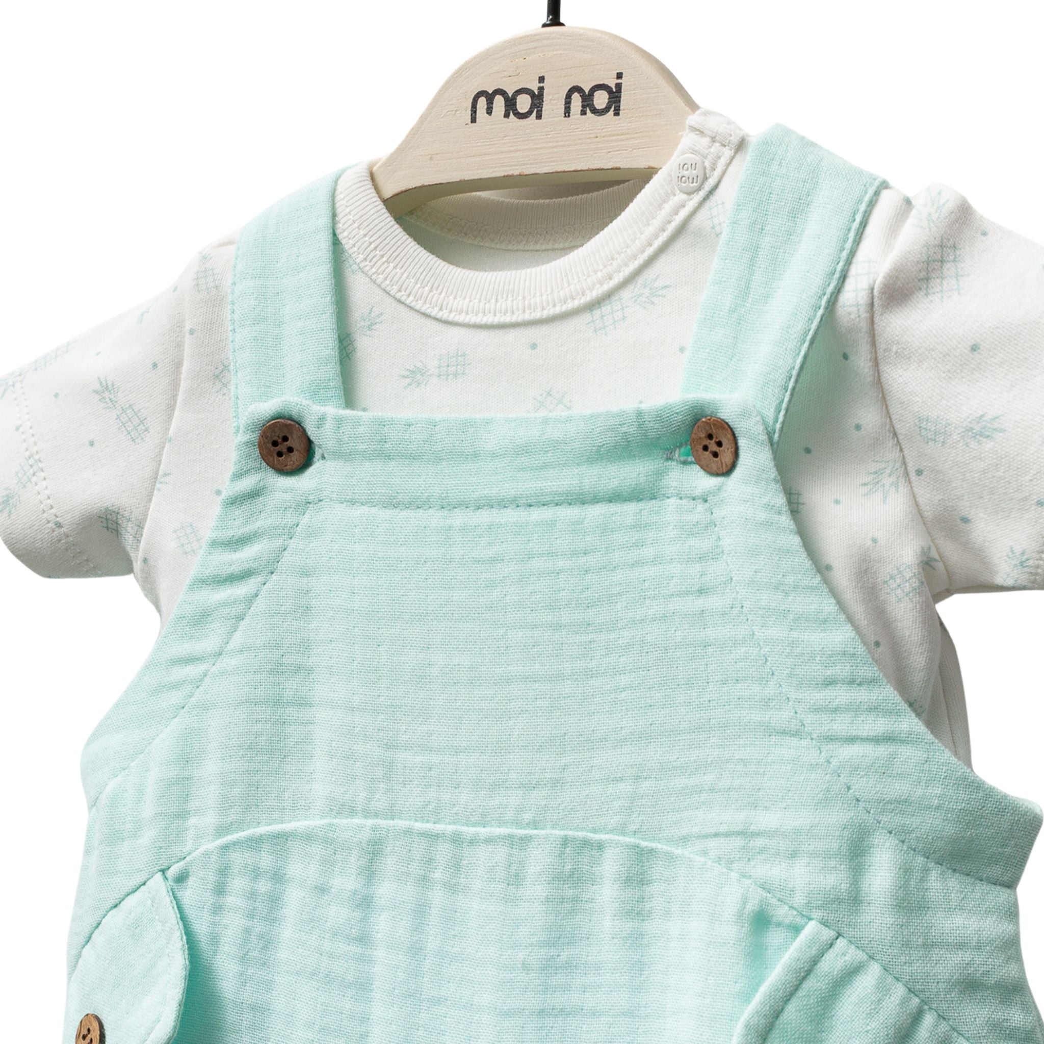 Moi Noi Müslin Salopet, hem konforlu hem de stil sahibi bebek kombinlerinin vazgeçilmez parçası! %100 pamuklu müslin kumaştan üretilen bu özel tasarım, bebeklerin hassas cildine dost, nefes alabilen ve yumuşacık bir yapıya sahiptir. Önde yer alan dekoratif cepler ve ahşap düğme detaylarıyla sade ama şık bir görünüm sunar. Elastik paçaları sayesinde hareket kolaylığı sağlar ve bebeğin altını rahatça değiştirebilmeniz için alt kısmı çıtçıtlı olarak tasarlanmıştır.Moi Noi Müslin Salopet ile bebeğiniz her an rahat, her an şık! Yumuşacık dokusu ve kullanışlı detaylarıyla annelerin favorisi olmaya aday.
