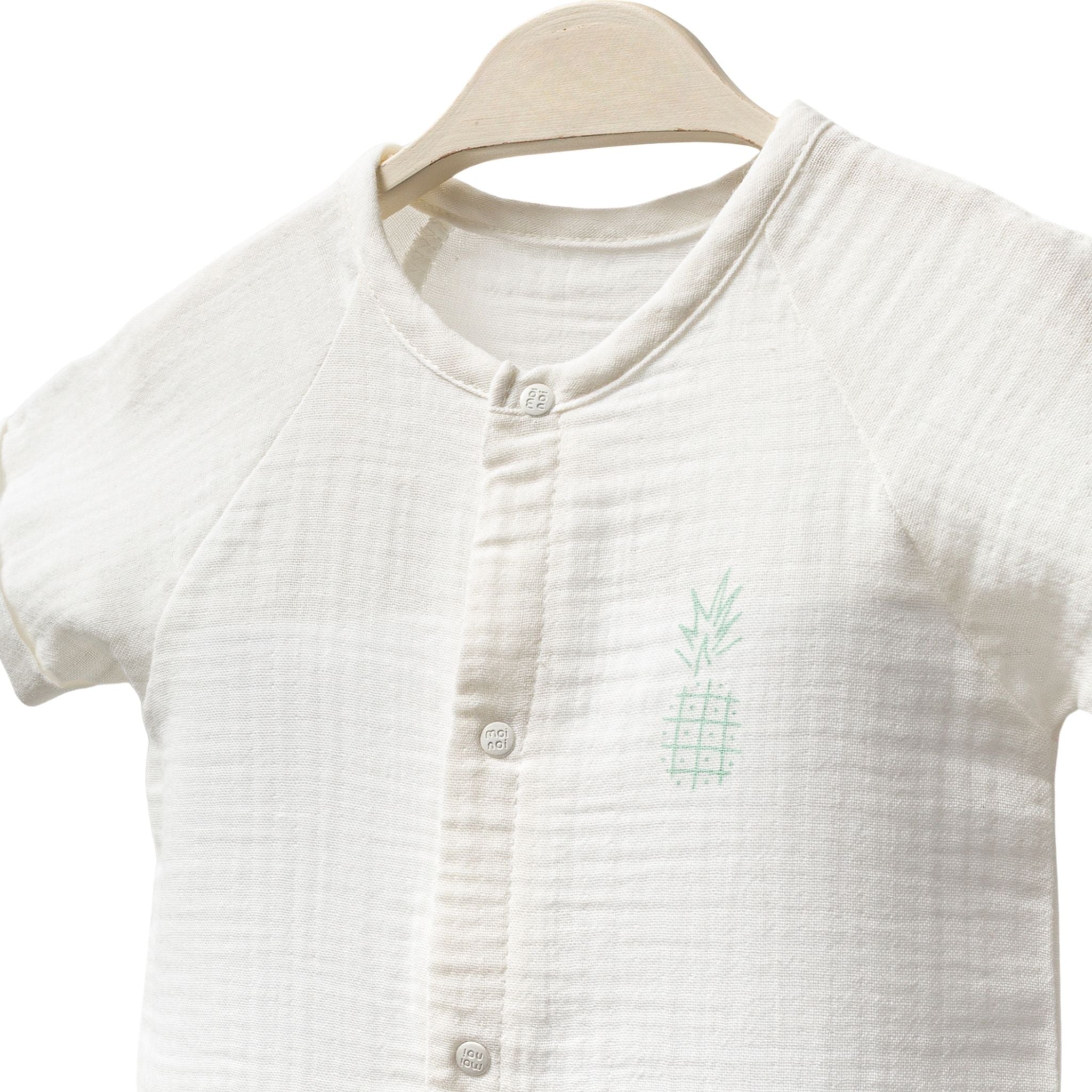 Yumuşacık dokusu ve nefes alabilen yapısıyla Moi Noi Müslin Şort Tulum, bebeklerin sıcak günlerde rahatça hareket etmesi için özel olarak tasarlanmıştır. Saf pamuktan üretilmiş hafif müslin kumaşı sayesinde bebeğinizin cildi serin kalır, ferah bir konfor sunar. Doğal rengi ve ananas baskı detayıyla sade ama şık bir görünüm kazandırır. Pratik çıtçıtlı tasarımı ile kolay giydirilip çıkarılabilir; alt değiştirme anlarını zahmetsiz hale getirir. Hassas bebek cildiyle mükemmel uyum gösteren bu tulum, yazlık bebek gardırobunun vazgeçilmez parçalarından biri olmaya aday.