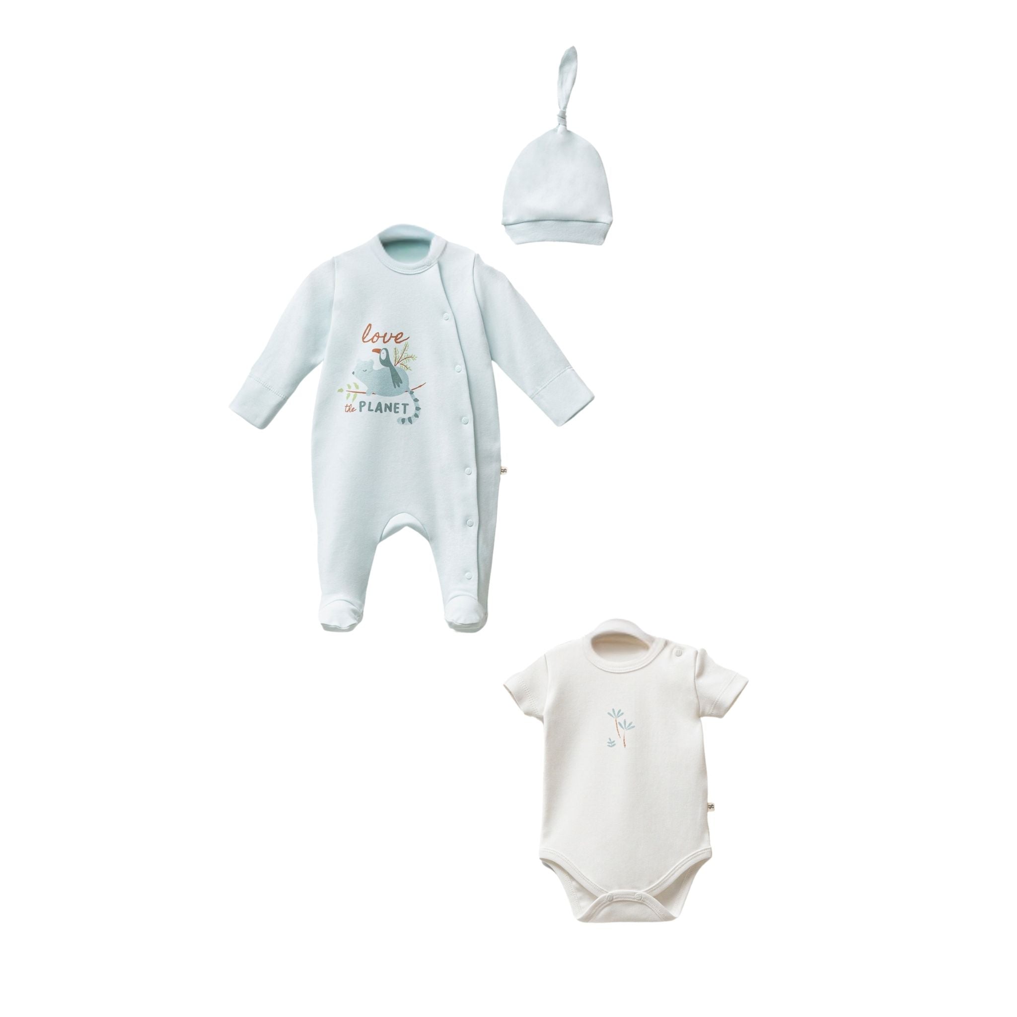 Moi Noi Palmiye Şapkalı Tulum Body Takım, tropikal detayları modern tasarımla buluşturan, bebeklerin konforunu ön planda tutan şık ve kullanışlı bir settir. %100 pamuk kumaştan üretilen bu üçlü takım, bebeğinizin hassas cildiyle uyumlu yumuşak dokusuyla gün boyu rahatlık sağlar. Set içerisinde bulunan kısa kollu body, şapka ve tulum uyum içinde tasarlanmış olup, palmiye desenleriyle yaz mevsiminin enerjisini yansıtır. Body iç katmanda cildi korurken, tulum rahat kesimiyle özgür hareket imkânı sunar. Şapka ise başı güneşten koruyarak kombini tamamlar. Günlük kullanım, seyahat ya da dış mekân aktiviteleri için mükemmel olan bu takım, annelerin hem pratiklik hem de şıklık arayan tercihleri arasında yer alır.