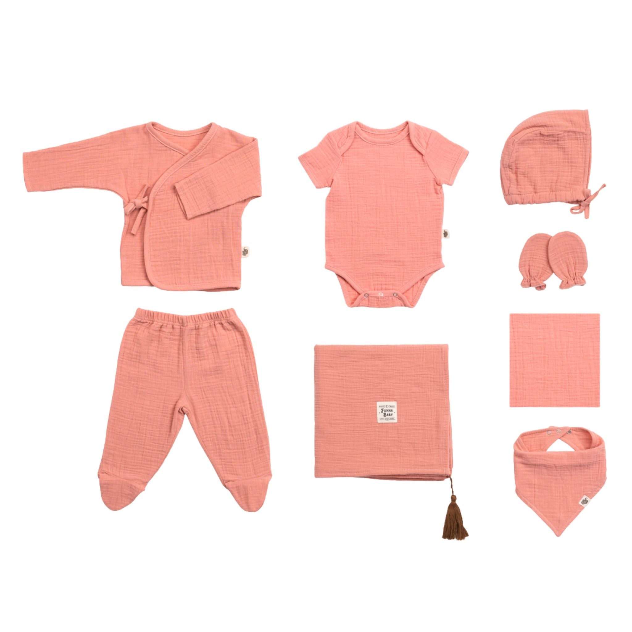 Funna Baby Müslin Yenidoğan Seti 8 Parça Yavruağzı, ilk aylarda bebeğinizin tüm temel giyim ihtiyaçlarını karşılamak üzere hazırlanmış özel bir settir. Yumuşak dokulu müslin kumaşı, hassas ciltlere dost yapısıyla öne çıkar. Hafif, nefes alabilen ve doğal yapısı sayesinde yenidoğan bebeklerin gün boyu konfor içinde kalmasını sağlar. Setin tüm parçaları sade, şık ve fonksiyonel bir tasarım anlayışıyla üretilmiş olup, günlük kullanım için oldukça idealdir. Bu yenidoğan seti, hem pratik kullanım kolaylığı hem de yüksek kalite standartlarıyla ebeveynlerin sıklıkla tercih ettiği bebek tekstil ürünlerinden biridir.