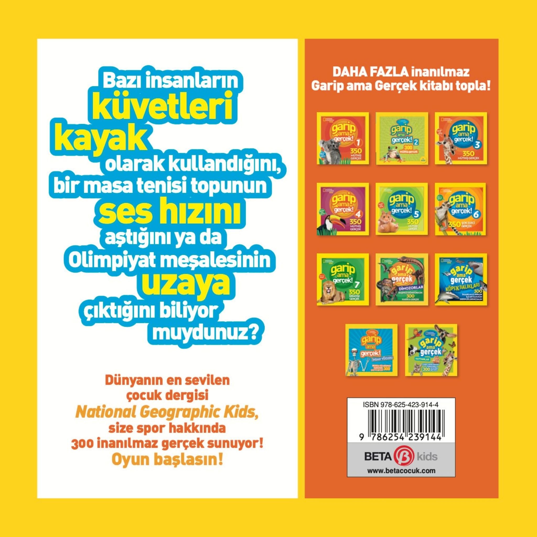 Spor dünyası sandığınızdan çok daha tuhaf, eğlenceli ve şaşırtıcı! National Geographic Kids’in popüler Garip ama Gerçek! serisinin spora özel bu kitabı, atletizmden futbola, basketboldan yüzmeye ve ekstrem sporlara kadar yüzlerce ilginç bilgiyle çocuklara bambaşka bir keşif deneyimi sunuyor. Her sayfasında “Gerçekten böyle bir şey olabilir mi?” dedirten eğlenceli spor bilgileriyle dolu olan bu kitap, renkli görselleri ve kısa, dikkat çekici anlatımıyla çocukların ilgisini çekerken, aynı zamanda bilgi dağarcıklarını da geliştiriyor. Spor tutkunu olsun ya da olmasın, her çocuk bu kitapta şaşırtıcı bilgilerle tanışacak. National Geographic Kids Garip ama Gerçek! Spor, sporla ilgilenen ya da sadece şaşırtıcı gerçekleri keşfetmeyi seven çocuklar için hem öğretici hem de keyifli bir başucu kitabıdır.