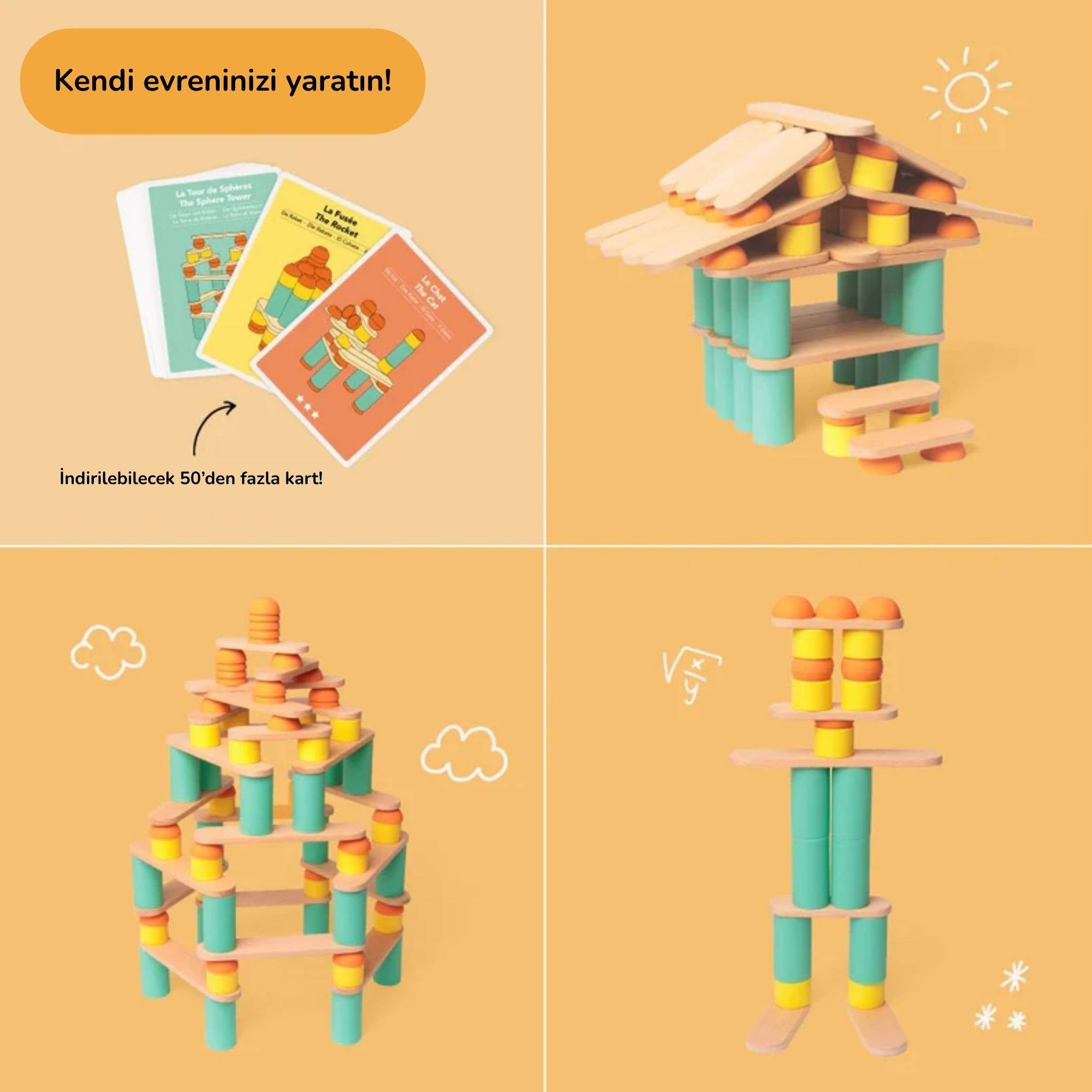 Yaratıcı kartlar, çocuklara farklı figür ve yapı örnekleri sunarak hayal gücünü harekete geçirir. Çocuklar kartlardaki modelleri birebir kopyalayabileceği gibi, bu örneklerden ilham alarak kendi özgün yapılarını da oluşturabilir. Hayvan figürleri, araçlar, kuleler ve soyut yapılar sayesinde oyun her seferinde farklı bir deneyime dönüşür. Zorluk seviyeleri arttıkça çocukların planlama, dikkat ve yapı dengeleme becerileri de gelişir. Bu yönüyle Oppi Stix Yaratıcı Kartlar, hem bireysel oyunlarda hem de ebeveyn eşliğinde oynanan rehberli oyunlarda etkili bir öğrenme aracı olarak öne çıkar.