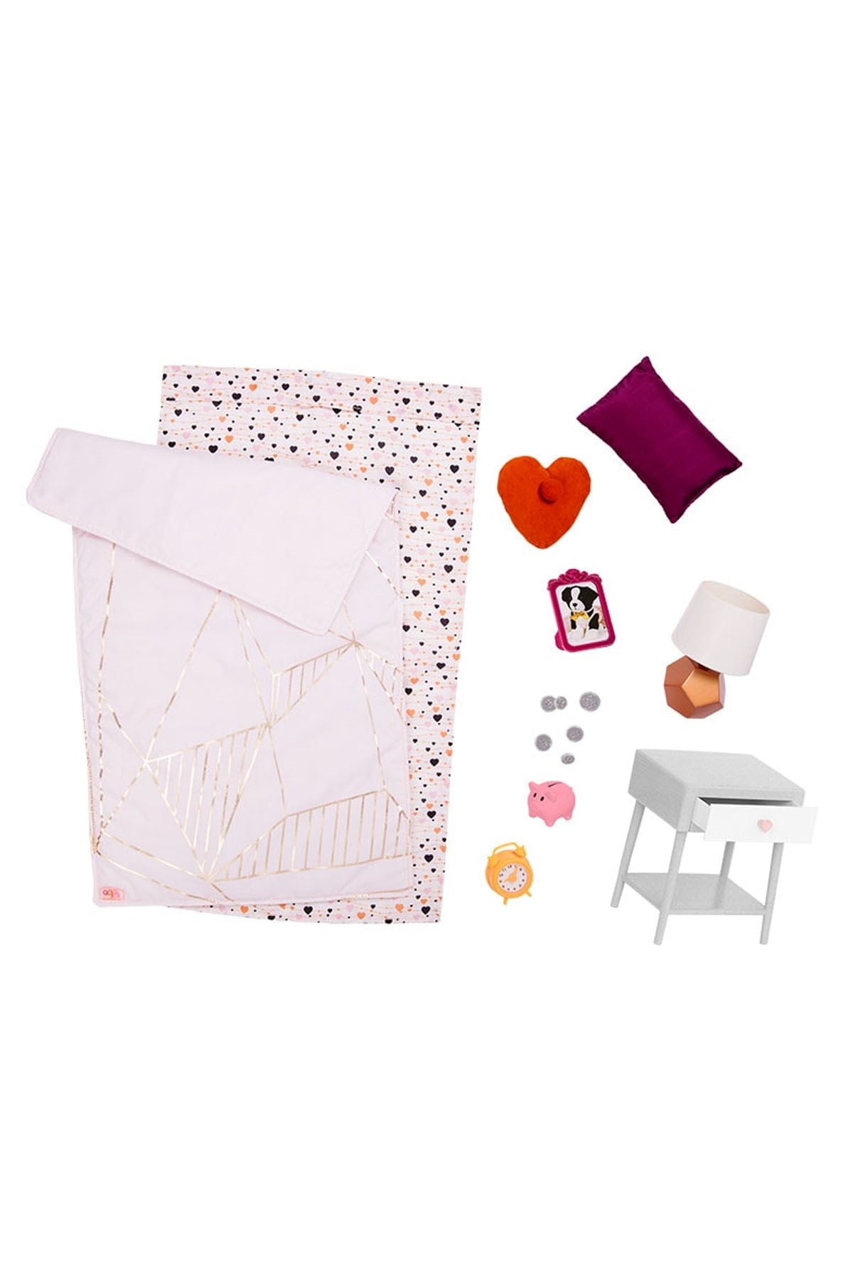 Our Generation nevresim takımı ve komodin seti, skstra stil için gerçekçi ayrıntılara sahip sevimli mini mobilyalarla birlikte gelir. Rol yapma lambasını, ayakta duran resim çerçevesini ve oyuncak çalar saati tutmak için komodini kullanın; hatta oyuncak bebeklerinizin biraz daha dinlenmesi için kadranı kullanarak saati değiştirebilirsiniz. Diğer eğlenceli aksesuarları saklamak için çekmeceyi açın ve 6 OG madeni parayı kumbaraya koyabilir veya kumbaradan çıkartabilirsiniz. Şık çarşaf ve rahat puantiyeli yorgan, Our Generation Dream Ranzalar veya Sweet Dreams Scrollwork yatak ile kendi başlarına harika çalışıyor!