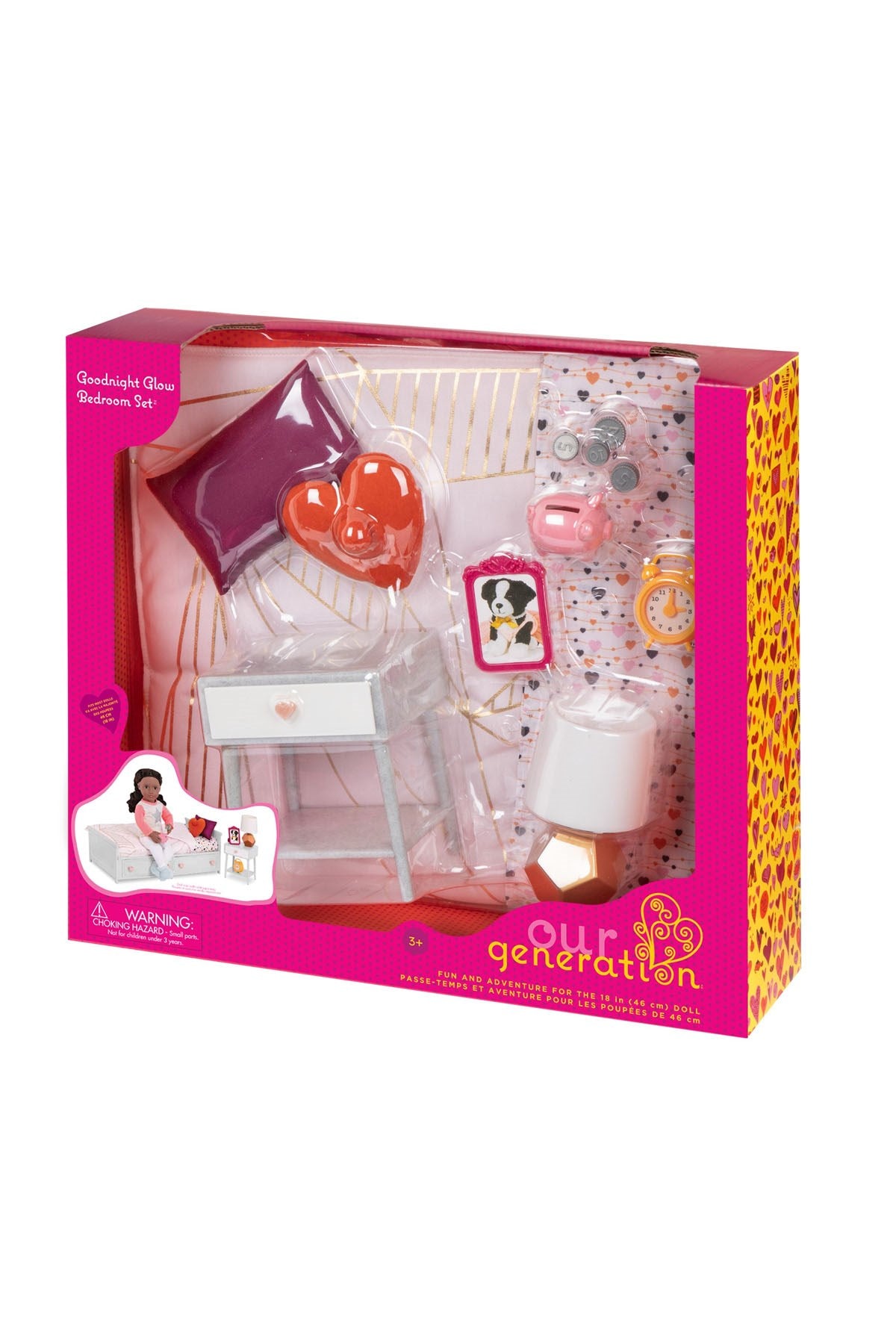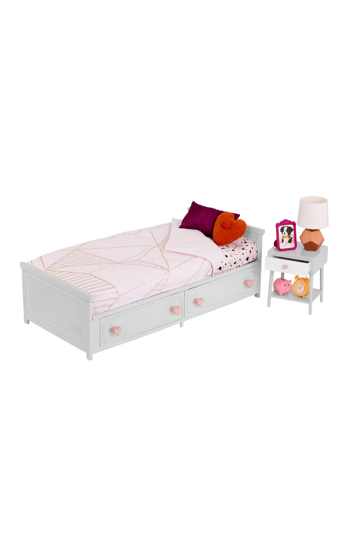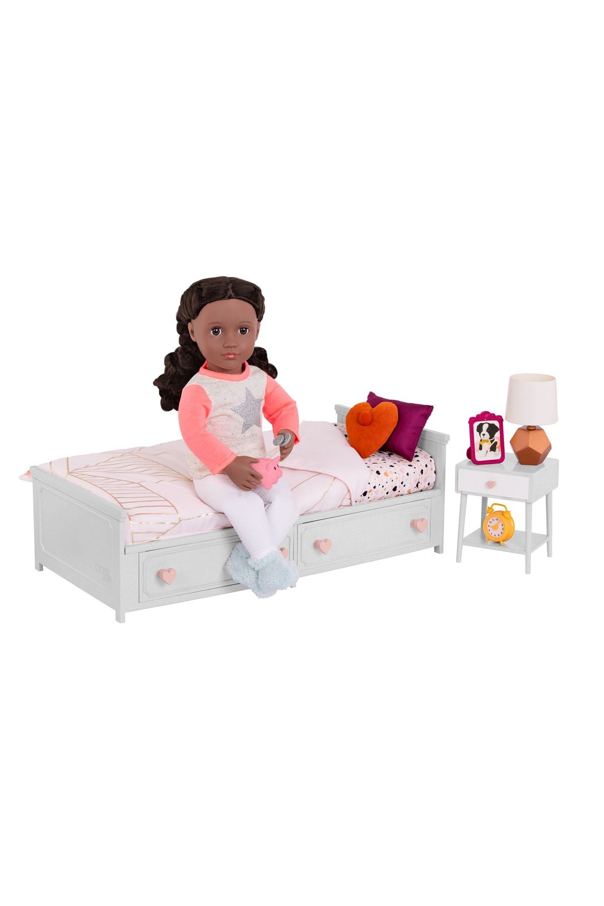 Our Generation nevresim takımı ve komodin seti, ekstra stil için gerçekçi ayrıntılara sahip sevimli mini mobilyalarla birlikte gelir. Rol yapma lambasını, ayakta duran resim çerçevesini ve oyuncak çalar saati tutmak için komodini kullanın; hatta oyuncak bebeklerinizin biraz daha dinlenmesi için kadranı kullanarak saati değiştirebilirsiniz. Diğer eğlenceli aksesuarları saklamak için çekmeceyi açın ve 6 our generation madeni parayı kumbaraya koyabilir veya kumbaradan çıkartabilirsiniz. Şık çarşaf ve rahat puantiyeli yorgan, Our Generation Dream Ranzalar veya Sweet Dreams Scrollwork yatak ile kendi başlarına harika çalışıyor!