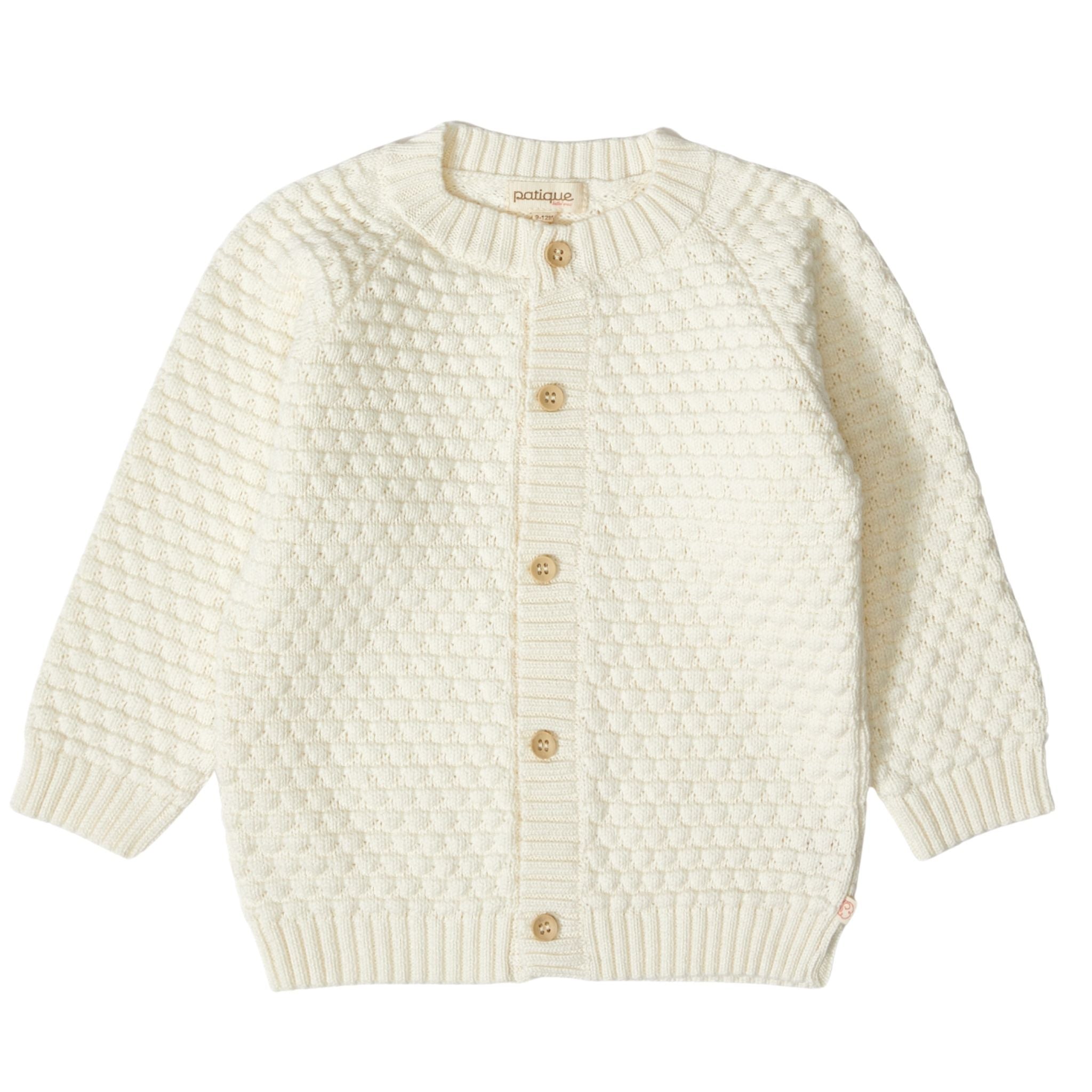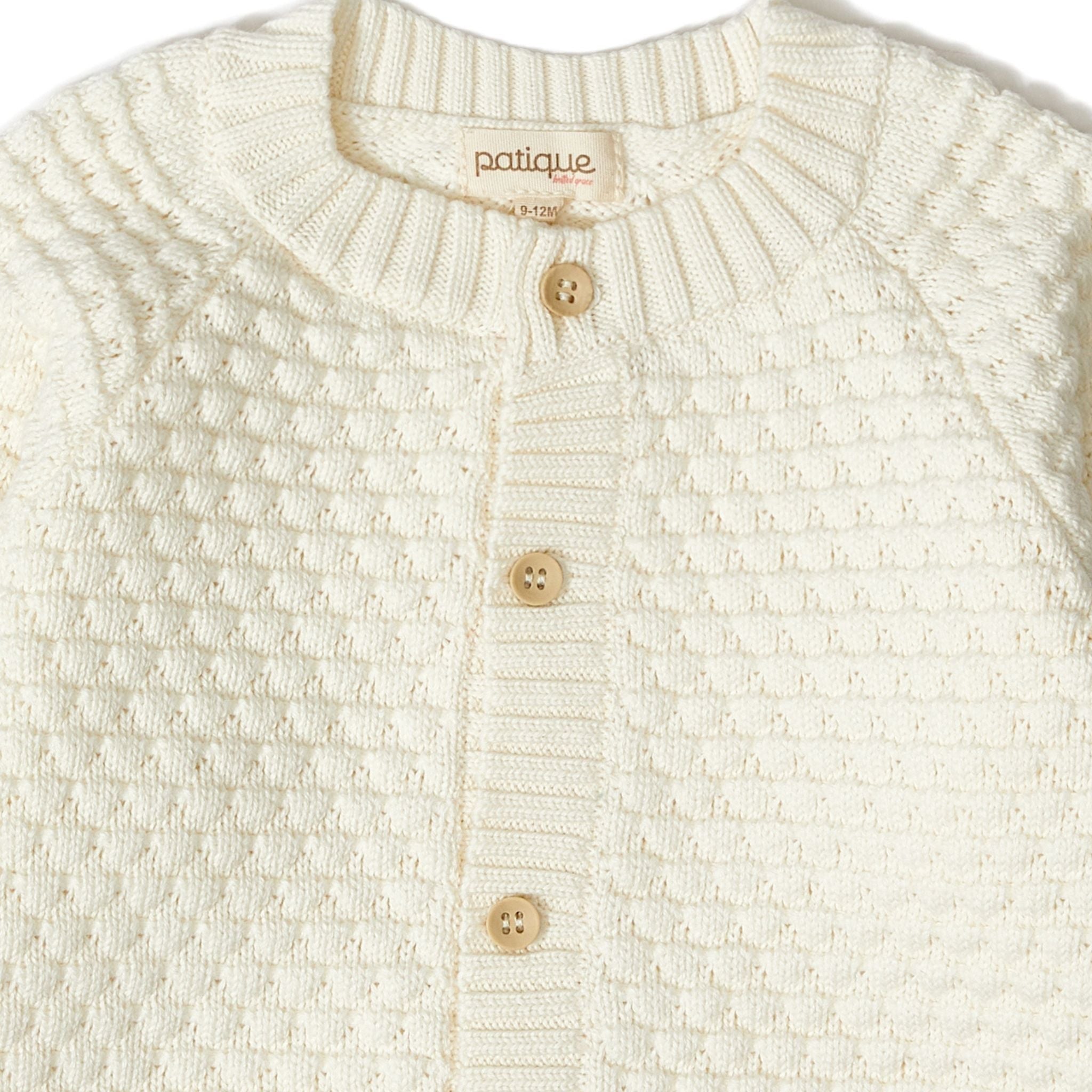 Patique Desenli Hırka Ekru, %100 organik pamuk kullanılarak GOTS sertifikasıyla üretilmiştir ve bebeklerin hassas ciltleri için güvenli bir seçenek sunar. Yumuşak triko dokusu ve nefes alabilir yapısıyla sonbahar ve kış aylarında sıcak ve rahat kullanım sağlar. Ekru rengi ve desenli tasarımı ile hem şık hem de günlük kullanım için idealdir. Patique Desenli Hırka Ekru, bebeklerin konforunu ve şıklığını bir araya getiren, sonbahar/kış döneminin ideal parçalarından biridir.