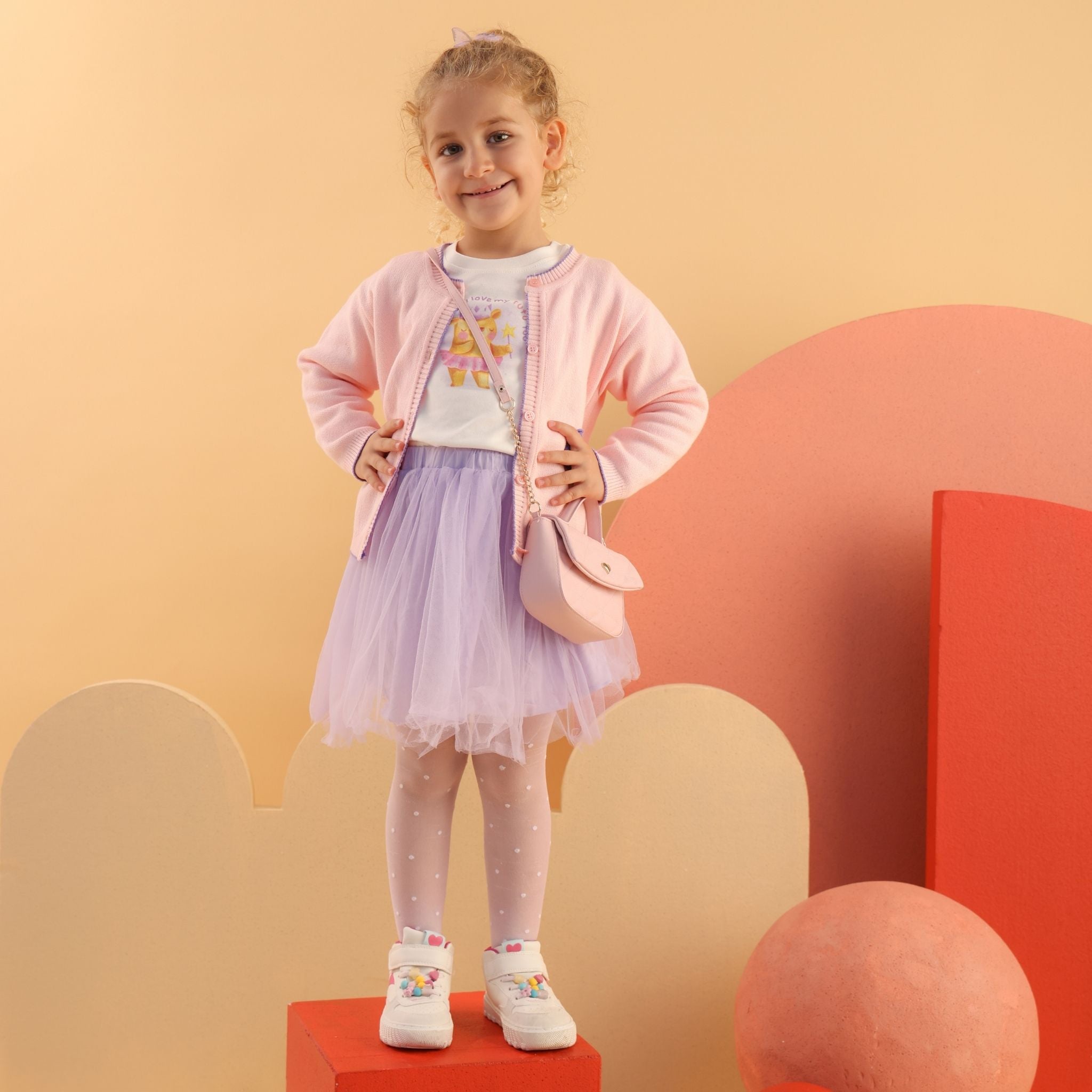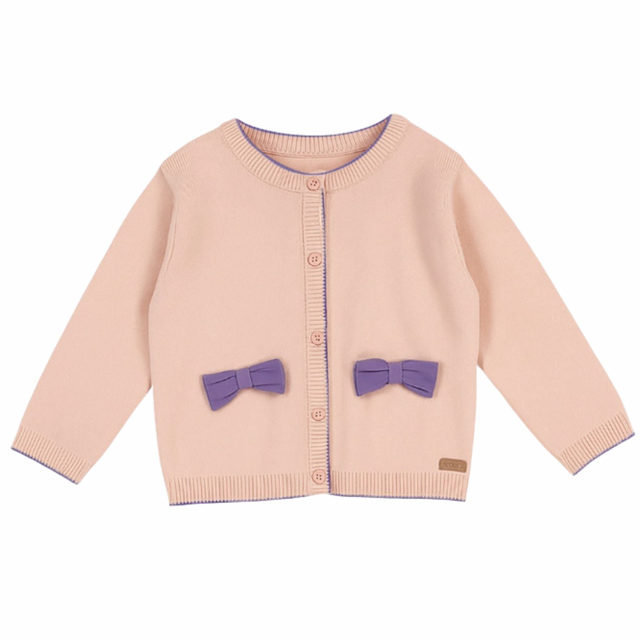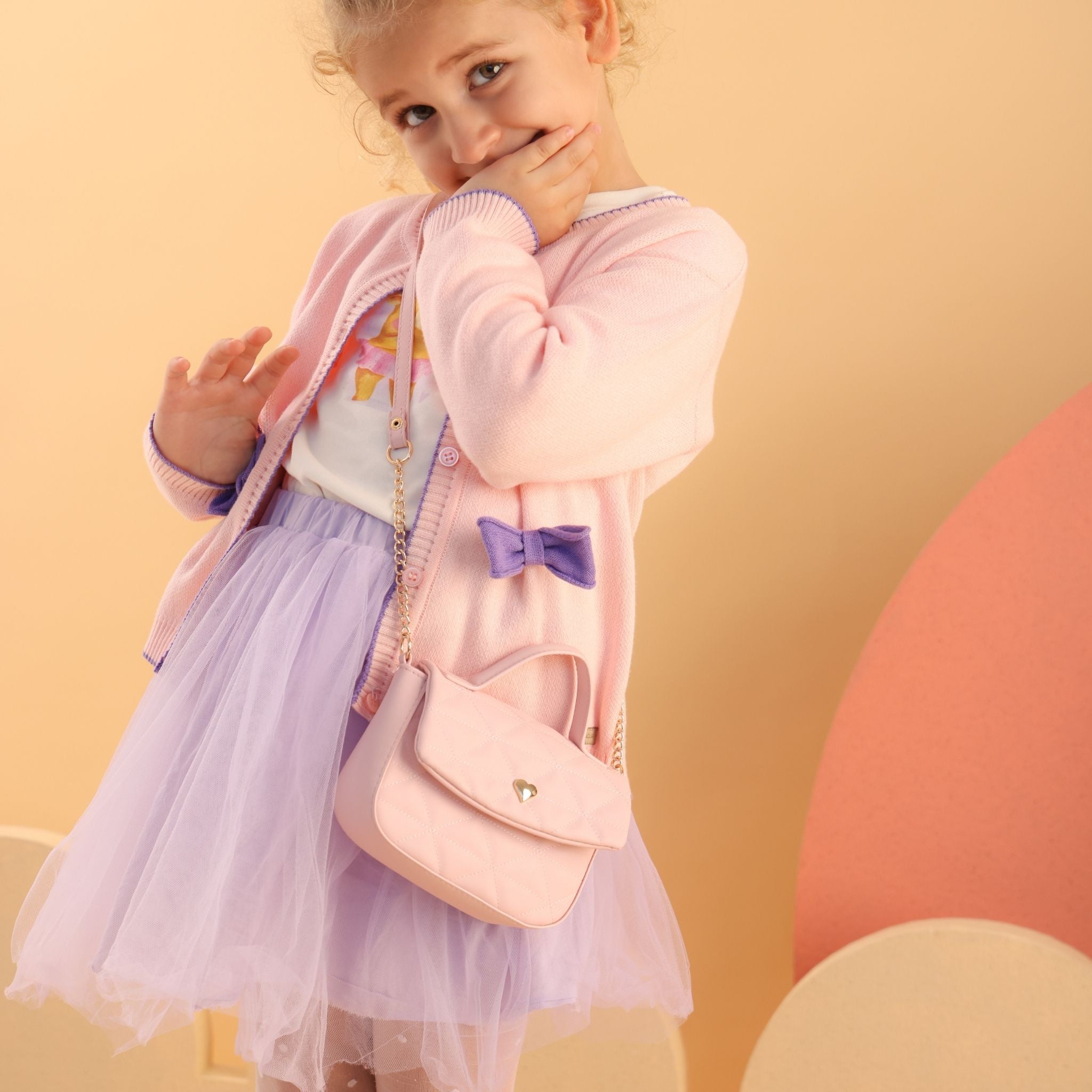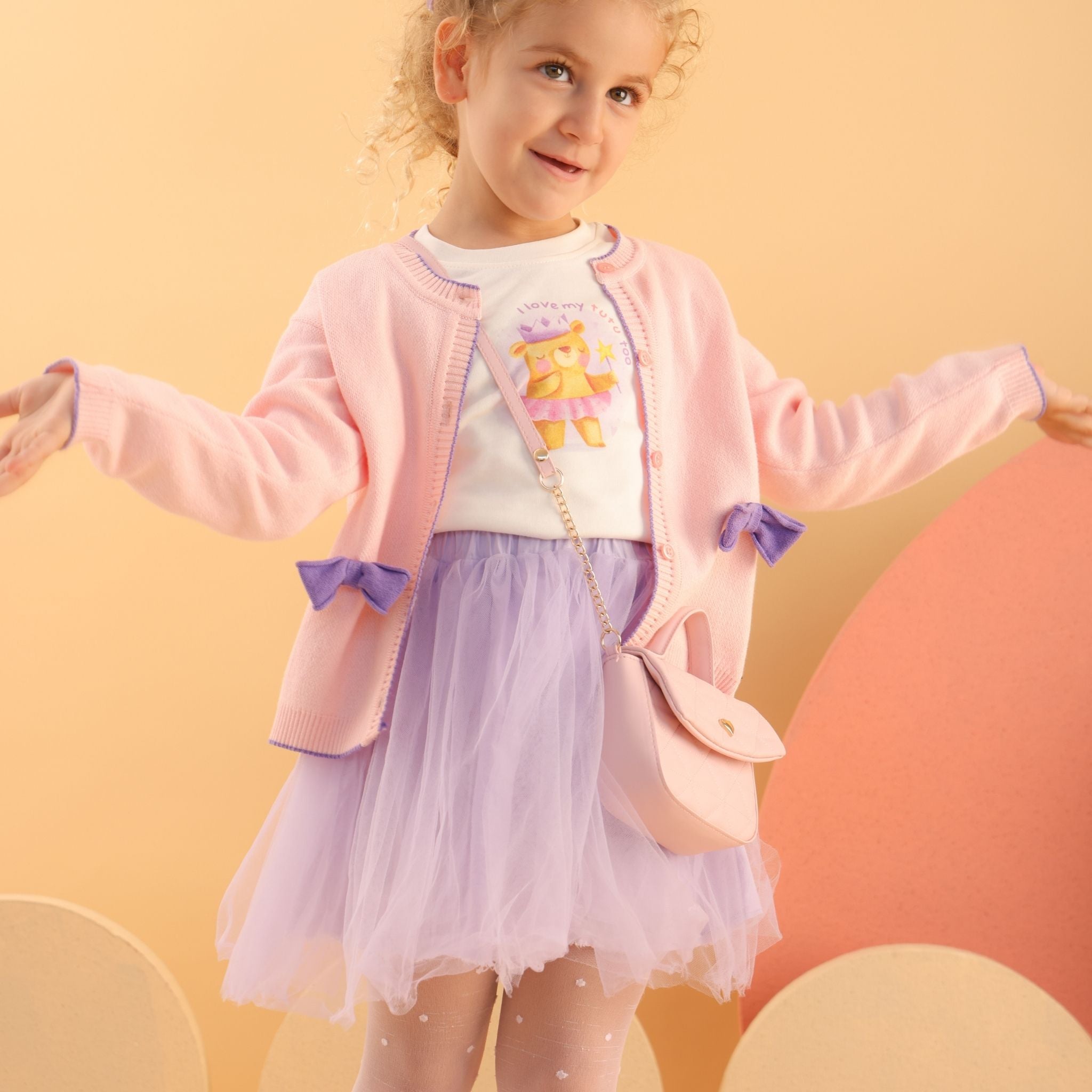 Patique fiyonk cepli triko hırka, kız çocuklarının gardırobuna zarif ve modern bir dokunuş eklemek için tasarlanmış yumuşak ve konforlu bir üst giyim seçeneğidir. Pudra tonundaki şık rengi, hırkanın iki yanında yer alan mor fiyonk detaylarıyla birleşerek romantik ve zarif bir görünüm oluşturur. Örgü dokusunun yumuşak yapısı sayesinde çocukların hassas cildine uyum sağlar, gün boyu konforlu kullanım sunar. Kaliteli triko kumaşı esnek bir yapı sunar ve hırkanın formunu uzun süre korumasına yardımcı olur. İnce mor biyeli kenar detayları ürüne sade ama dikkat çekici bir karakter kazandırır. Düğmeli yapısı sayesinde kolay giyilip çıkarılabilir, hem günlük kombinlerde hem de özel günlerde rahatlıkla kullanılabilir. Etek ve bilek kısmındaki ribanalı tasarım dayanıklılığı artırırken, hırkanın daha düzenli bir duruş sergilemesini sağlar. Elbiseler, etekler ve pantolonlarla kolayca eşleşen bu model, aynı zamanda bahar ve sonbahar aylarında ideal bir tamamlayıcıdır.