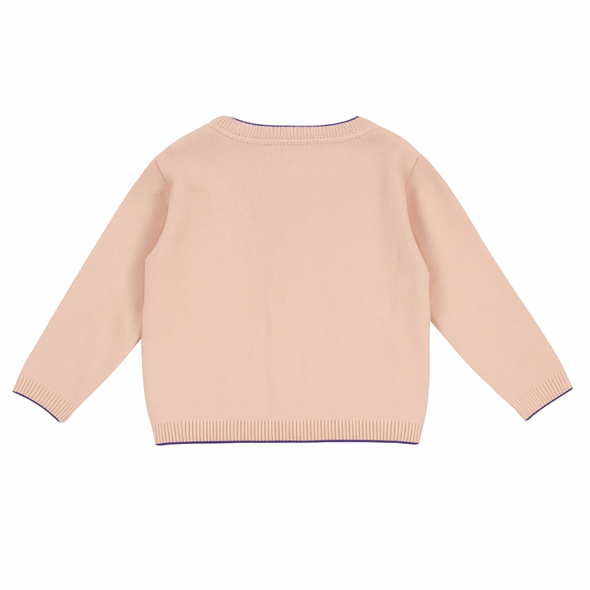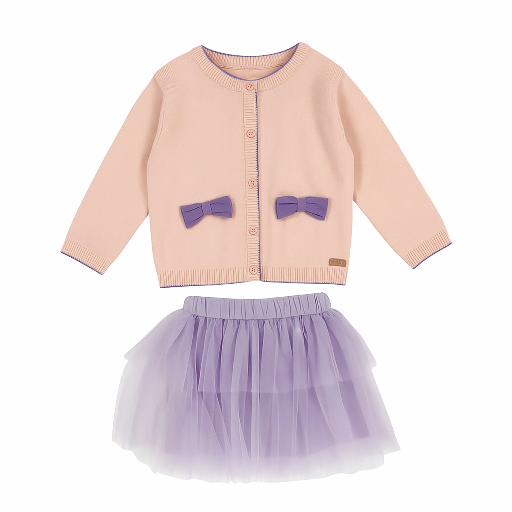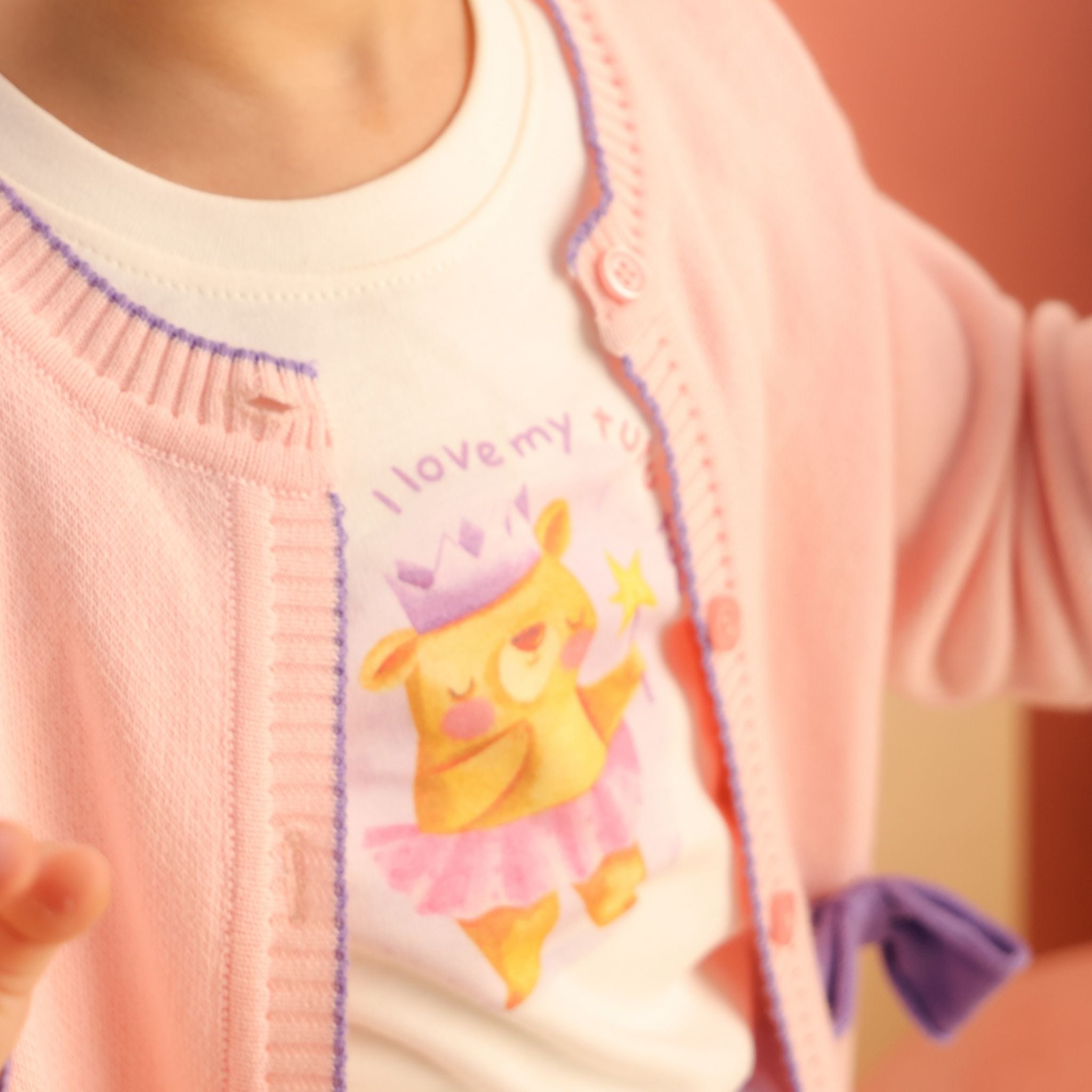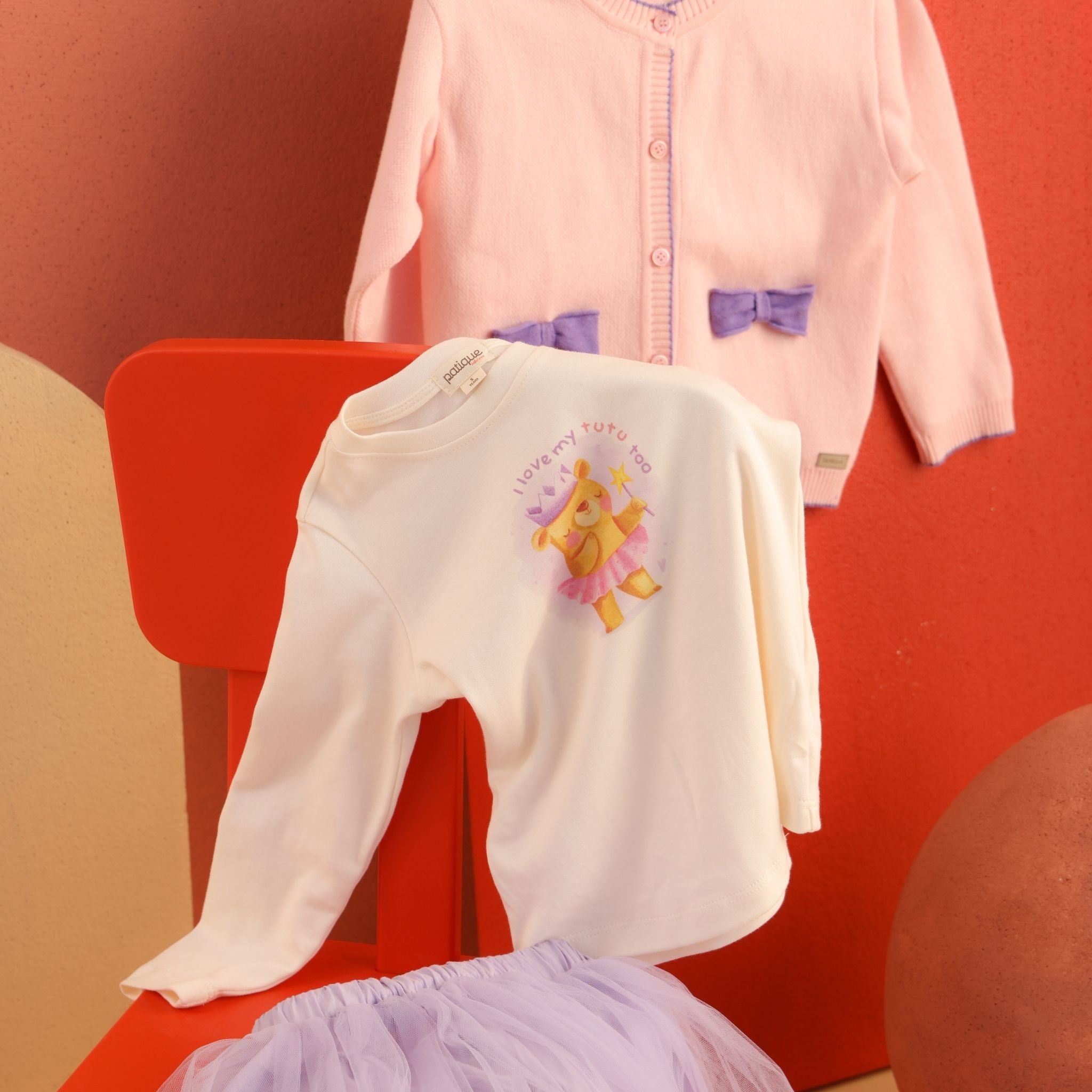 Patique fiyonk cepli triko hırka, kız çocuklarının gardırobuna zarif ve modern bir dokunuş eklemek için tasarlanmış yumuşak ve konforlu bir üst giyim seçeneğidir. Pudra tonundaki şık rengi, hırkanın iki yanında yer alan mor fiyonk detaylarıyla birleşerek romantik ve zarif bir görünüm oluşturur. Örgü dokusunun yumuşak yapısı sayesinde çocukların hassas cildine uyum sağlar, gün boyu konforlu kullanım sunar. Kaliteli triko kumaşı esnek bir yapı sunar ve hırkanın formunu uzun süre korumasına yardımcı olur. İnce mor biyeli kenar detayları ürüne sade ama dikkat çekici bir karakter kazandırır. Düğmeli yapısı sayesinde kolay giyilip çıkarılabilir, hem günlük kombinlerde hem de özel günlerde rahatlıkla kullanılabilir. Etek ve bilek kısmındaki ribanalı tasarım dayanıklılığı artırırken, hırkanın daha düzenli bir duruş sergilemesini sağlar. Elbiseler, etekler ve pantolonlarla kolayca eşleşen bu model, aynı zamanda bahar ve sonbahar aylarında ideal bir tamamlayıcıdır.