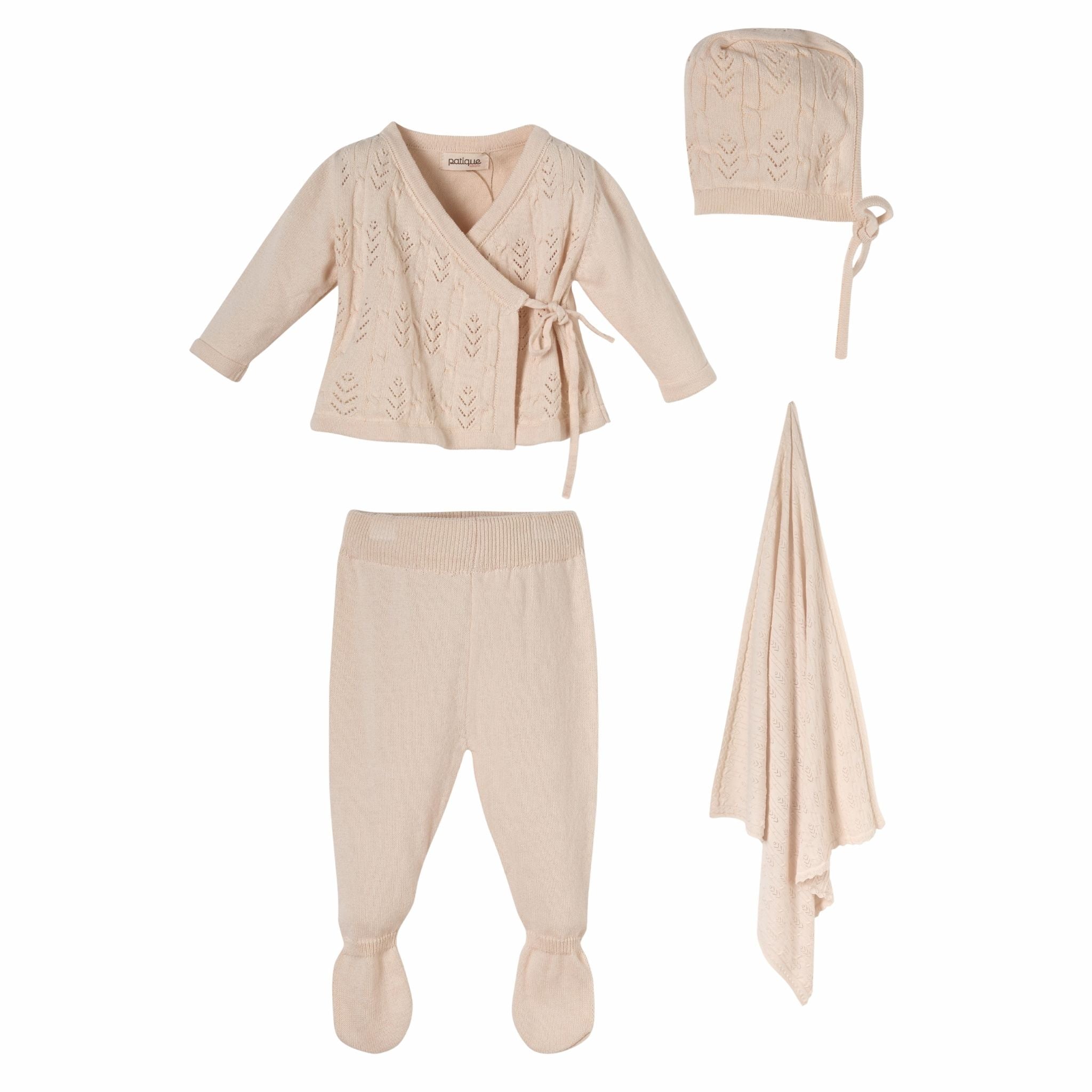 GOTS sertifikalı organik pamuktan üretilen bu yenidoğan triko kız bebek takımı, hassas ciltlere uygun yumuşak dokusuyla günlük kullanım ve hastane çıkışı için ideal bir settir. Kruvaze tasarımlı triko hırka, esnek yapılı triko pantolon, nefes alabilen triko battaniye ve rahat triko şapka ile bebeğin konforunu artıracak şekilde tasarlanmıştır.