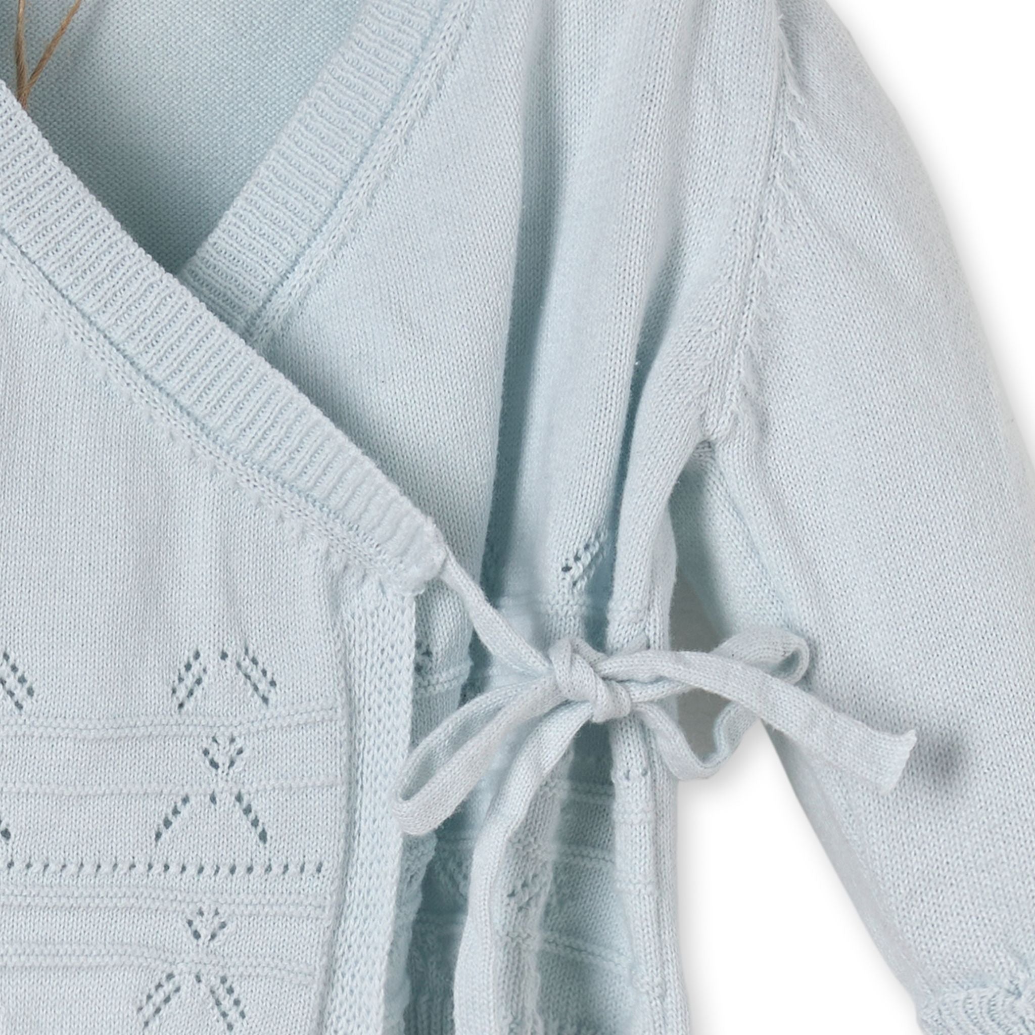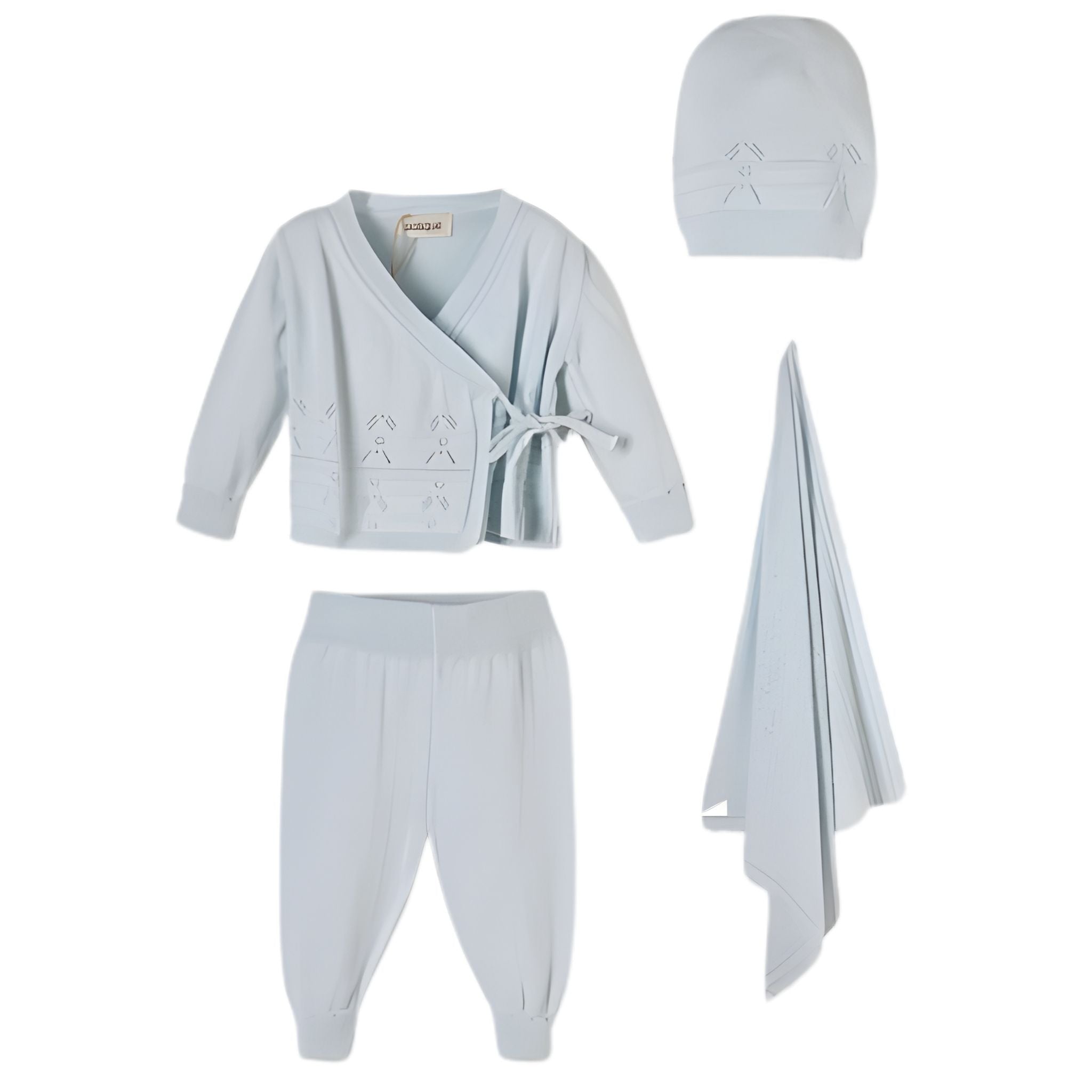 Bebek mavisi tonuyla sade ve zarif bir görünüm sunan bu dört parçalı yenidoğan triko takım, tamamen organik pamuktan üretilmiş cilt dostu yapısıyla öne çıkar. GOTS sertifikalı pamuk dokusu, yeni doğanların hassas tenine uygun bir yumuşaklık ve nefes alabilirlik sağlar. Hem hastane çıkışında hem de ilk aylardaki günlük kullanımda ideal bir konfor sunar.