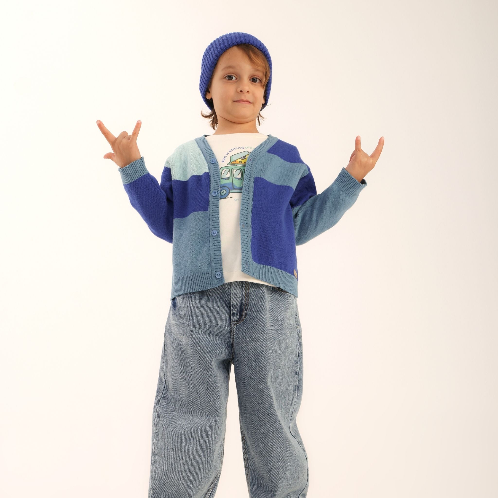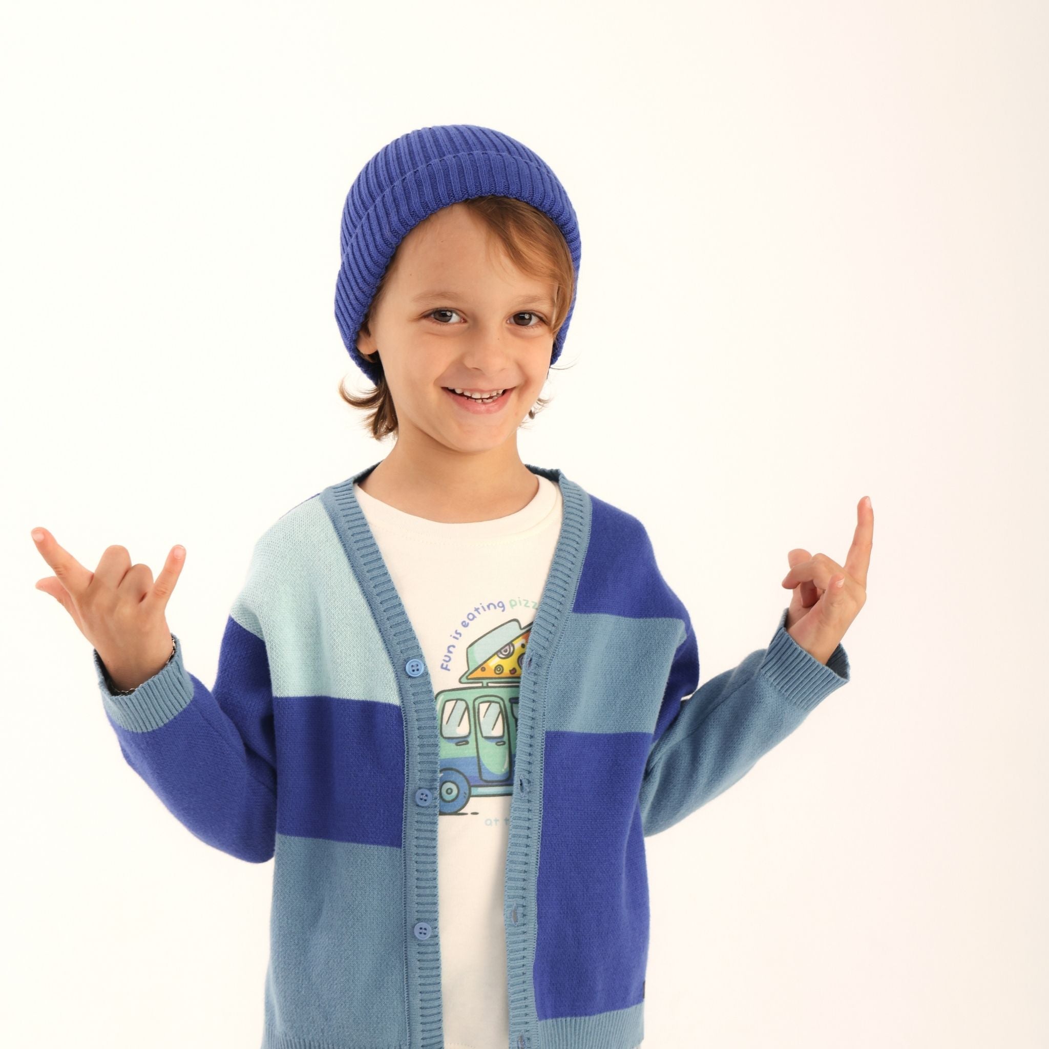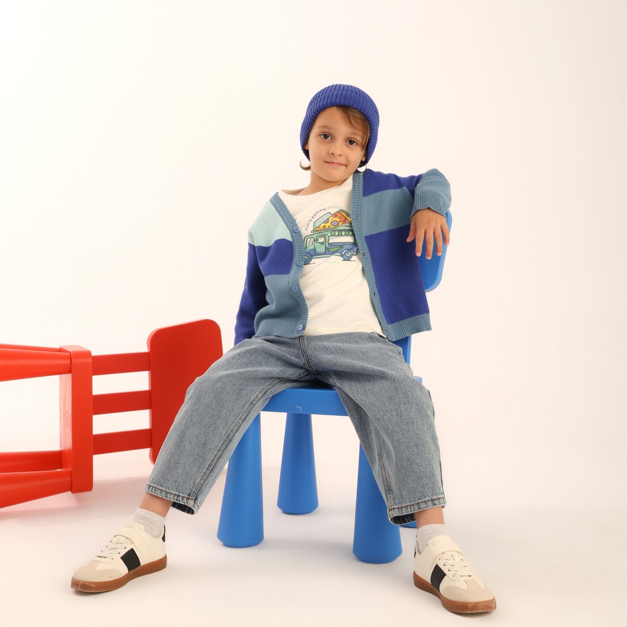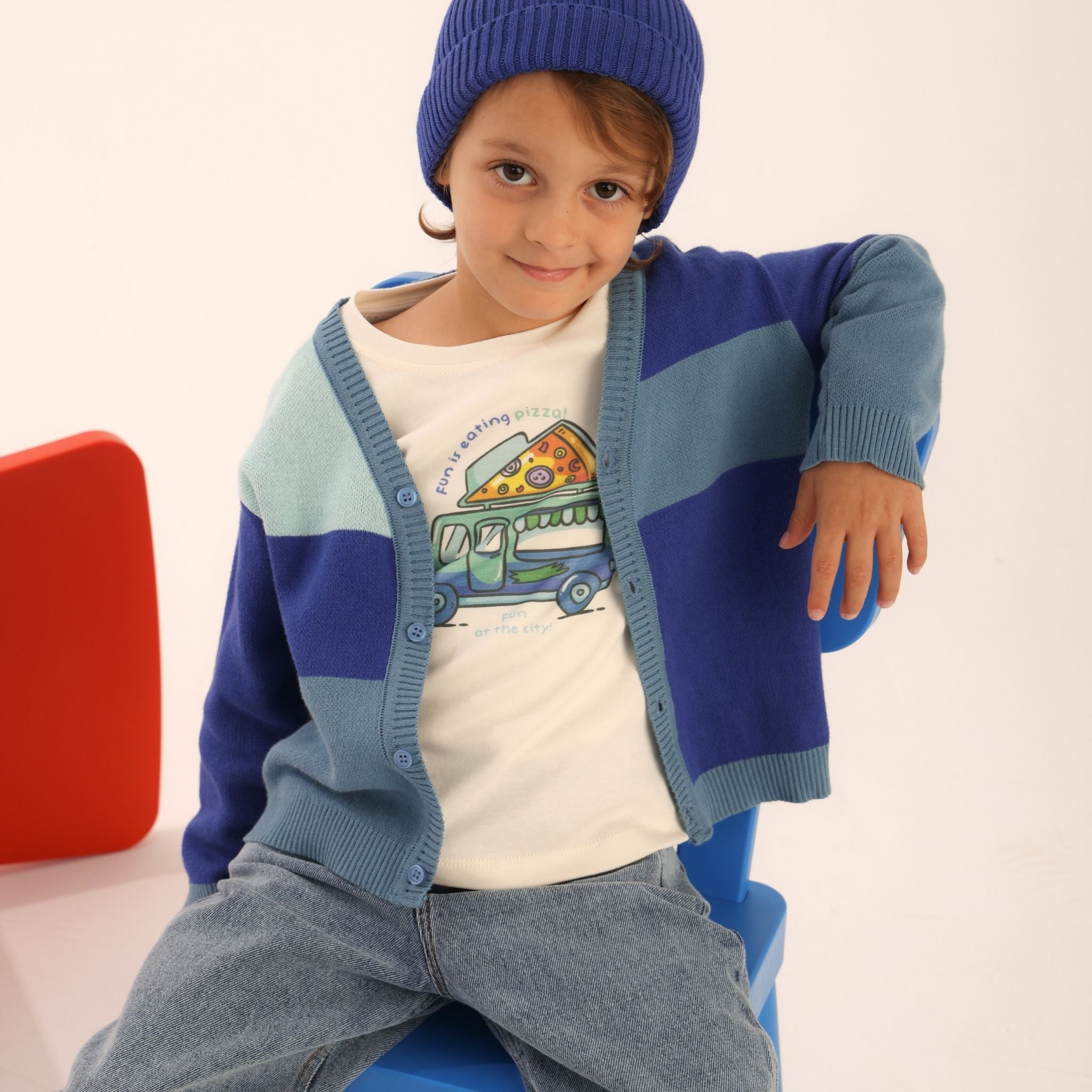 Patique renk bloklu erkek çocuk hırka, modern çizgisi ve dikkat çekici renk geçişleriyle hem günlük kombinlere hem de okul stiline dinamizm katan şık bir tasarım sunar. Mavi tonlarının uyumlu geçişleri, hırkaya hem sportif hem de modern bir görünüm kazandırırken, yumuşak dokulu kumaşı çocukların gün boyu rahat etmesi için özel olarak geliştirilmiştir. V yaka kesimi ve düğmeli yapısı sayesinde kolay giyilip çıkarılabilir. Esnek örgü formu hareket özgürlüğü sağlar, bilek ve etek ucu ribanalı tasarım ise hırkanın formunu korumasına yardımcı olur. Renk bloklu yapısıyla sade kıyafetleri bile anında tamamlayan bu hırka, her mevsimde kullanılabilecek çok yönlü bir parça olarak öne çıkar. Hem kot pantolonlarla hem basic tişörtlerle mükemmel uyum yakalayan model, şık ve kullanışlı bir üst giyim alternatifi arayan aileler için ideal bir seçenektir.
