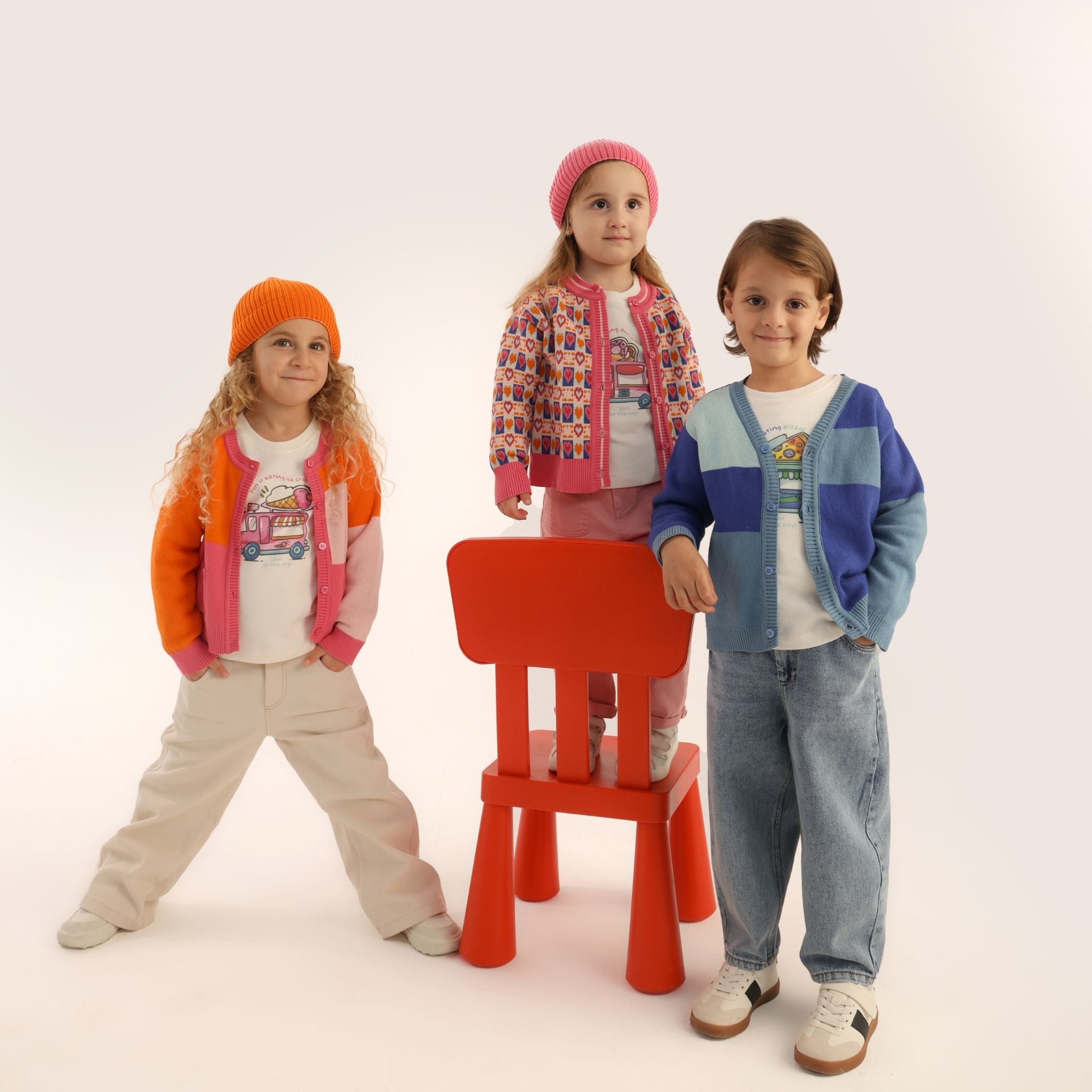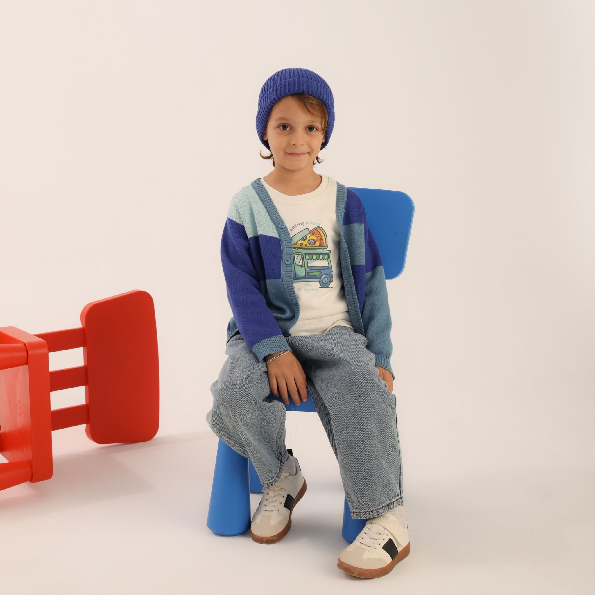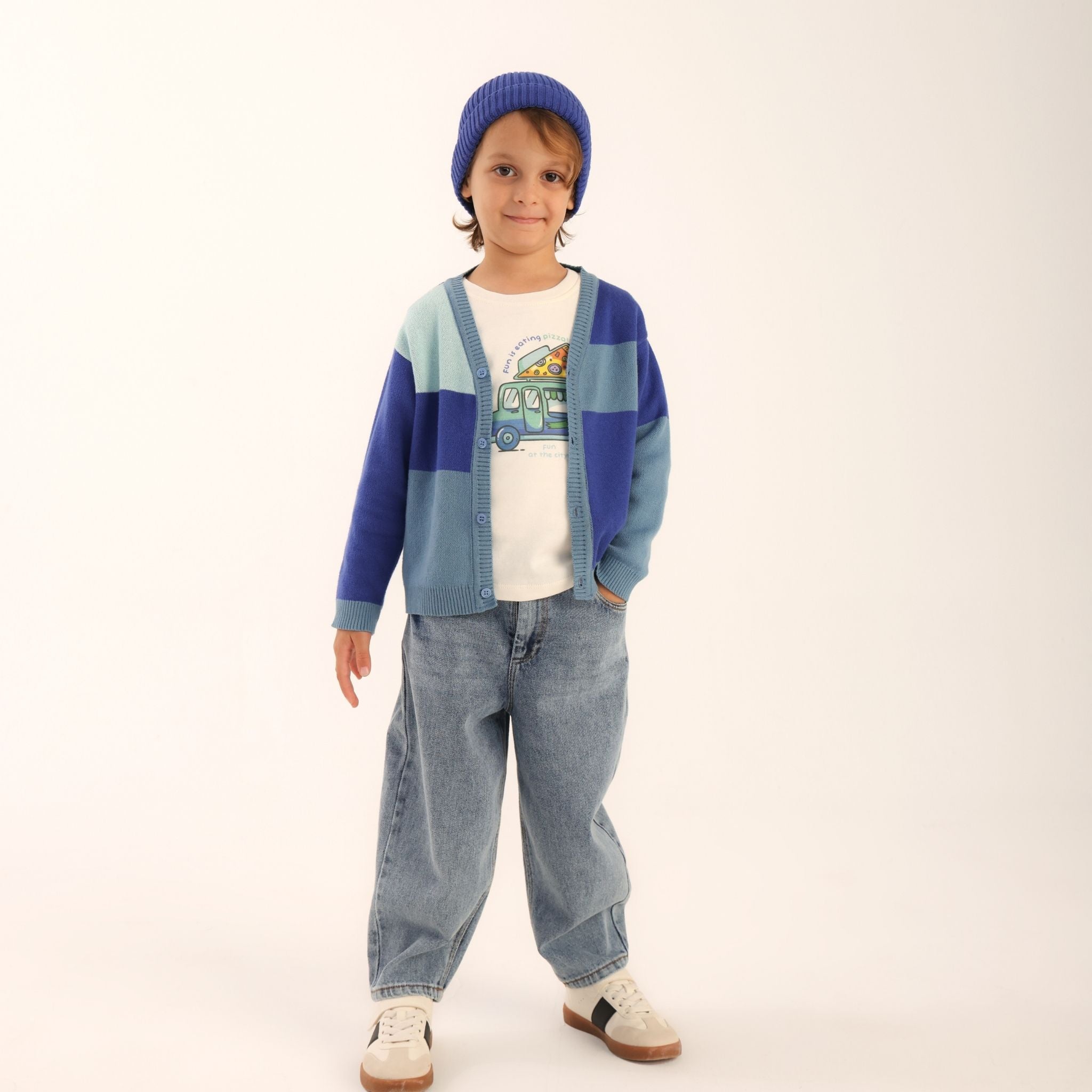 Patique renk bloklu erkek çocuk hırka, modern çizgisi ve dikkat çekici renk geçişleriyle hem günlük kombinlere hem de okul stiline dinamizm katan şık bir tasarım sunar. Mavi tonlarının uyumlu geçişleri, hırkaya hem sportif hem de modern bir görünüm kazandırırken, yumuşak dokulu kumaşı çocukların gün boyu rahat etmesi için özel olarak geliştirilmiştir. V yaka kesimi ve düğmeli yapısı sayesinde kolay giyilip çıkarılabilir. Esnek örgü formu hareket özgürlüğü sağlar, bilek ve etek ucu ribanalı tasarım ise hırkanın formunu korumasına yardımcı olur. Renk bloklu yapısıyla sade kıyafetleri bile anında tamamlayan bu hırka, her mevsimde kullanılabilecek çok yönlü bir parça olarak öne çıkar. Hem kot pantolonlarla hem basic tişörtlerle mükemmel uyum yakalayan model, şık ve kullanışlı bir üst giyim alternatifi arayan aileler için ideal bir seçenektir.