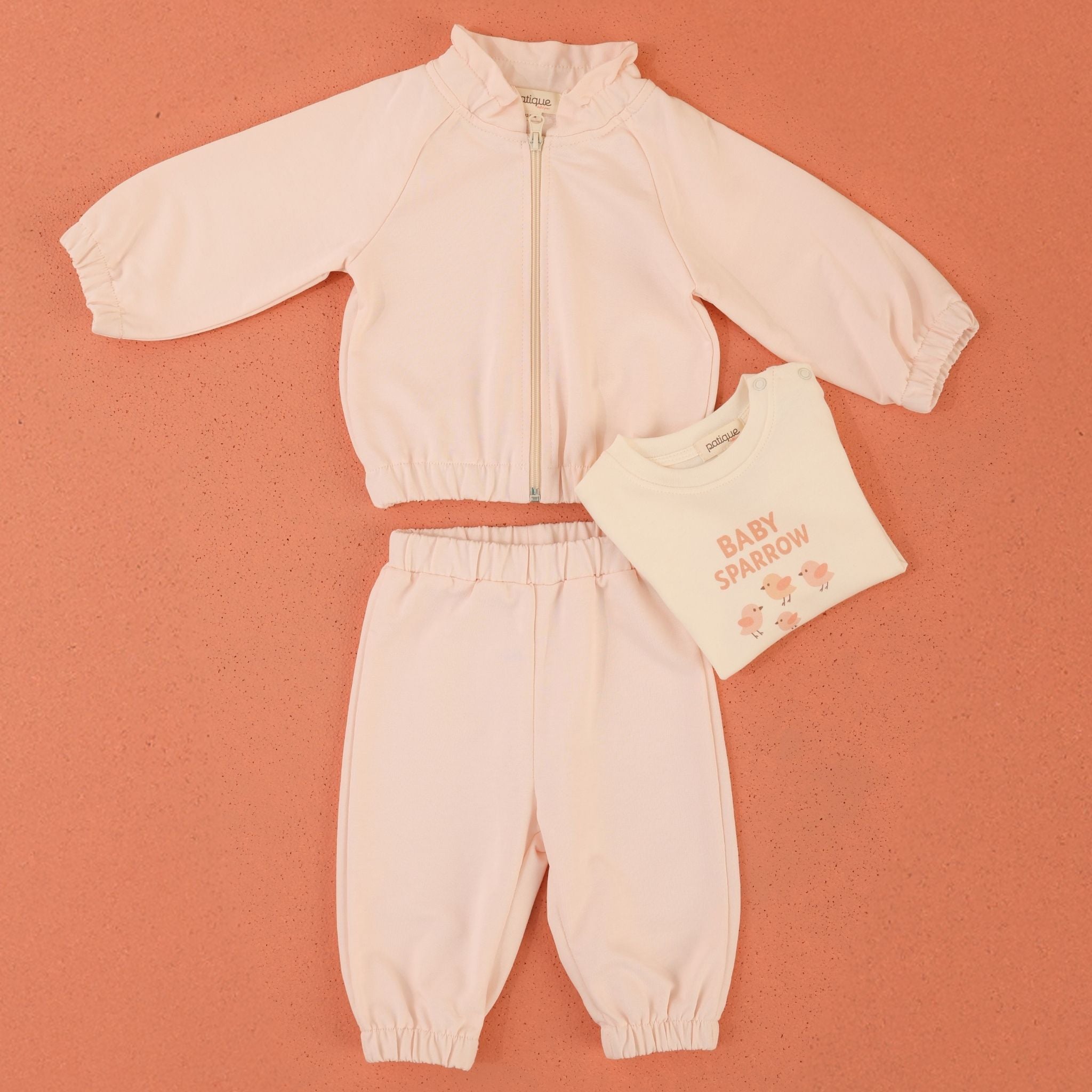 Patique Sparrow Kız Üçlü Set, yumuşak dokulu kumaşı ve rahat kalıbıyla günlük kullanım için ideal bir takımdır. Üçlü set; fermuarlı üst, esnek bel yapısına sahip pantolon ve sevimli Baby Sparrow baskılı body ile tamamlanır. Hareket özgürlüğü sağlayan tasarımı sayesinde hem oyun zamanlarında hem dışarı gezilerinde bebeğin gün boyu konforunu destekler. Nefes alabilen pamuklu yapısı hassas ciltlerde rahat bir kullanım sunar.