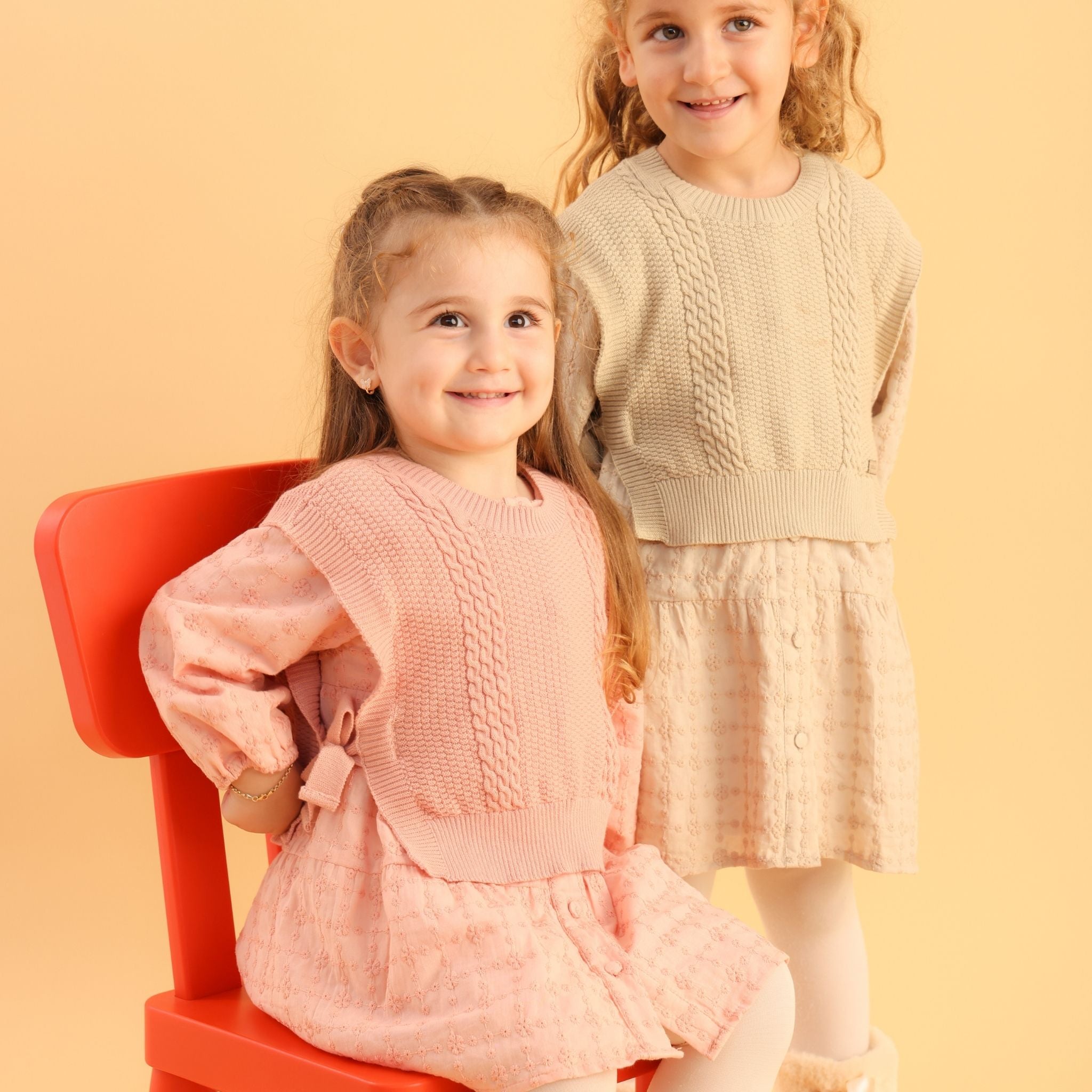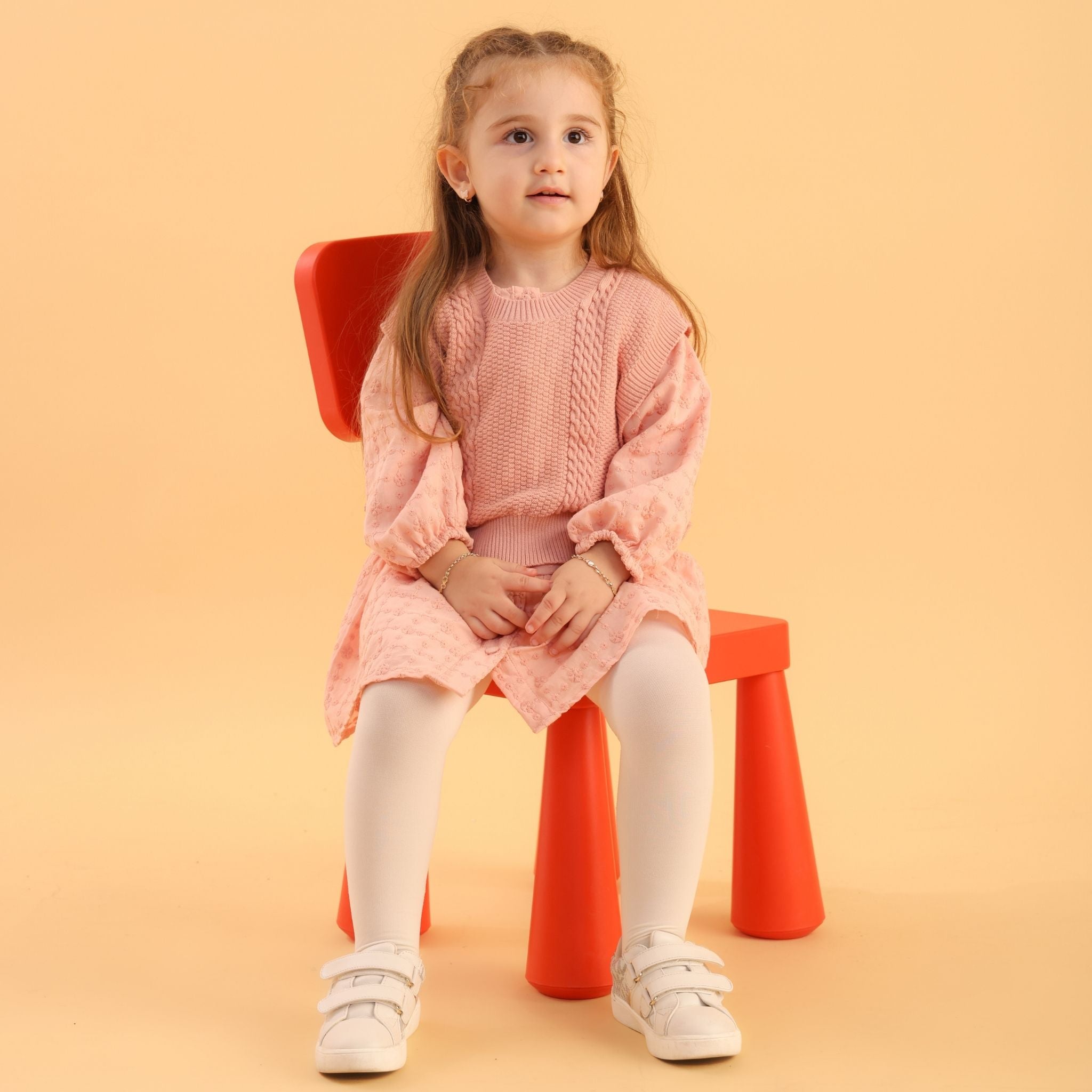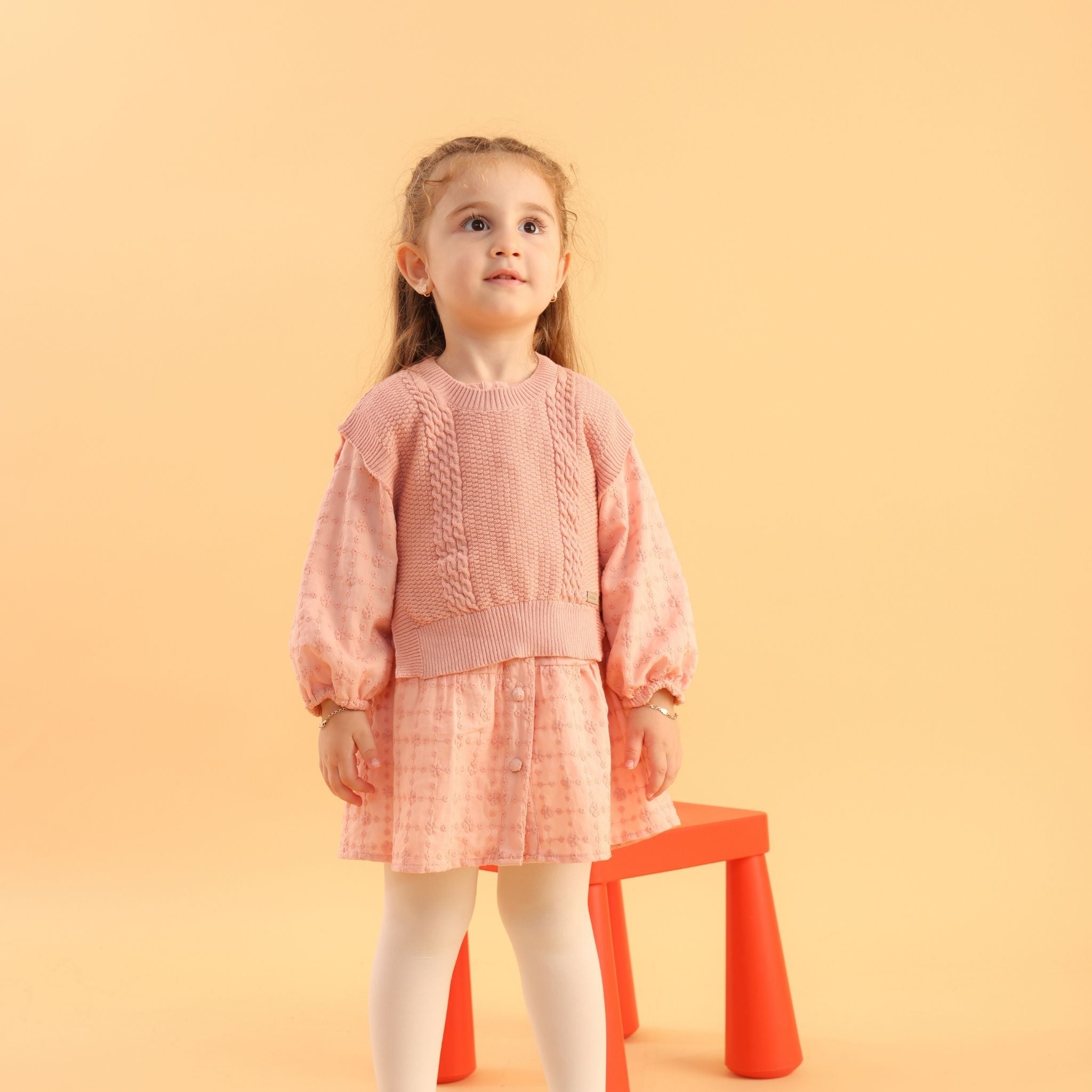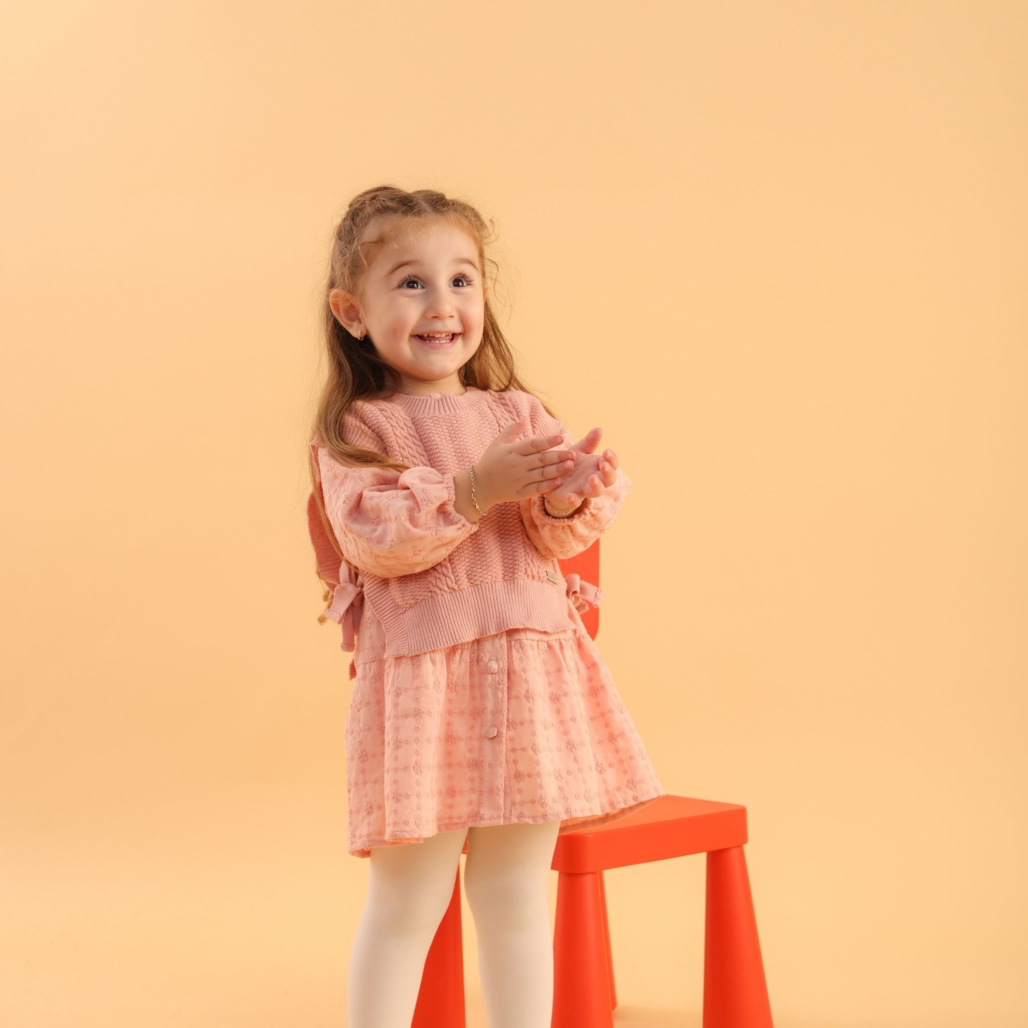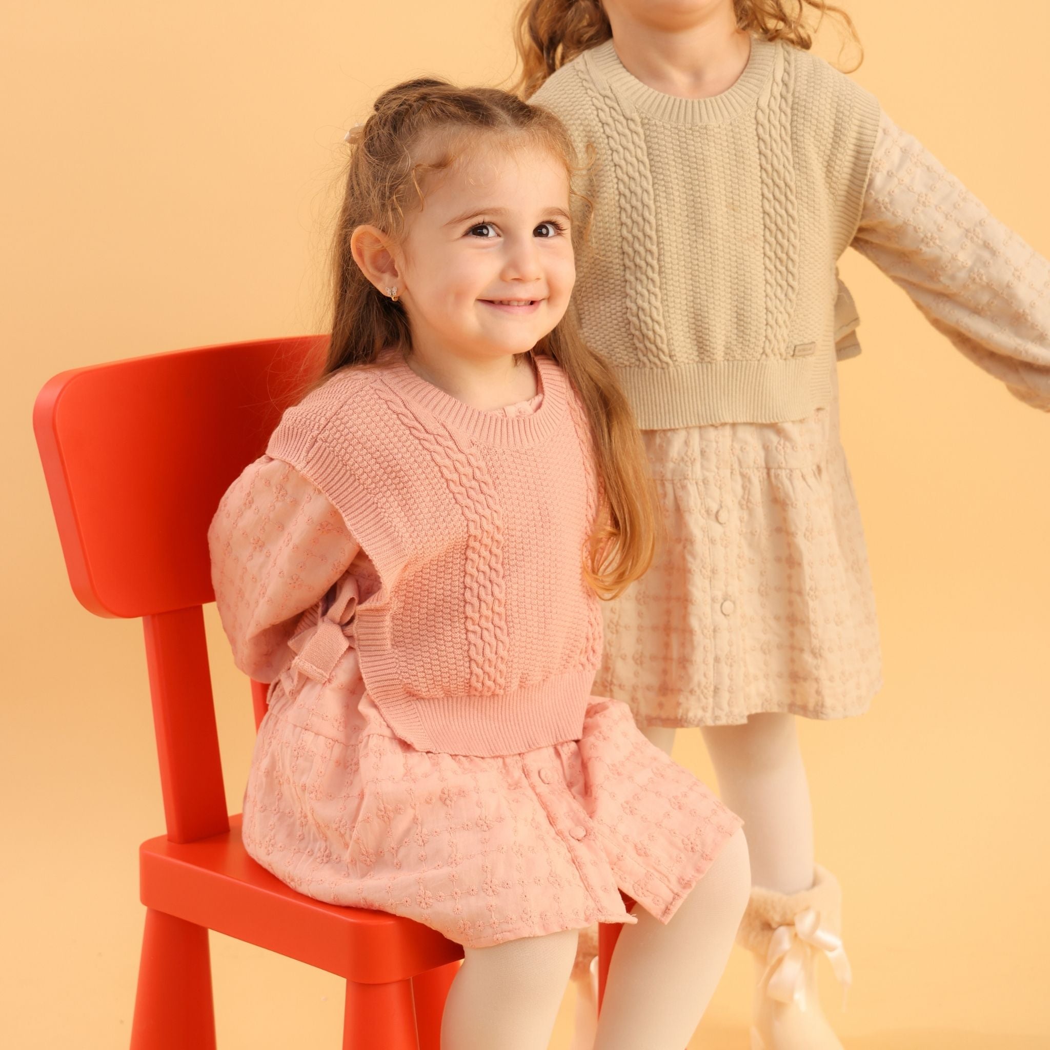 Patique ’in zarif tasarım çizgisini taşıyan bu triko süveterli brode elbise, kız çocuklar için hem şık hem de konforlu bir seçenek sunar. Üst bölümde yer alan kablolu örgü desenli triko süveter, elbisenin brode işlemeli yumuşak dokusuyla mükemmel bir uyum yakalar. Günlük kullanımda rahatlık sağlayan geniş kesimi, esnek yapısı ve doğal duyusu sayesinde çocukların gün boyunca özgürce hareket etmesine olanak tanır. Pastel pembe rengi ve romantik dokusuyla özel günlerde, doğum günlerinde, aile buluşmalarında ve günlük kombinlerde rahatlıkla tercih edilebilir. Hem modern hem de zamansız bir stile sahip olan bu model, miniklerin gardırobuna zarif bir dokunuş katmak için ideal bir seçimdir.