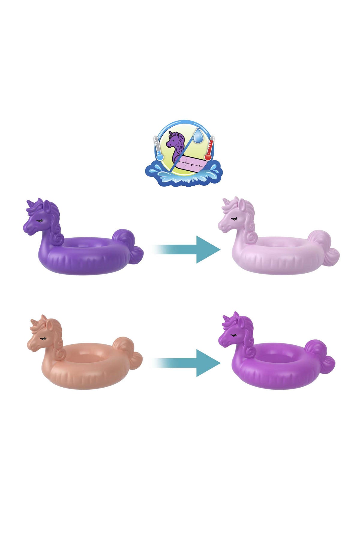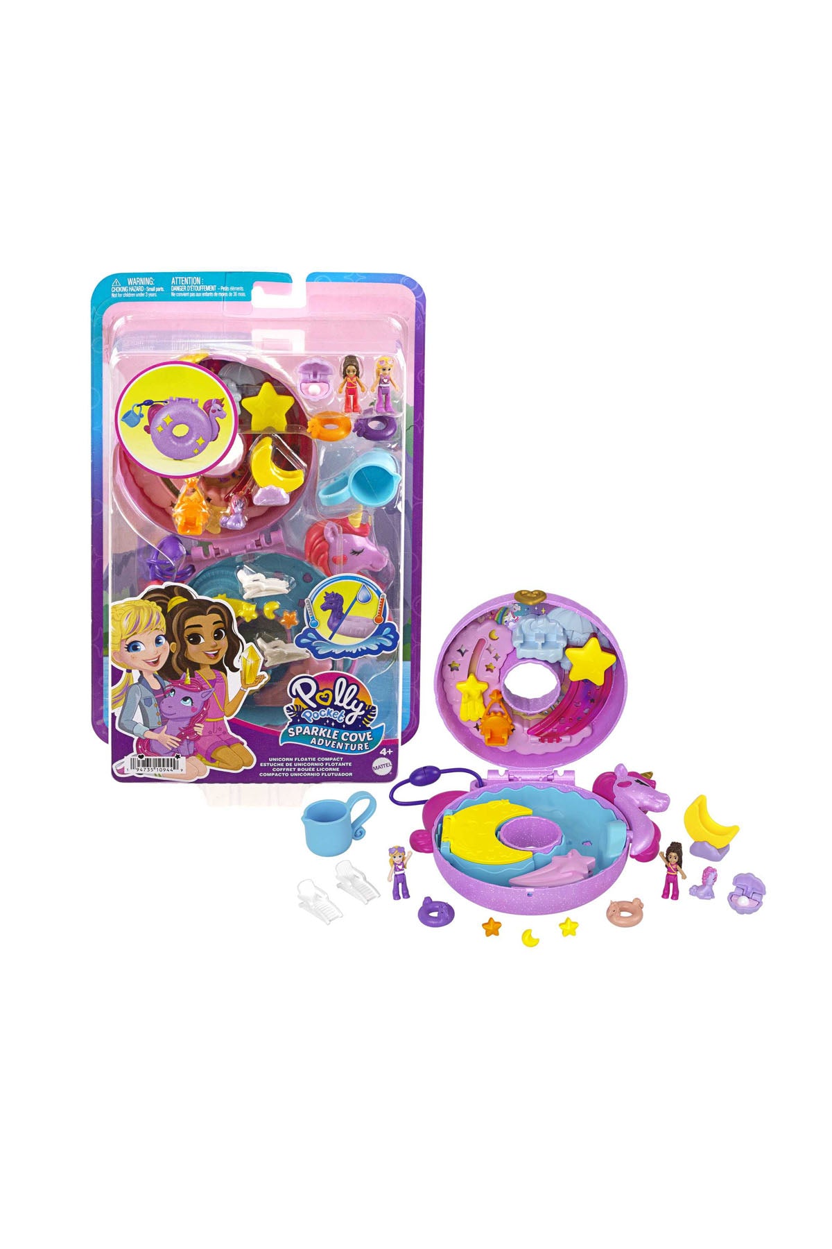 Sparkle Cove Adventure Unicorn Floatie Compact oyun setindeki Polly bebekle havalı kalın! İki renk değiştiren parça ile suda oynama özelliği içeren bu kompakt ile evde veya hareket halindeyken eğlenceli bir dünyaya dalın. Çocuklar jakuzi ayını suyla doldurabilir ve birlikte verilen iki mikro bebeği içine yerleştirebilir. 12 aksesuar ve bebeklerin takabileceği kayan bir kayan yıldız, inciyi ortaya çıkarmak için açılan bir deniz kabuğu, ileri geri hareket eden bir güneş salıncağı ve su oyununu etkinleştirmek için kayan bir yıldız dalga oluşturucu dahil olmak üzere beş hikaye anlatma özelliği var!