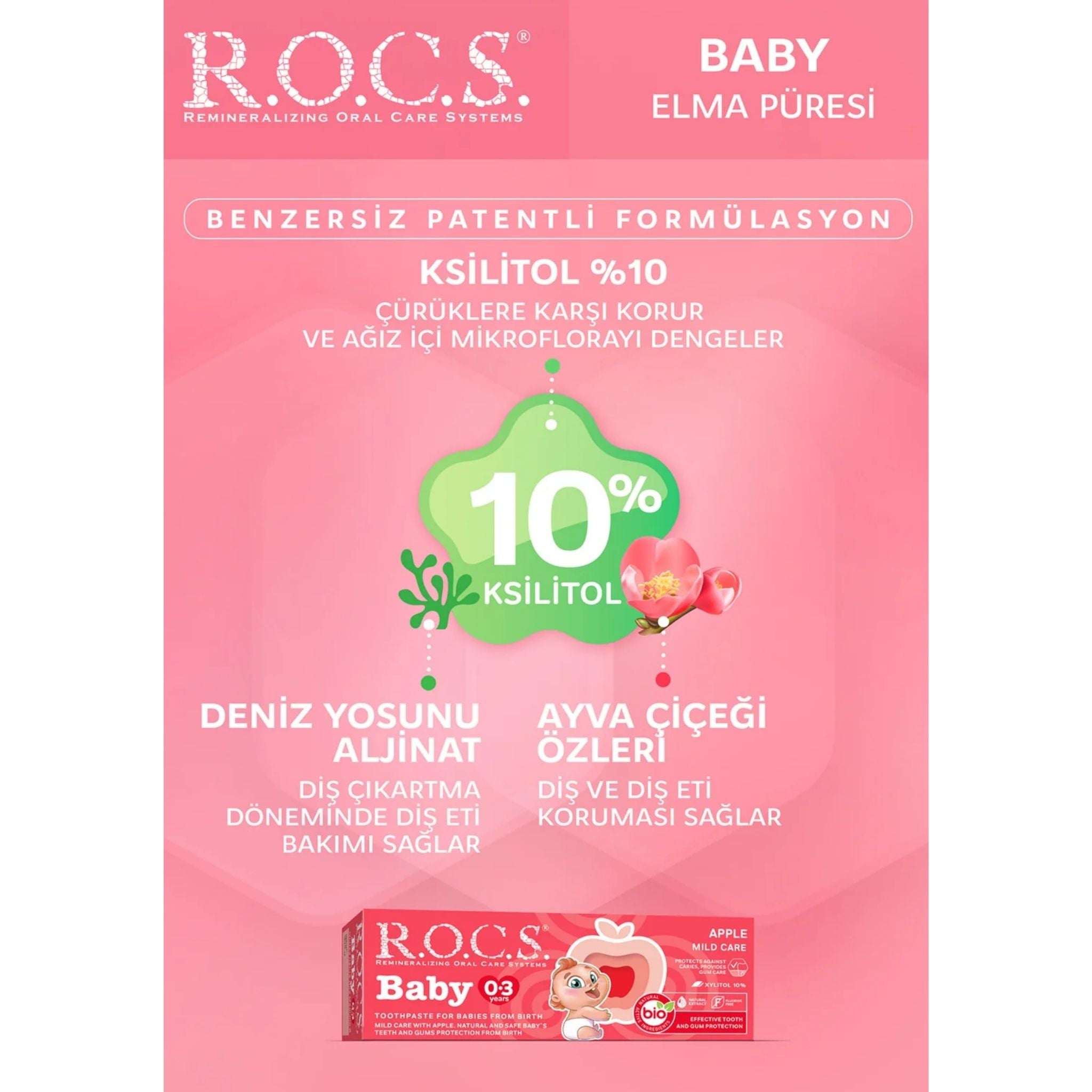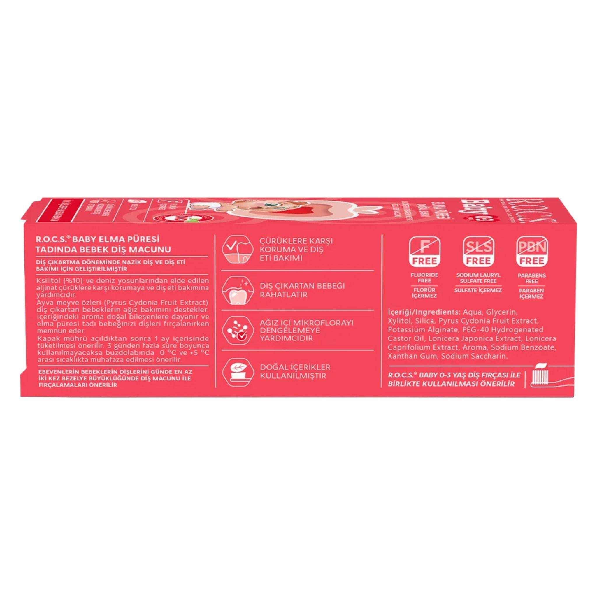 Bebeklerin hassas ağız yapısına özel olarak hazırlanan Rocs Baby 0-3 Yaş Elma Püresi Tadında Bebek Diş Macunu, nazik temizleme gücü ve güvenli bileşenleriyle ilk diş bakımını kolay ve keyifli hale getirir. Florür, SLS, renklendirici ve antiseptik içermeyen formülü sayesinde yutulabilir yapıdadır ve ebeveynler için tam bir gönül rahatlığı sunar. Doğal elma püresi tadı, bebeklerin diş fırçalama rutinini eğlenceli bir deneyime dönüştürür.