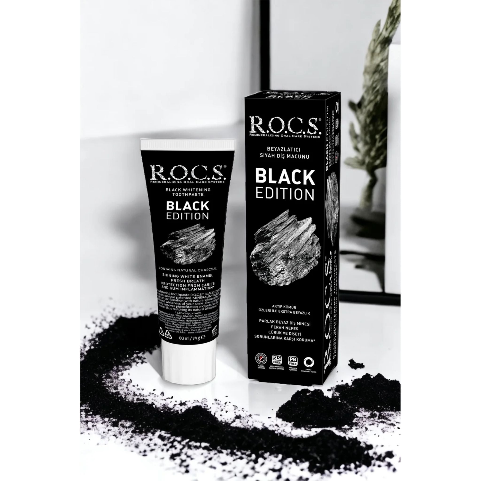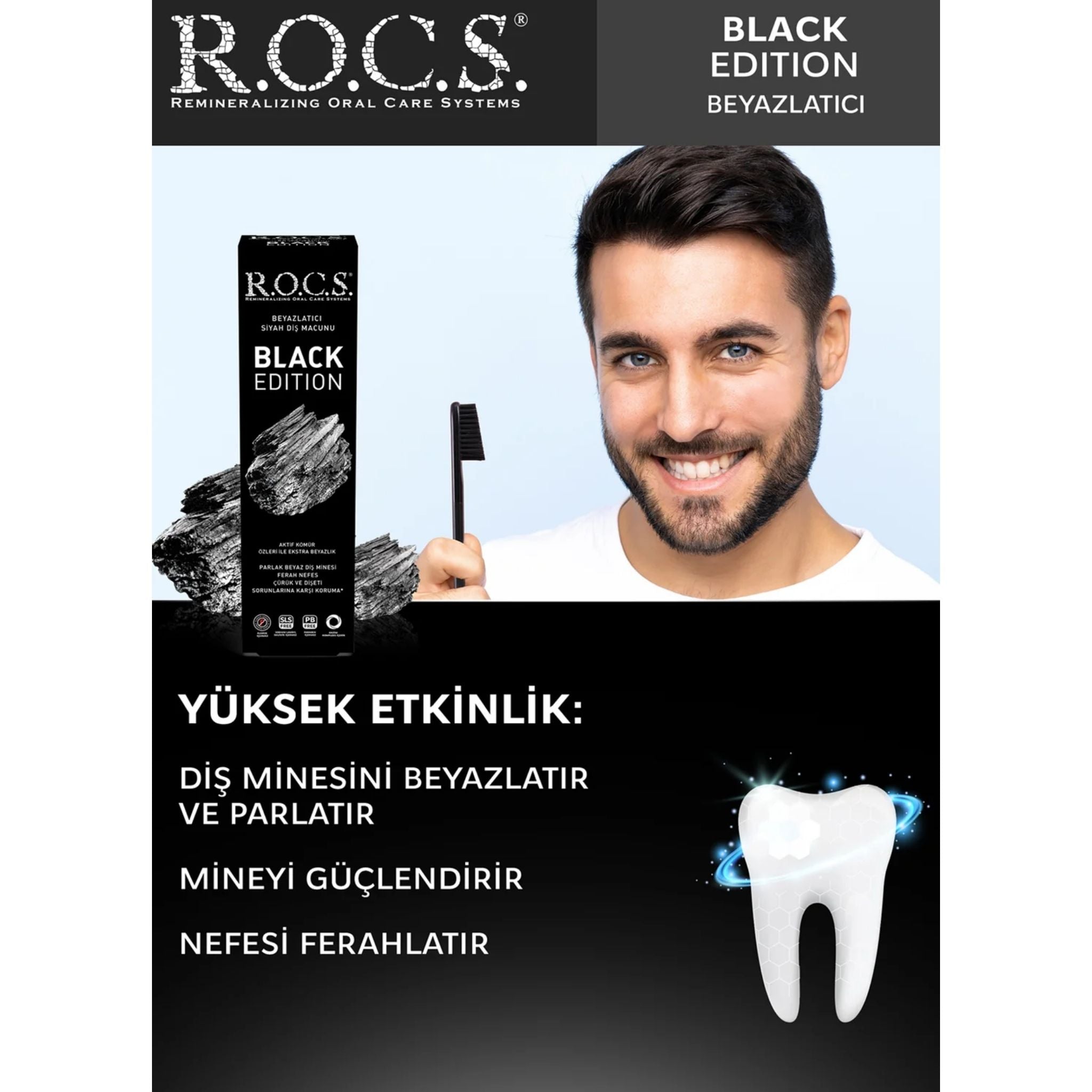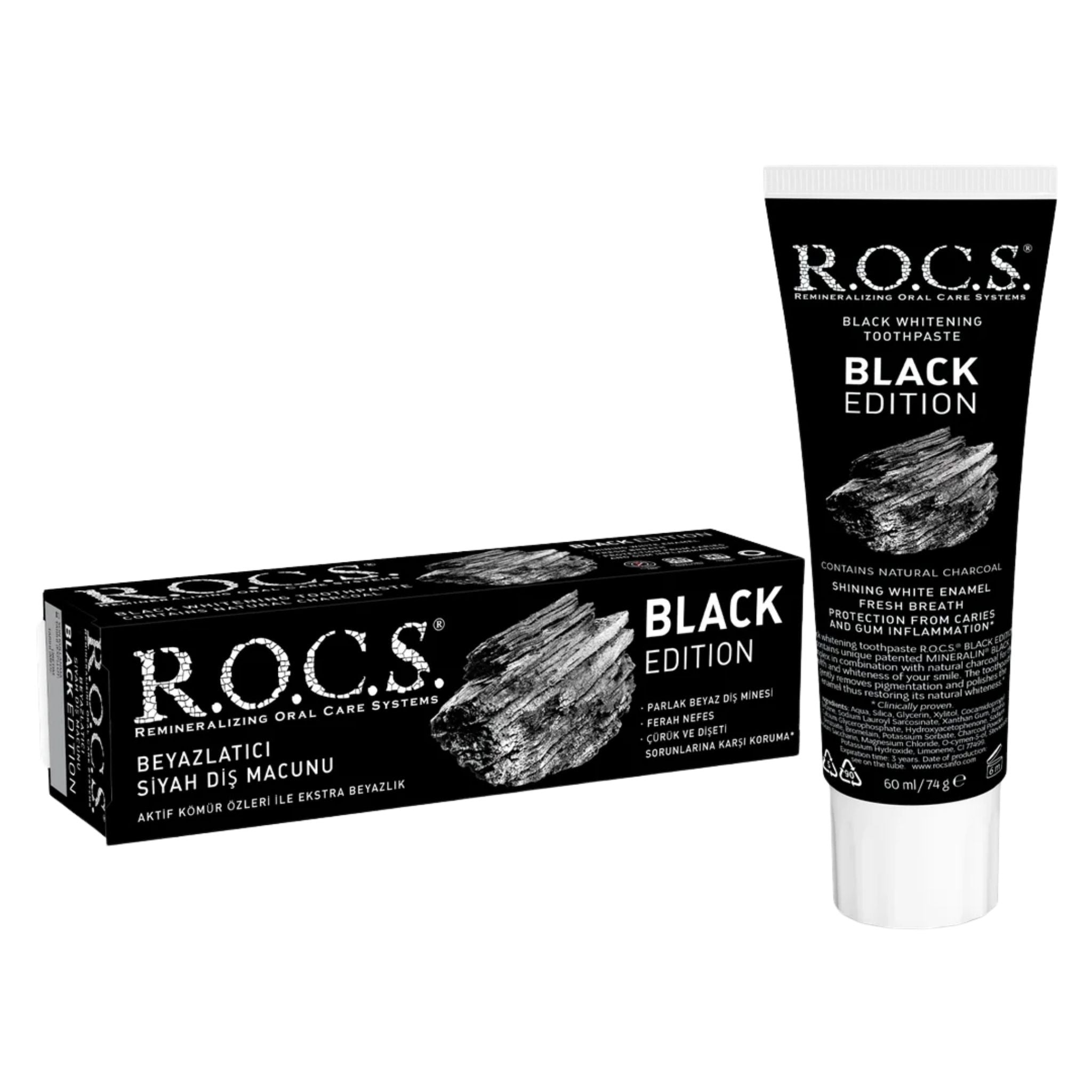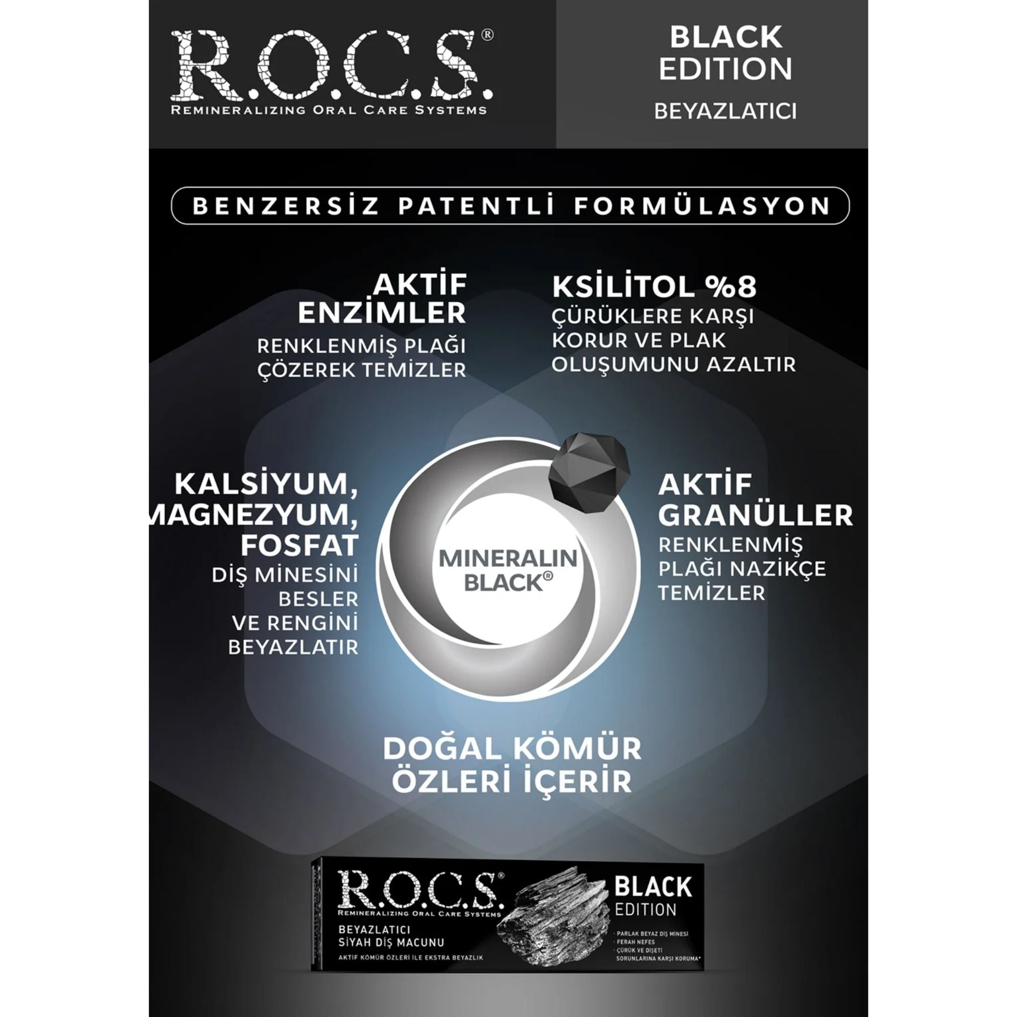 Rocs Black Edition Kömür Özlü Beyazlatıcı Diş Macunu, özel geliştirilmiş formülü ile hızlı ve etkili bir beyazlatma deneyimi sunmak amacıyla tasarlanmıştır. Kömür özü, bitkisel enzim ve aktif granül teknolojisinin bir araya geldiği bu gelişmiş yapı, diş yüzeyindeki renklenmiş plağı çözerek temizler ve düzenli kullanımda daha beyaz bir gülümseme elde edilmesine yardımcı olur. Ürün florür ve SLS içermeyen formülü sayesinde günlük kullanım için güvenli bir seçenek oluşturur.