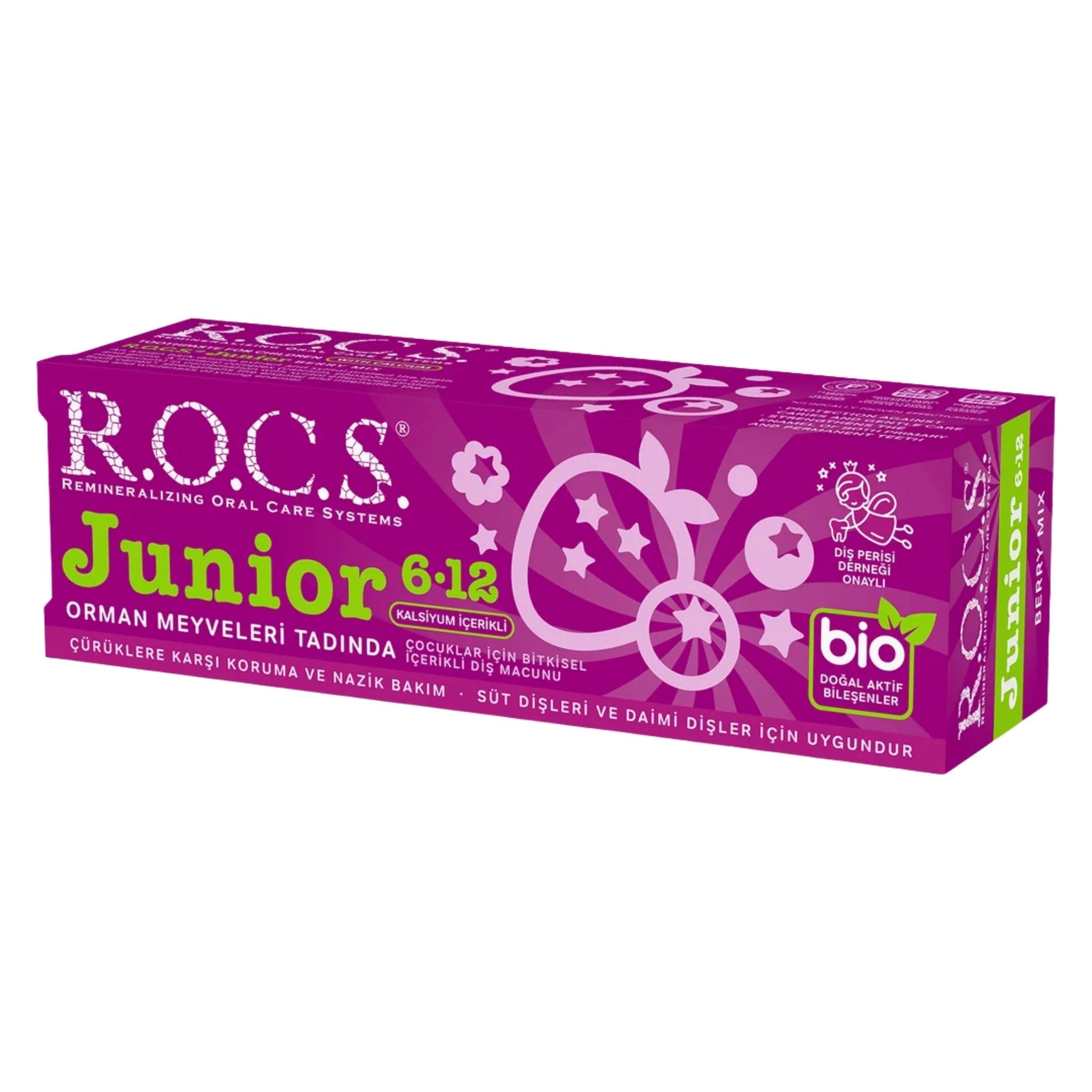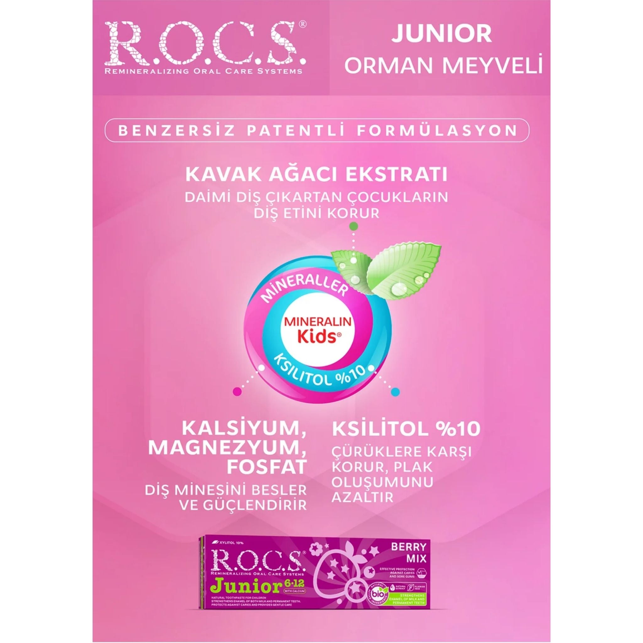 Rocs Junior 6-12 Yaş Orman Meyveleri Tadında Florürsüz Çocuk Diş Macunu; hem süt dişleri hem de yeni çıkan daimi dişlerin ihtiyaçlarını karşılamak için özel olarak tasarlanmıştır. Florür, SLS ve antiseptik içermeyen güvenli formülü ile günlük kullanımda çocukların hassas ağız yapısına uyum sağlar. Daimi dişlerin çıkmaya başladığı dönemde diş etleri daha hassas olabildiği için ürün, diş eti bakımını destekleyen içeriklerle yapılandırılmıştır. Mineral açısından zengin formülü diş minesini beslemeye ve çürüklere karşı dayanıklılığı artırmaya yardımcı olur. Düşük aşındırıcı yapısı sayesinde diş minesini koruyarak nazik bir temizlik sağlarken, orman meyvelerinden oluşan cazip tadı çocukların ağız bakım alışkanlığı kazanmasını kolaylaştırır.