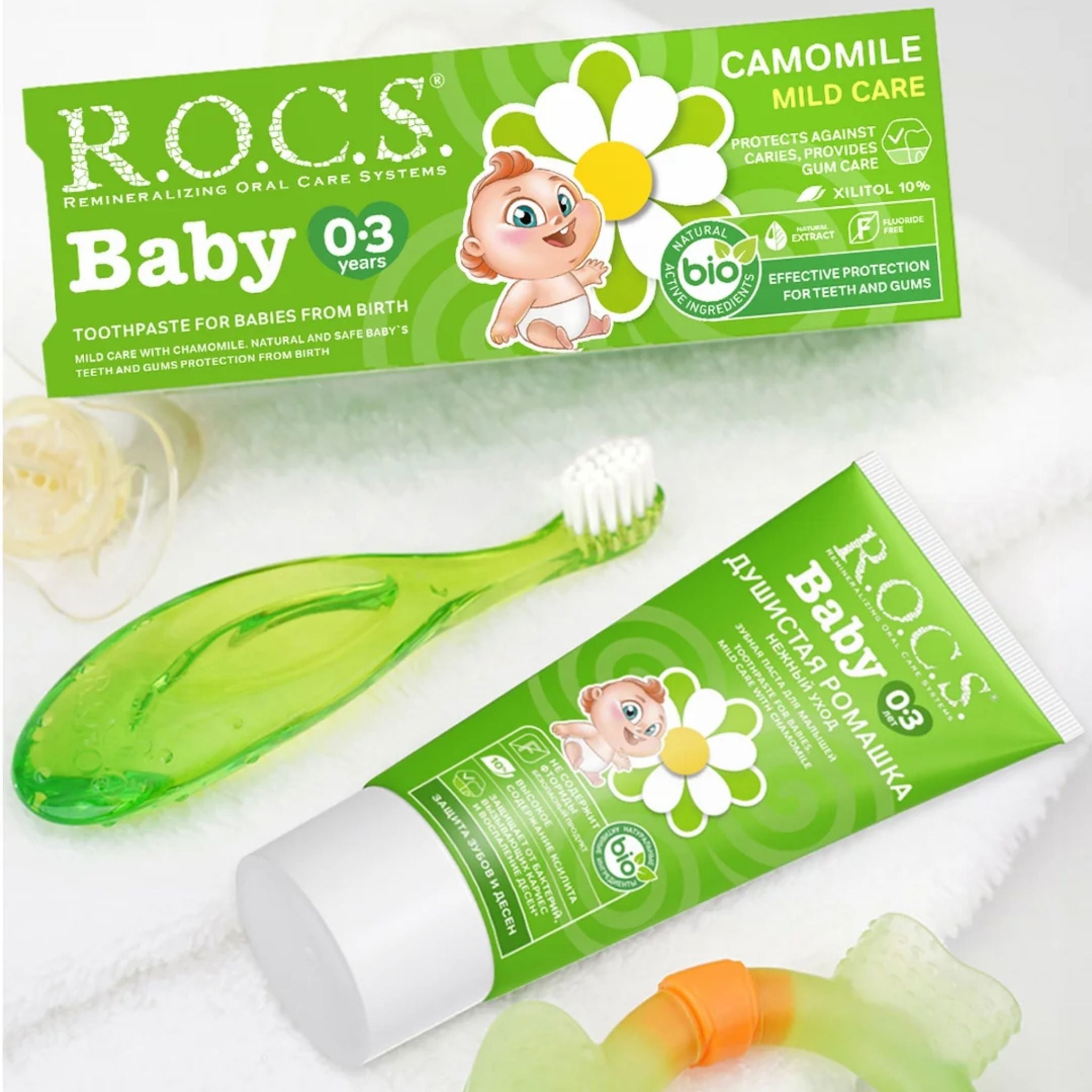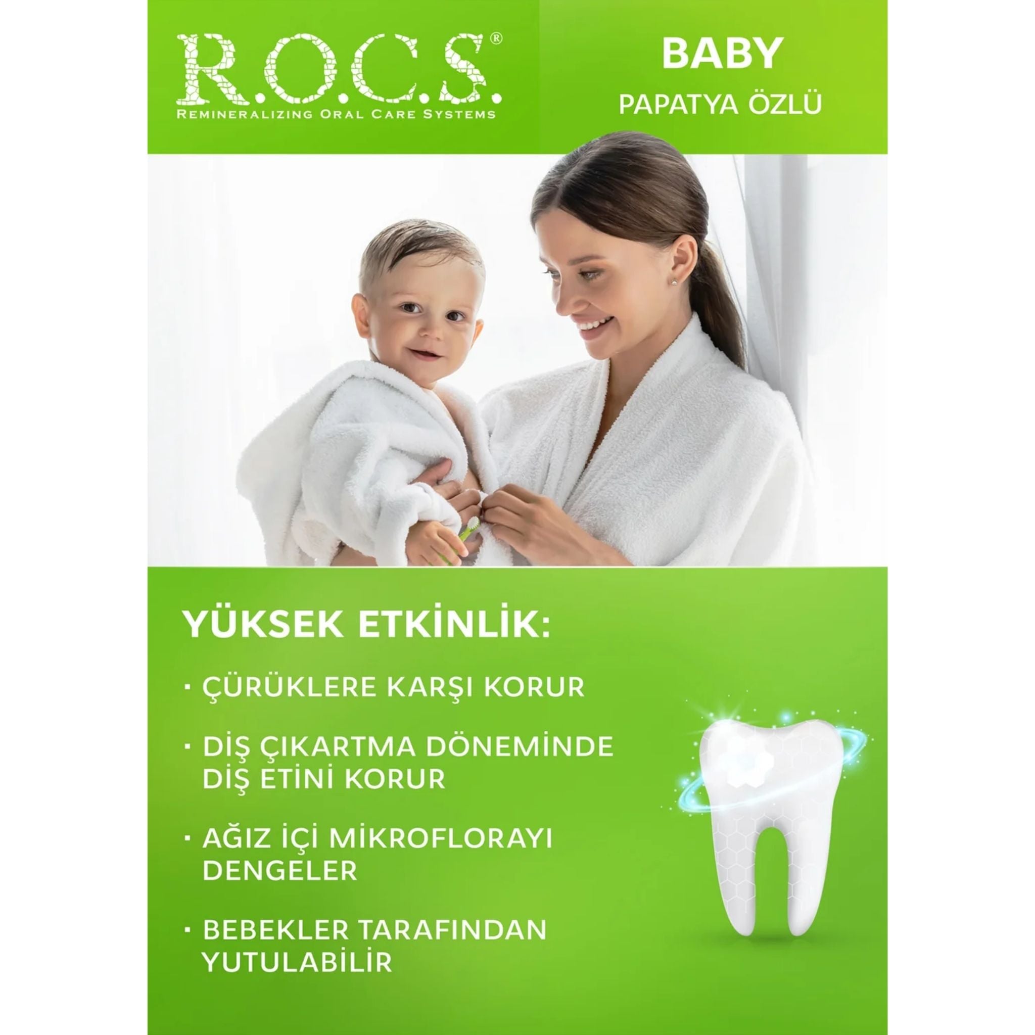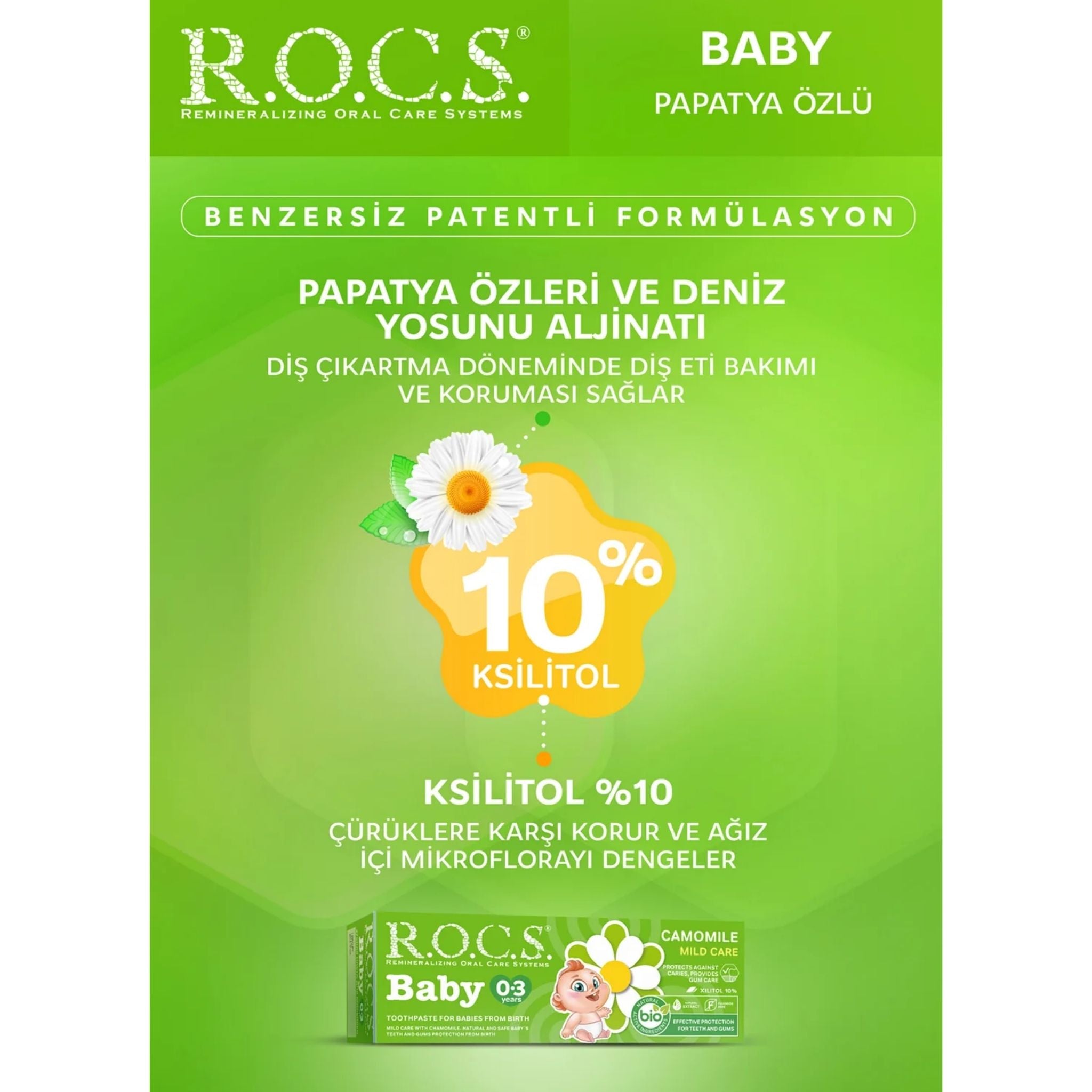 Rocs Diş Macunu 0-3 Yaş Papatya, bebeklerin ilk diş bakımında güvenle kullanılabilecek özel bir formül sunar. Hassas diş ve diş etlerine zarar vermeden temizlik sağlayabilmesi için florür, SLS, renklendirici ve antiseptik içermeyen bir yapı ile geliştirilmiştir. Bitkisel bileşenleri sayesinde hem nazik hem de güvenli bakım isteyen ebeveynler için ideal bir seçenektir. Süt dişlerini çürüğe karşı korumayı desteklerken, yutulabilir nitelikte olması bebeğiniz için ekstra güven sağlar. İlk dişin çıktığı dönemden başlayarak 3 yaşına kadar kullanıma uygundur.