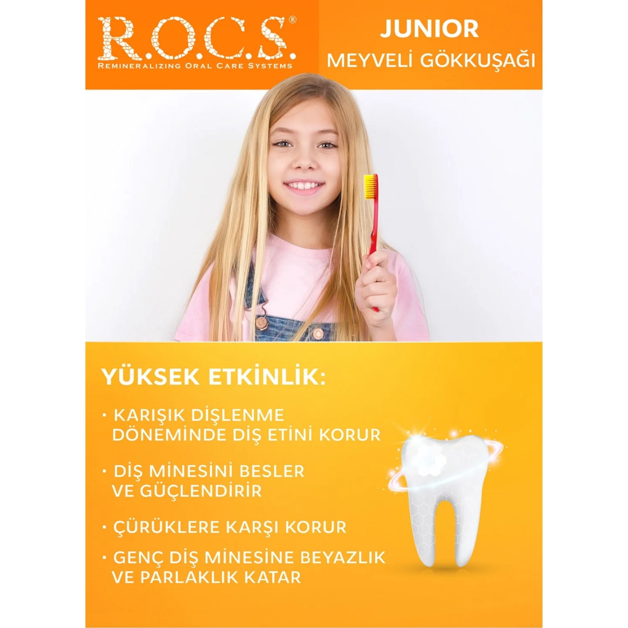 Rocs Junior 6-12 Yaş Gökkuşağı Aromalı Diş Macunu, hem süt dişlerinin korunması hem de yeni çıkan daimi dişlerin güçlendirilmesi amacıyla özel olarak geliştirilmiş bir çocuk diş macunudur. Florür, SLS ve antiseptik içermeyen güvenli formülü, diş etlerinin hassas olduğu bu yaş aralığında nazik bakım sunar. Daimi dişlerin ilk çıkış döneminde ihtiyaç duyduğu mineral desteğini sağlayarak diş minesinin güçlenmesine yardımcı olur. Turunçgil aromalarından oluşan meyveli tadı, çocukların düzenli fırçalama alışkanlığı kazanmasına katkıda bulunur. Düşük aşındırıcı yapısıyla diş minesine zarar vermeden temizlik sağlar.