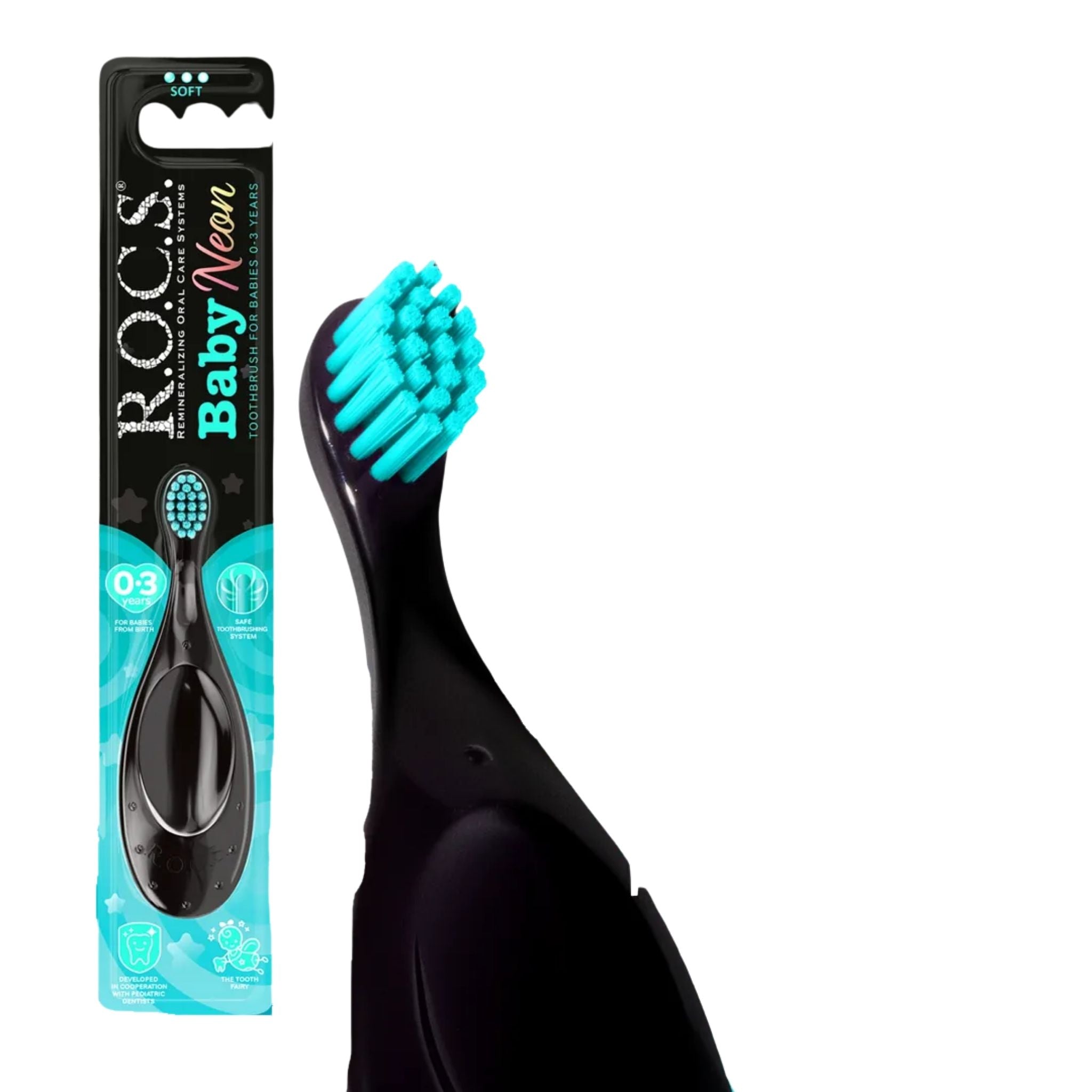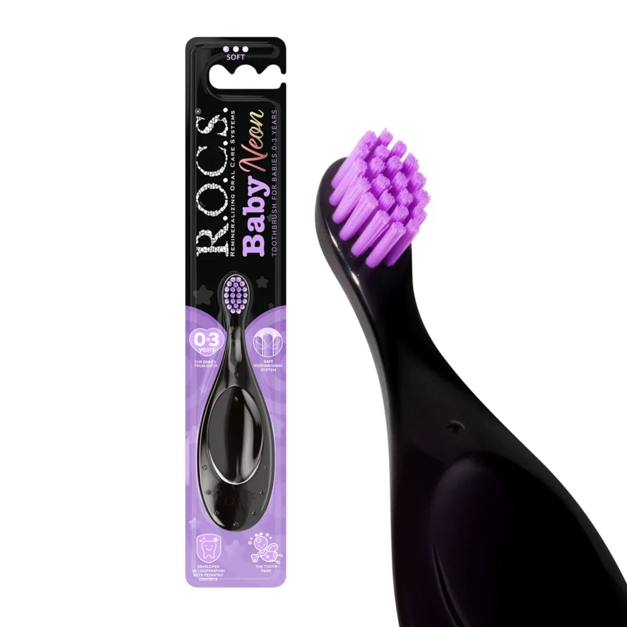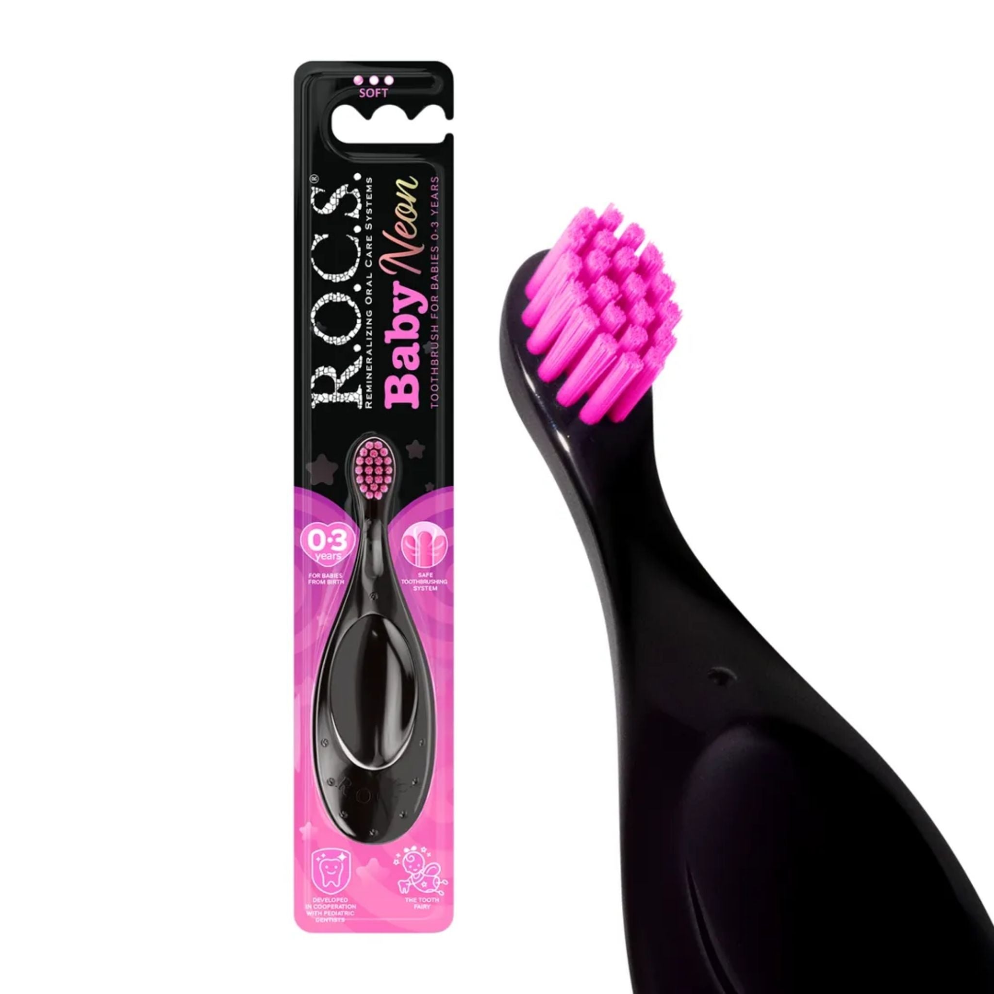 Rocs Neon Baby 0-3 Yaş Bebek Diş Fırçası, bebeklerin ilk diş bakımına güvenli ve konforlu şekilde başlaması için özel olarak geliştirilmiştir. Ekstra yumuşak pamuksu kılları sayesinde hassas diş yüzeyini ve minik diş etlerini tahriş etmeden temizlemeyi hedefler. Çocuk diş hekimlerinin rehberliğinde tasarlanan bu fırça, bebeklerin ağız içi yapısına tam uyum sağlayan ergonomik formuyla dikkat çeker. Fırça kıllarının uçları özel olarak yuvarlatılmıştır ve bu yapı, narin diş dokularını korurken etkili temizlik sunar. Geniş sap bölümü, fırçanın ağız içine gereğinden fazla girmesini engelleyerek güvenli kullanım sağlar ve ebeveynlerin içini rahatlatır.