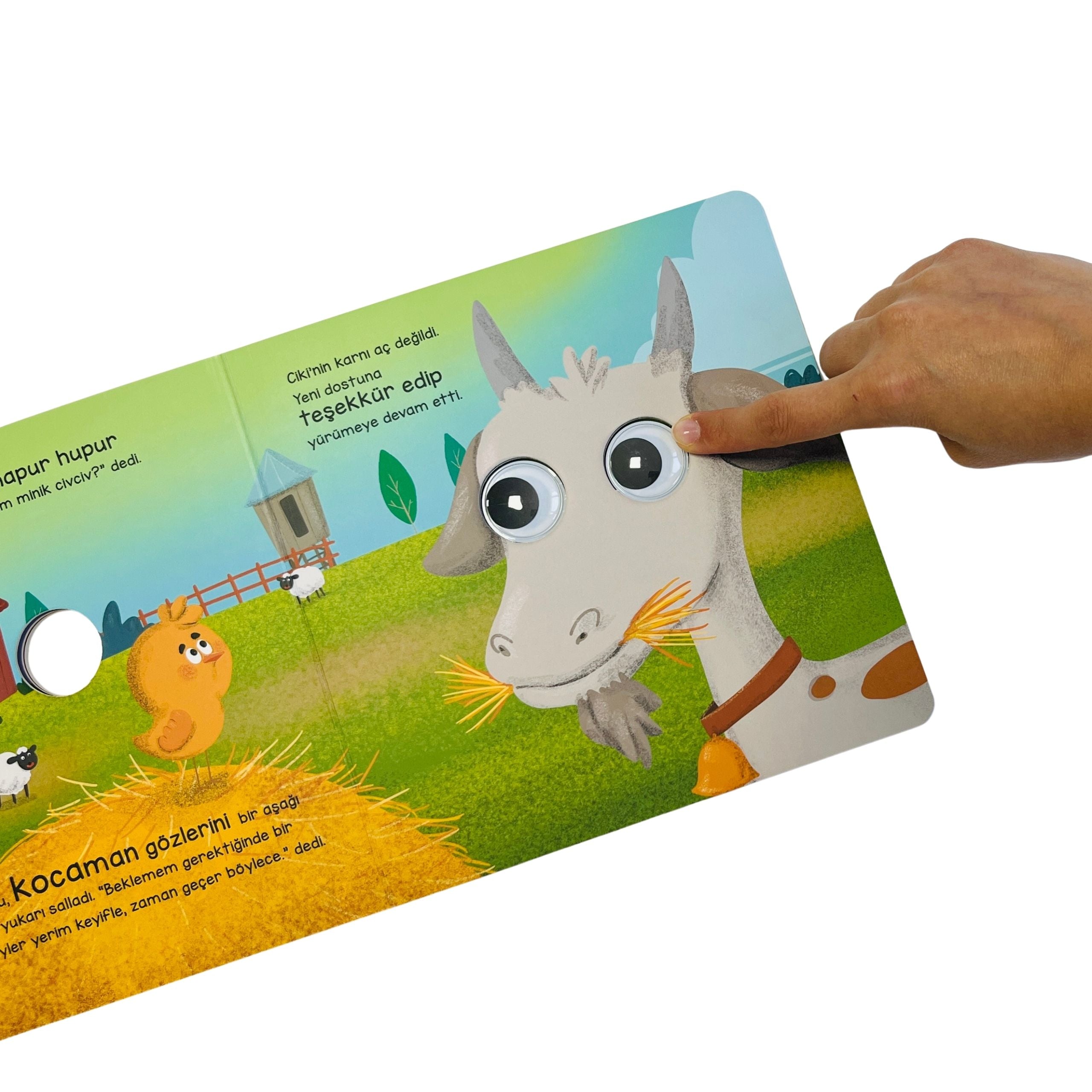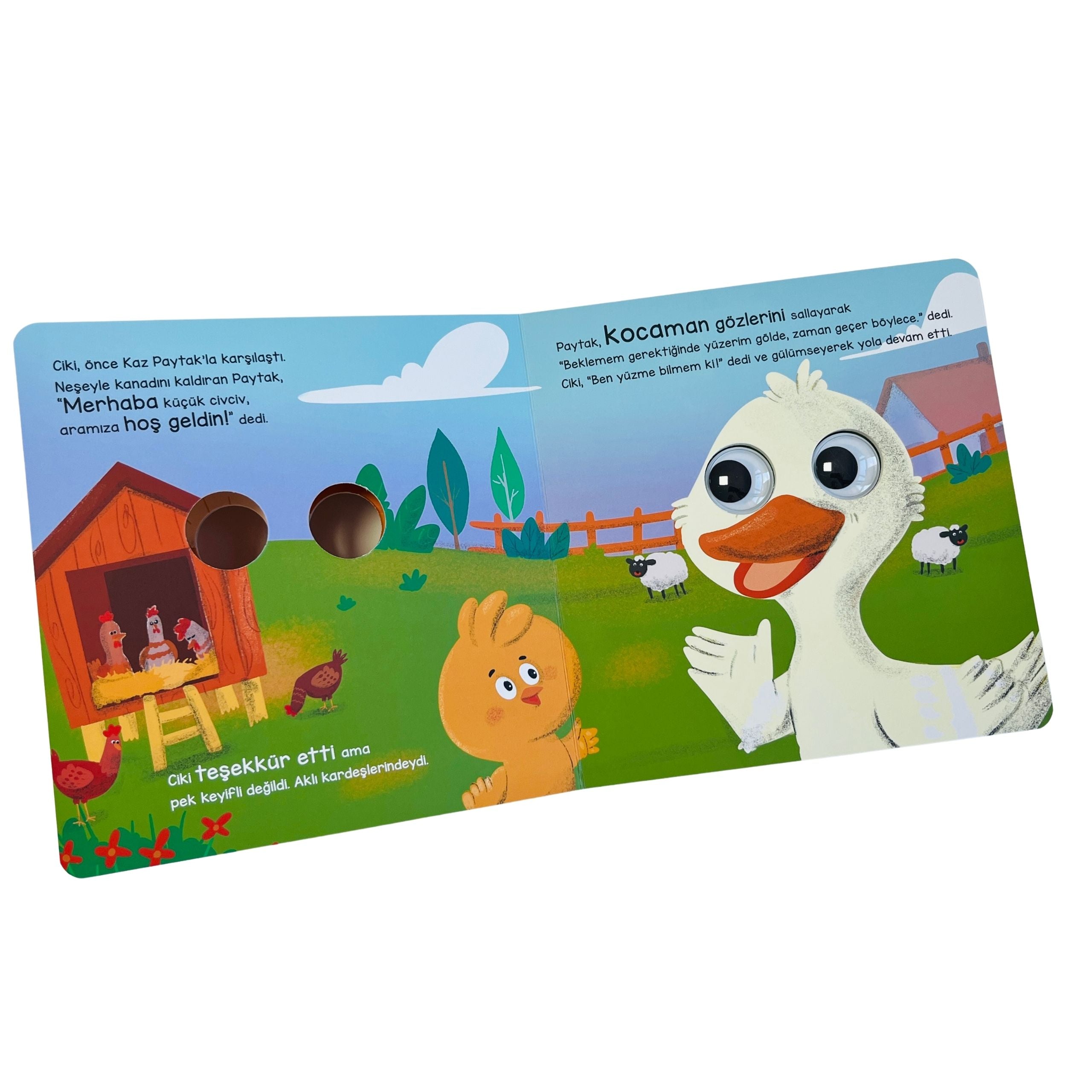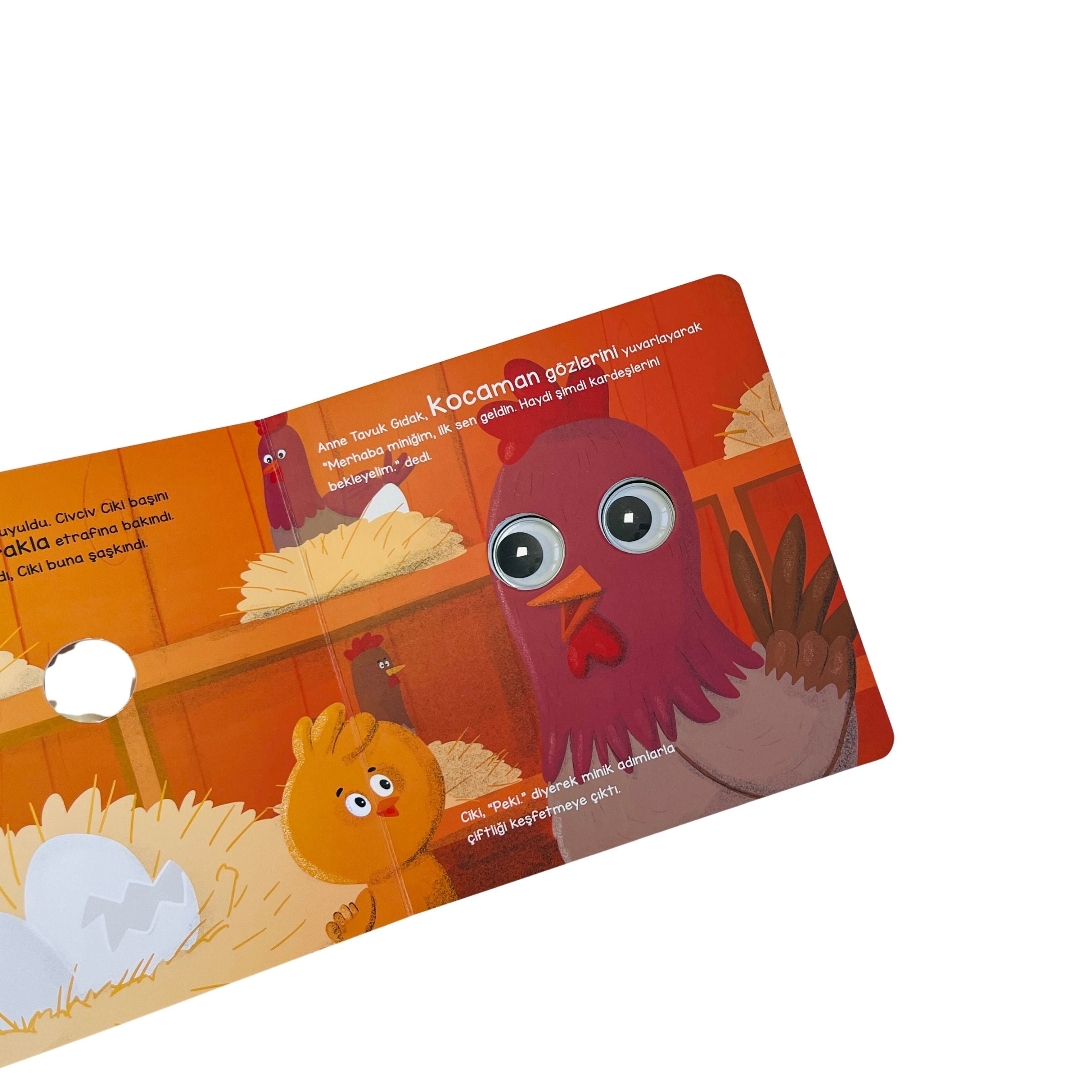 Çiftliğin neşeli dünyasına hoş geldiniz. Bu sevimli hikâye, sabırsız ama meraklı minik bir civciv olan Civciv Ciki 'nin yaşamına kapı aralıyor. Yumurtasından çıkan Ciki, etrafındaki büyük gözlere, renkli karakterlere ve yeni seslere hayran kalarak çiftliği keşfetmeye başlıyor. Ancak Ciki 'nin bir şeyi öğrenmesi gerekiyor; bazen en güzel şeyler için sabretmek gerekir. Kitapta anne Tavuk Gıdak'ın bilge sözleri, Kaz Paytak 'ın sakinliği, Horoz Hürhür'ün enerjisi, Keçi Gudu'nun sevecenliği ve Kaplumbağa Kapki'nin dinginliği Ciki ’ye rehber olur. Çocuklar bu dost canlısı karakterlerle tanışırken sabır, beklemeyi öğrenme, merak etme ve yeni arkadaşlıklar kurma gibi önemli kazanımları eğlenceli bir dille deneyimler. Canlı illüstrasyonlar ve büyük göz detayları, küçük yaş gruplarının dikkatini çekmek üzere özel olarak tasarlanmıştır. Bu kitap yalnızca bir hikâye değil, aynı zamanda duygusal gelişimi destekleyen bir keşif yolculuğudur. Minikler, Ciki ’nin kardeşlerini bekleme sürecini izlerken sabretmenin neden önemli olduğunu oyunla öğrenir. Kalın sayfaları sayesinde küçük eller için kolayca tutulabilir ve 12-24 ay aralığındaki çocukların hem bireysel hem de ebeveyn eşliğinde keyifle okuyabileceği bir ilk hikâye kitabıdır. Renkli çizimler ve tekrarlayan ifadeler dil gelişimini de destekler.