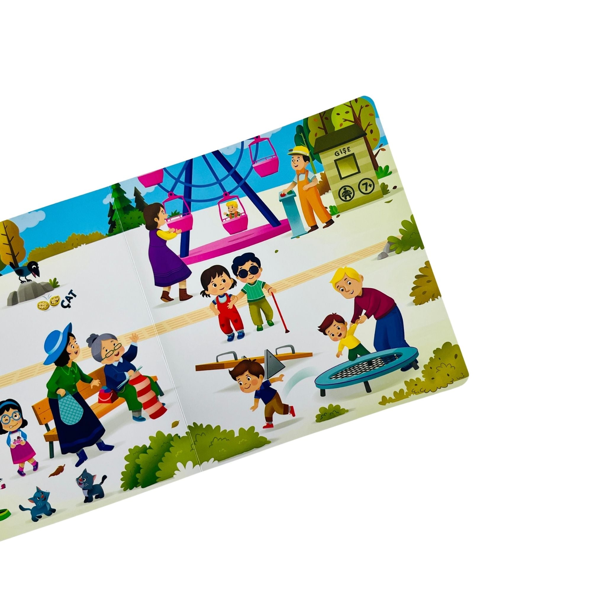 Haydi Parka, çocukların yalnızca resimlere bakarak kendi hikâyelerini anlatabilecekleri, yaratıcılıklarını özgürce kullanabilecekleri özel bir sessiz kitaptır. Parkta geçen bir günün renkli atmosferini yansıtan kitap, yazısız anlatımı sayesinde her çocuğa kendi hayal dünyasında yeni bir macera kurma fırsatı sunar. Kitaptaki sahneler; paylaşma, empati, sıra bekleme, yardımlaşma, selamlaşma ve sabır gibi yaşam değerlerini doğal bir akış içinde çocuklara aktarır. Sayfalarda yer alan her küçük detay, çocukların dikkatini geliştirmeyi ve görsel okuma becerisini güçlendirmeyi hedefler. Sessiz Kitap formatının en önemli özelliklerinden biri, çocuğun gözlem yaparak kendi cümlelerini oluşturmasıdır. Kitabın sonunda bulunan QR kod ve zarf içindeki yazar hikâyesi ise minik okurlara farklı bir bakış açısı kazandırarak öğrenme sürecini destekler.