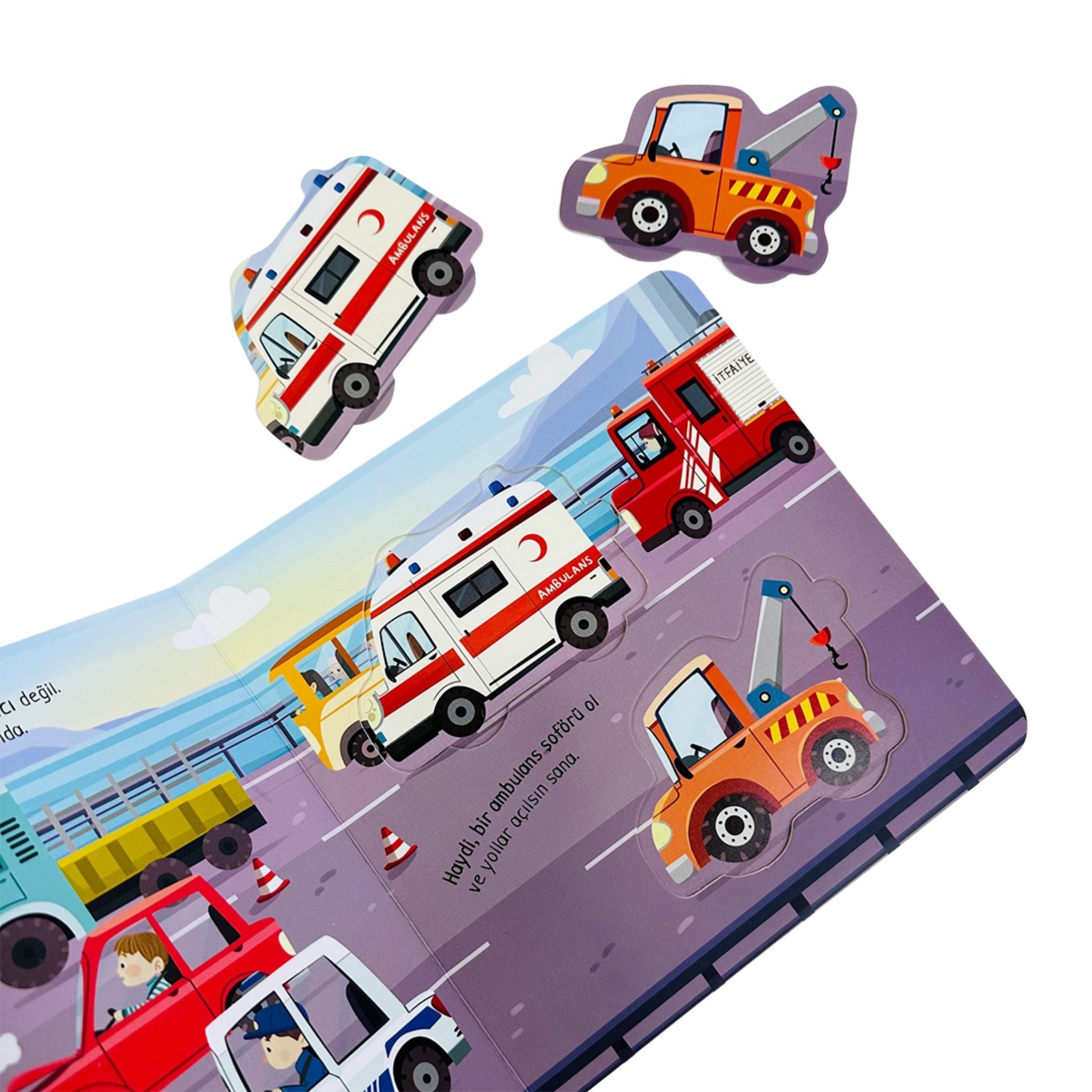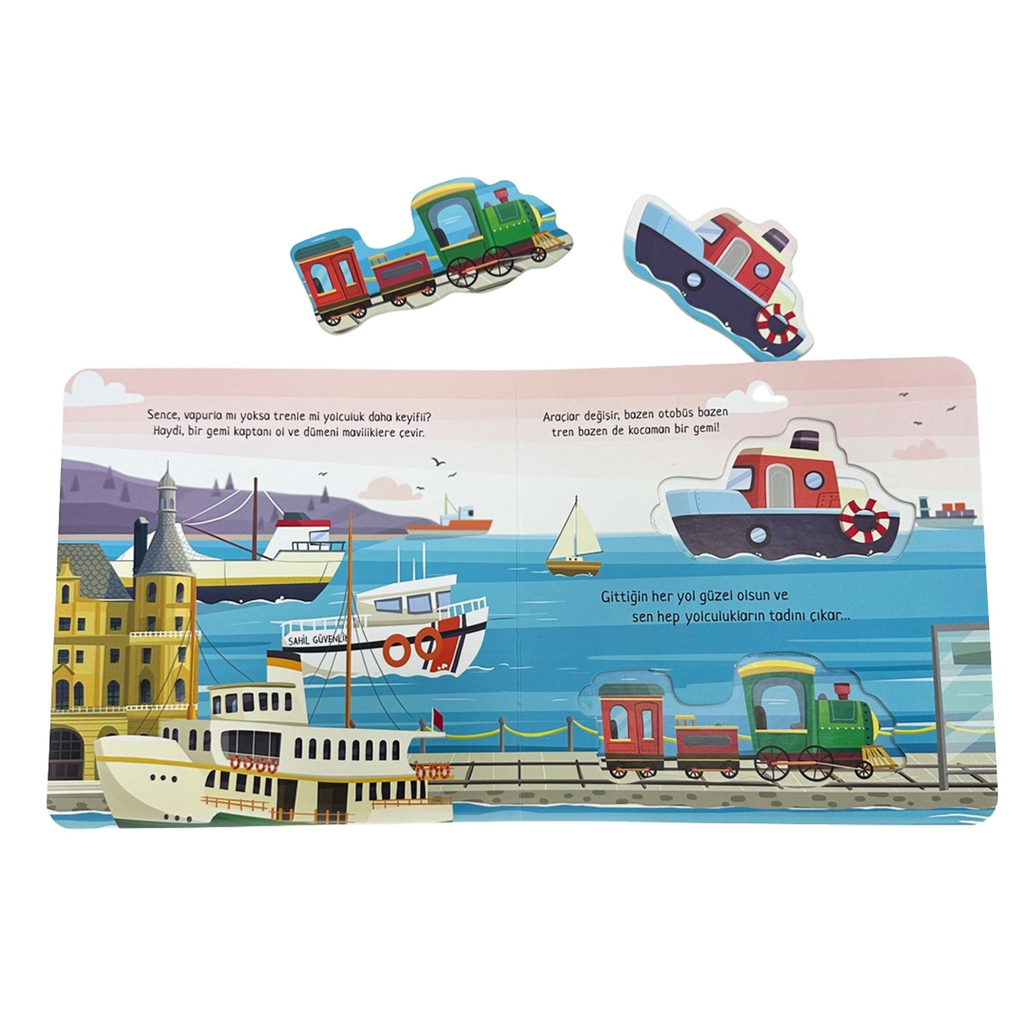 Tadını Çıkar Araçlar, küçük çocukların dünyasına hareket ve keşif duygusunu taşıyan interaktif bir tak-çıkar hikâye kitabıdır. Otobüslerden trenlere, dev gemilerden minik taşıtlara kadar pek çok aracın yer aldığı bu renkli kitap, çocukların hayal gücünü güçlendirmek ve el-göz koordinasyonunu desteklemek amacıyla hazırlanmıştır. Sayfaları çevirdikçe farklı araçlarla karşılaşan minikler, çıkarıp tekrar takabildikleri parçalar sayesinde öğrenme sürecine doğrudan dahil olur. Bu yapısı, kitabı hem eğlenceli bir hikâye hem de gelişim odaklı bir aktivite aracına dönüştürür. Kitap, taşıtları tanıma dönemindeki 0-3 yaş grubu için özel olarak tasarlanmış olup çocukların keşfetme isteğini artıracak sade metinler ve dikkat çekici çizimlerle desteklenmiştir. Kapak ve iç sayfa yapısında kullanılan dayanıklı Bristol malzeme, minik ellerin sık kullanımına uygun sağlamlık sağlar. Kendini kaptan, makinist veya denizci gibi farklı rollerin içinde hayal eden çocuklar, her sayfada yeni bir yolculuğa çıkarak hem eğlenir hem de araçların işlevlerini öğrenir. Tadını Çıkar Araçlar, erken yaş gelişimini destekleyen eğlenceli içerik arayan ebeveynler için ideal bir seçimdir. Okuma saatlerini aktif bir deneyime dönüştürür, çocukların ilgisini sürekli canlı tutar ve yeniden keşfedilebilir bir öğrenme alanı sunar.