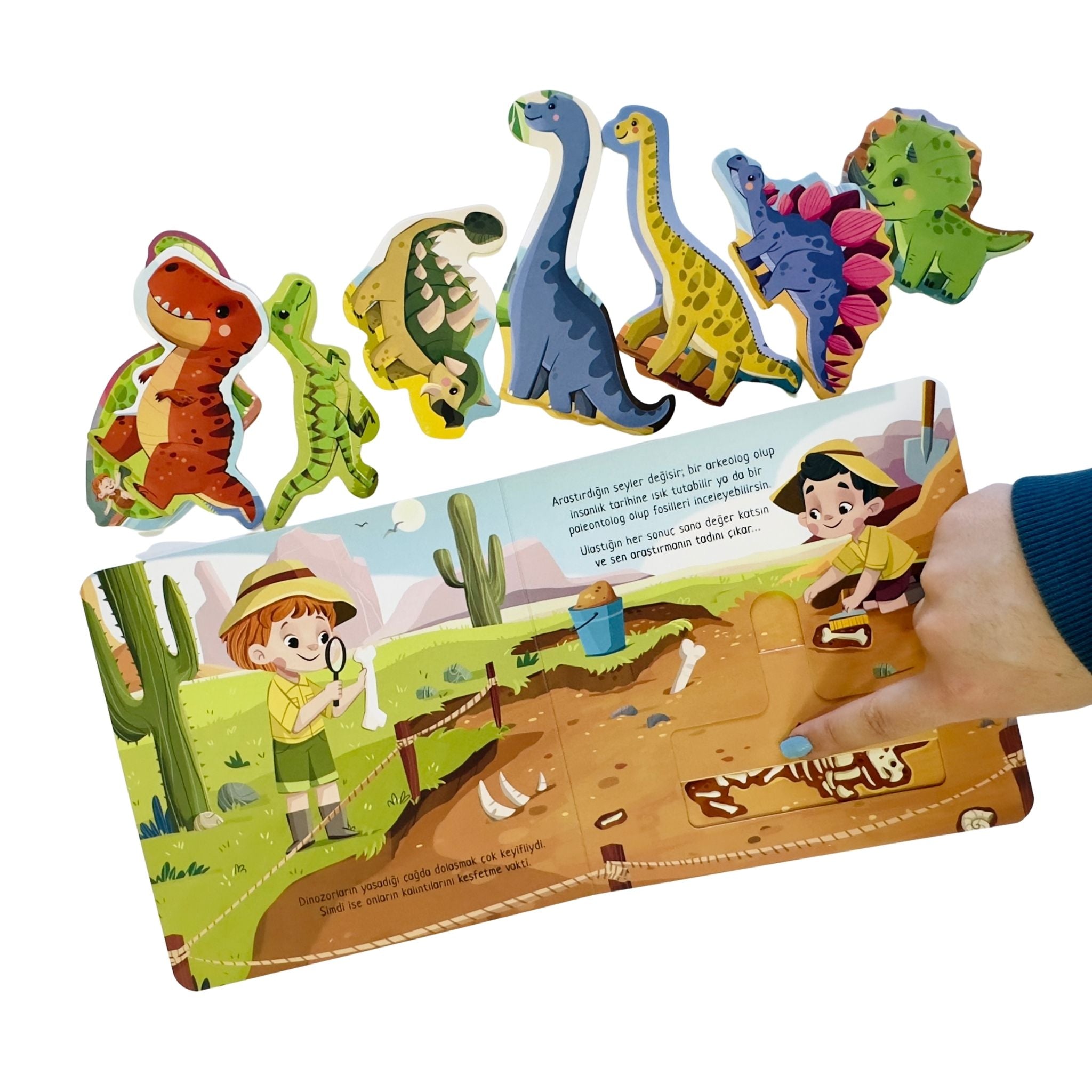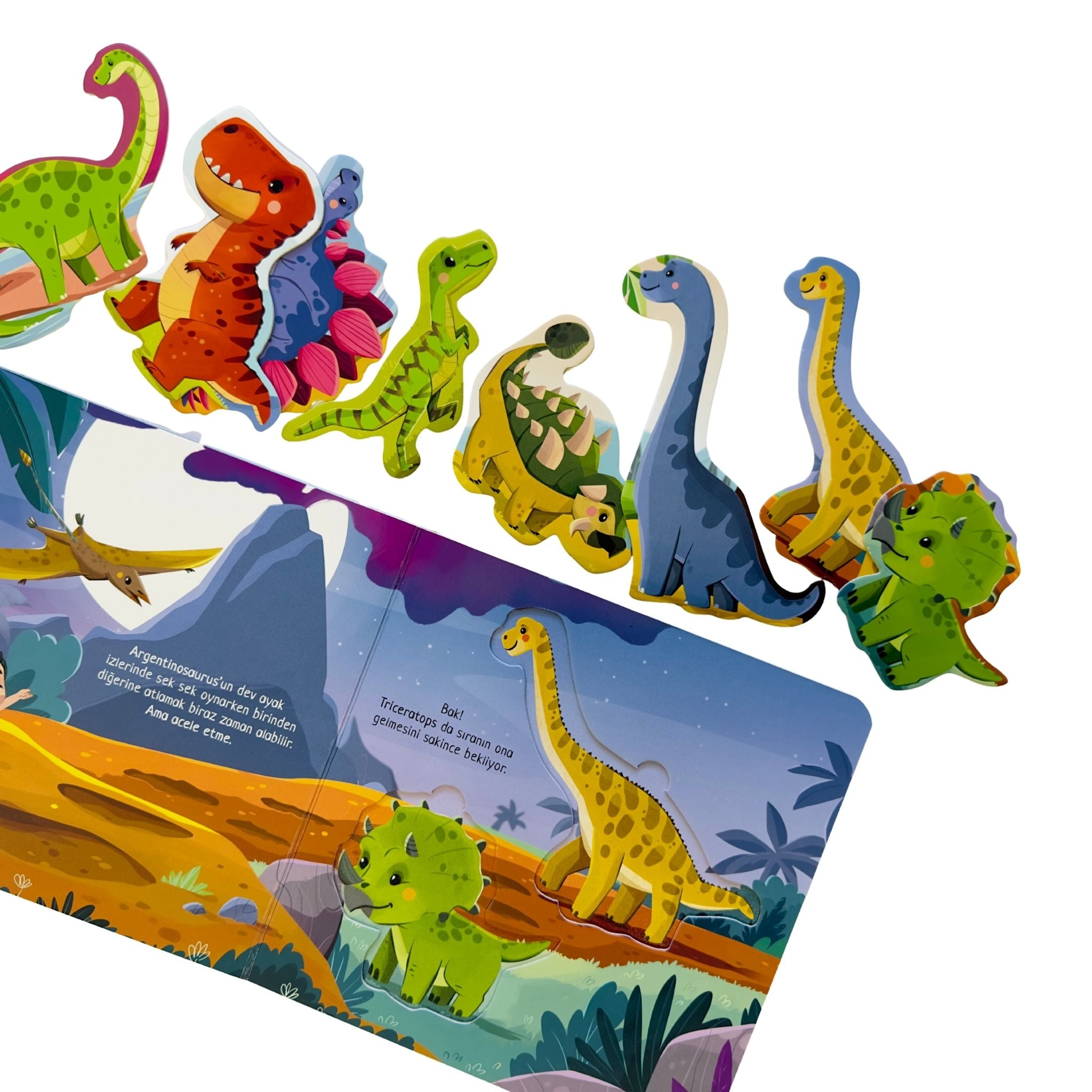 Tadını Çıkar Karşınızda Dinozorlar, minik okurları zamanın çok öncesine, devasa dinozorların hüküm sürdüğü büyüleyici bir dünyaya götüren etkileşimli bir keşif kitabıdır. Çocuklar bu hikâyede yalnızca okuyucu değil, aynı zamanda araştırmacı, kâşif ve keşfin merkezindeki kahraman olurlar. Ankylosaurus ile yarışmak, Argentinosaurus’un kocaman ayak izlerinde adım adım ilerlemek ve bir paleontolog gibi fosil izlerini incelemek onlar için unutulmaz bir deneyime dönüşür. Tak çıkar bölümleri sayesinde çocuklar, sayfaları keşfederken motor becerilerini geliştirir, merak duygularını besler ve hayal güçlerini özgürce kullanır. Renkli çizimler ve sade anlatımıyla bu kitap hem eğlenceli bir okuma hem de öğretici bir öğrenme alanı sunar.