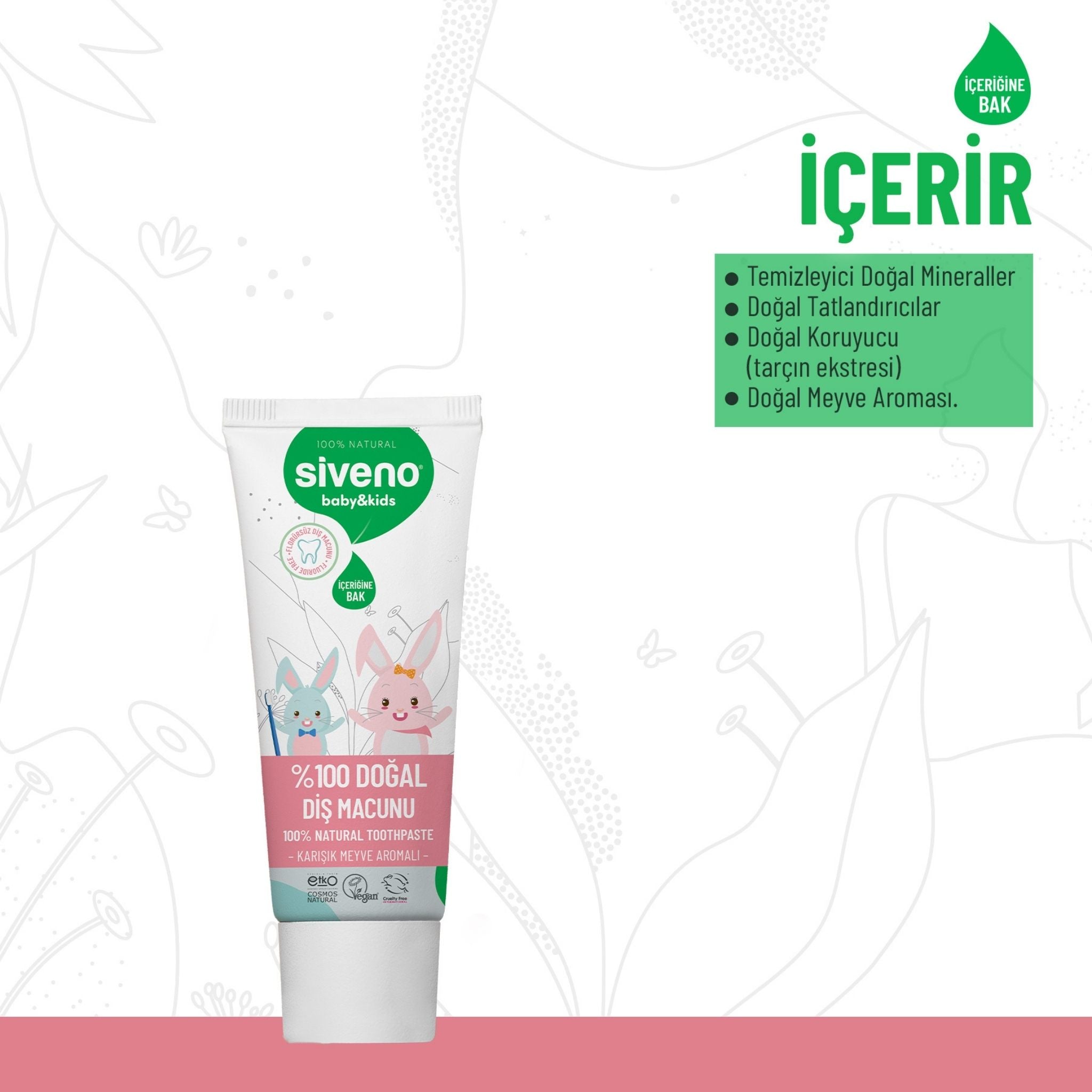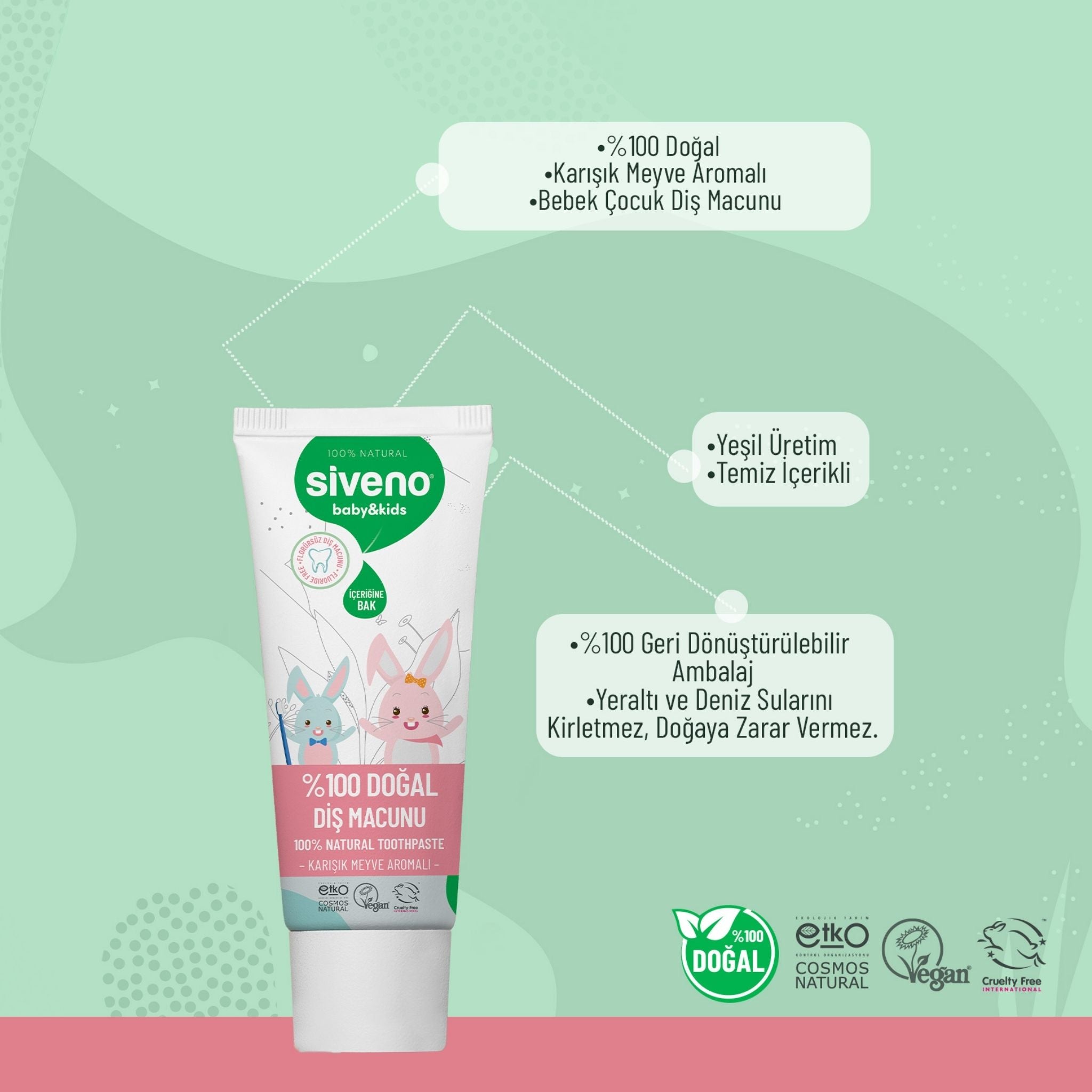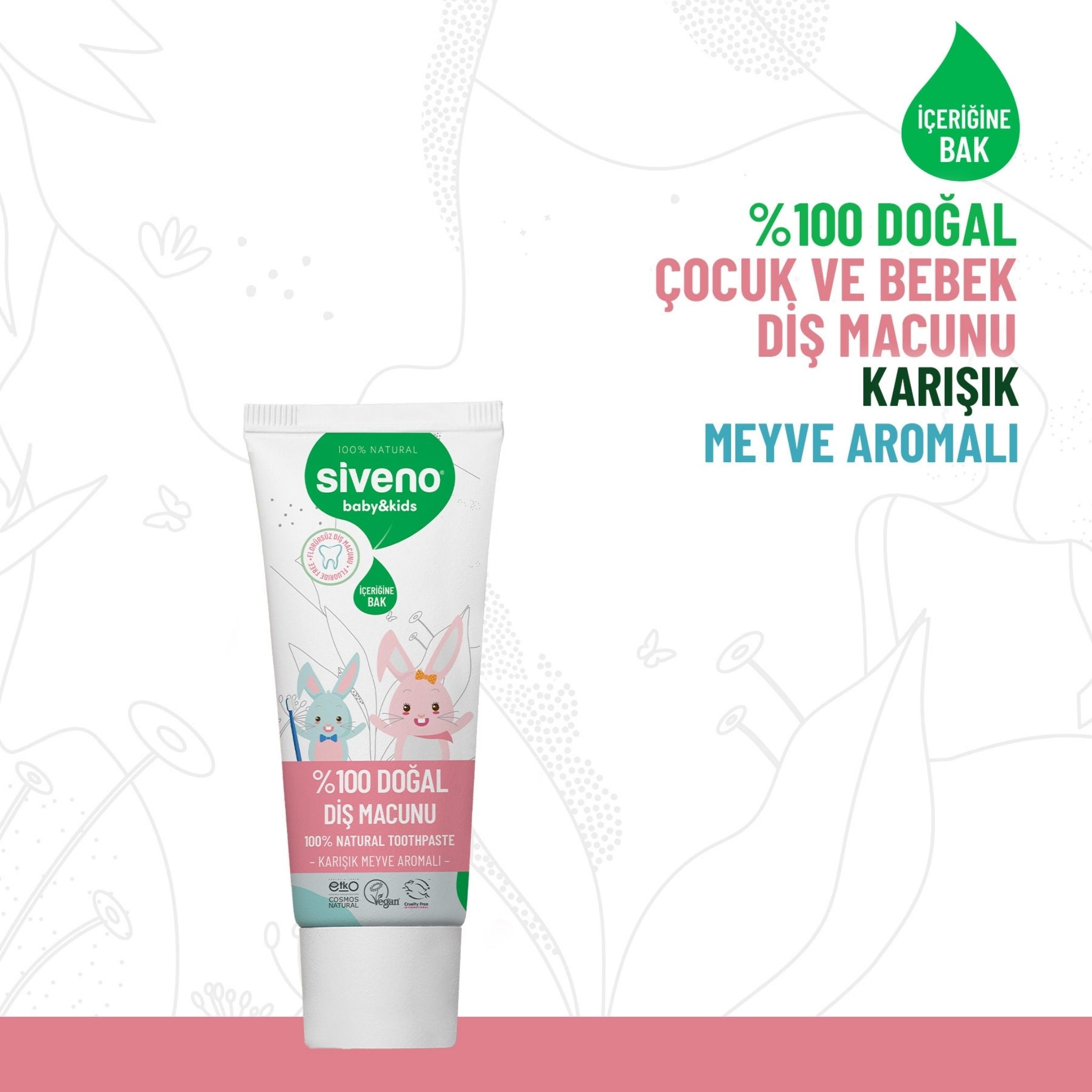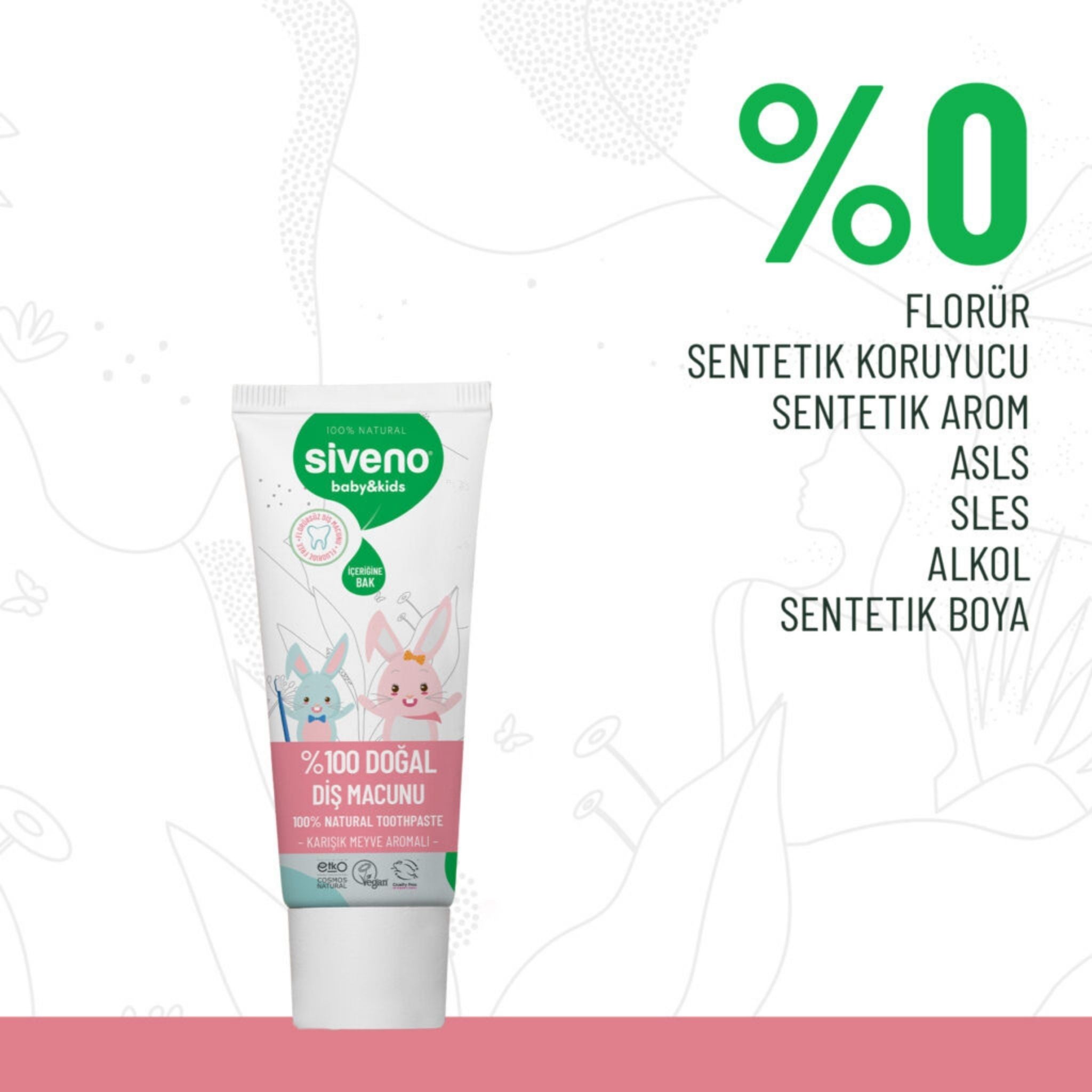 Siveno Doğal Florürsüz Karışık Meyve Bebek & Çocuk Diş Macunu, bebeklerin ve çocukların hassas ağız yapısına özel olarak geliştirilmiştir. Florür içermeyen formülü sayesinde yutulsa bile güvenlidir ve erken yaşta diş fırçalama alışkanlığı kazandırmak için idealdir. Doğal ve bitkisel içerikleri sayesinde dişleri nazikçe temizler, çürük oluşumunu önlemeye yardımcı olur ve sağlıklı bir ağız bakım rutini sunar. Karışık meyve aromasıyla çocuklar için eğlenceli ve lezzetli bir fırçalama deneyimi sağlar. Vegan ve hipoalerjenik formülü dermatolojik olarak test edilmiştir. Siveno’nun yeşil üretim anlayışıyla yer altı sularına, doğaya ve canlılara zarar vermeden üretilmiştir. Güvenli, etkili ve doğayla uyumlu bu ürün, ebeveynlerin gönül rahatlığıyla tercih edebileceği doğal bir diş macunudur.